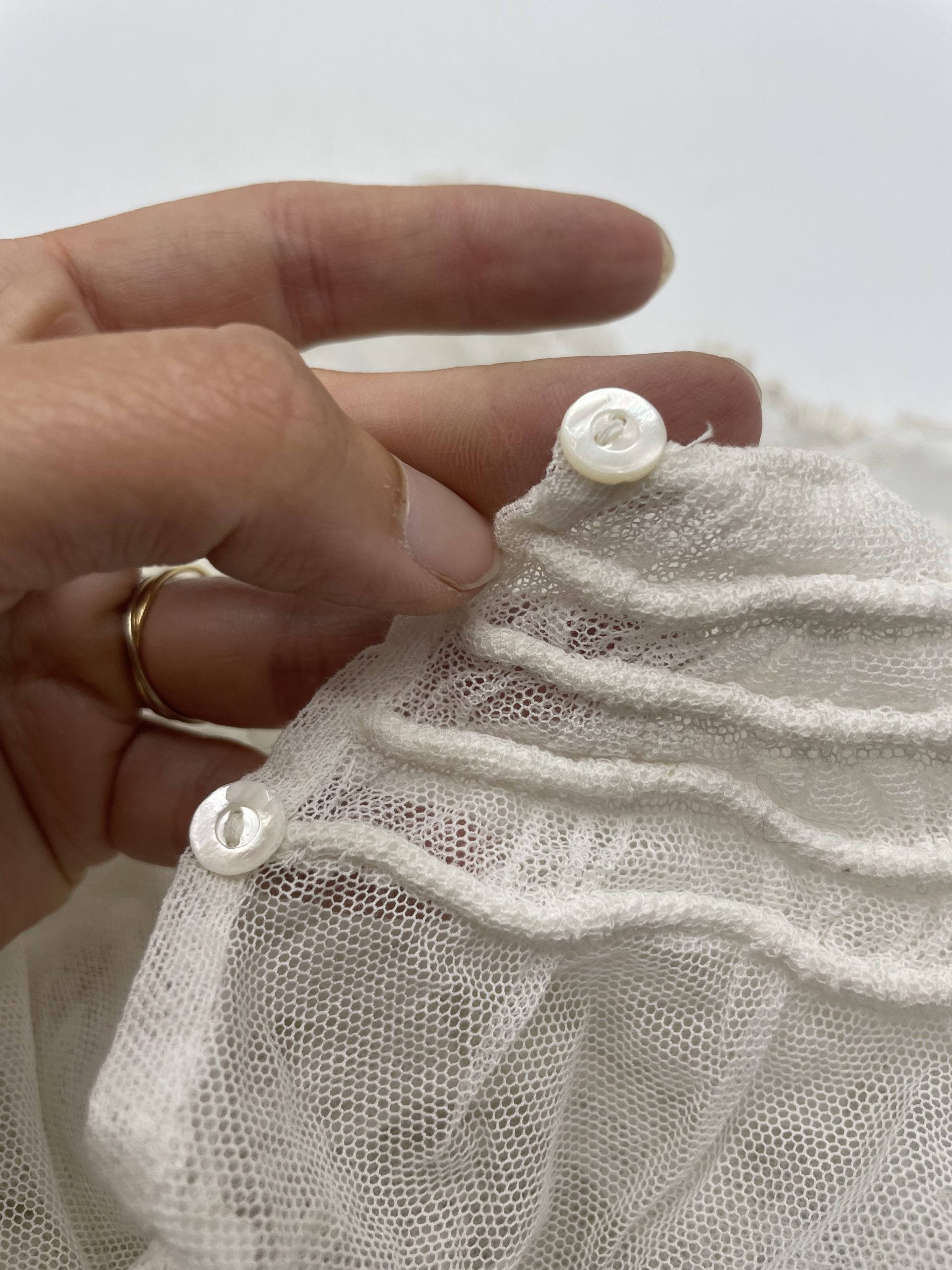 Amoureux de tenues vintage, vous ne pourrez résister au charme de cette petite robe absolument trop mims ! En voile semi transparent la petite robe tunique a 3 ouvertures pour passer la tête et les bras du bébé et se termine en forme trapèze, hyper pratique pour la couche. La robe est décoré de détails en dentelle au niveau du col et au bas de la robe ainsi que d’une petite rose en tissu de couleur rose pâle accrochée au niveau du col. La robe se ferme au niveau du col à l’arrière grâce à deux petits boutons blancs. Vintage, l’attache des boutons est à changer et il y a des petits trous sur le bas de la robe, sûrement mangée par de petites mites. Une jolie tenue hyper vintage parfaite pour un baptême ou un shooting photo !