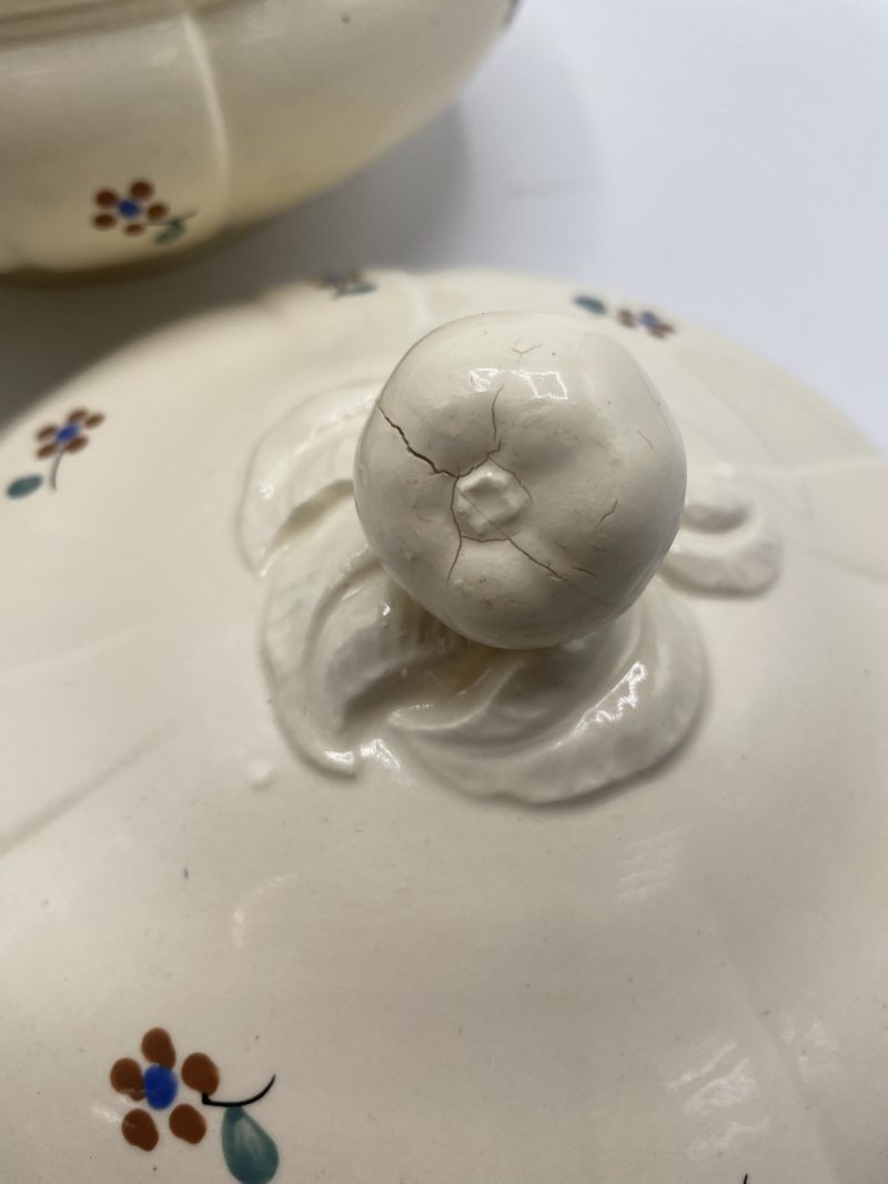 On craque d’amour pour cette jolie petite soupière trop mims! Estampillée Digoin Sarrguemines, la soupière fait partie de la collection Arromanche. D’une jolie couleur crème, la soupière est décorée de petits motifs de fleurs marron, bleues et vertes et la poignée de son couvercle est en forme de poire en relief. Vintage, des traces d’usure sont à prvéoir (cf photos) jolies marques du temps passé. Une peite bonbonnière trop mis qu’on adore !