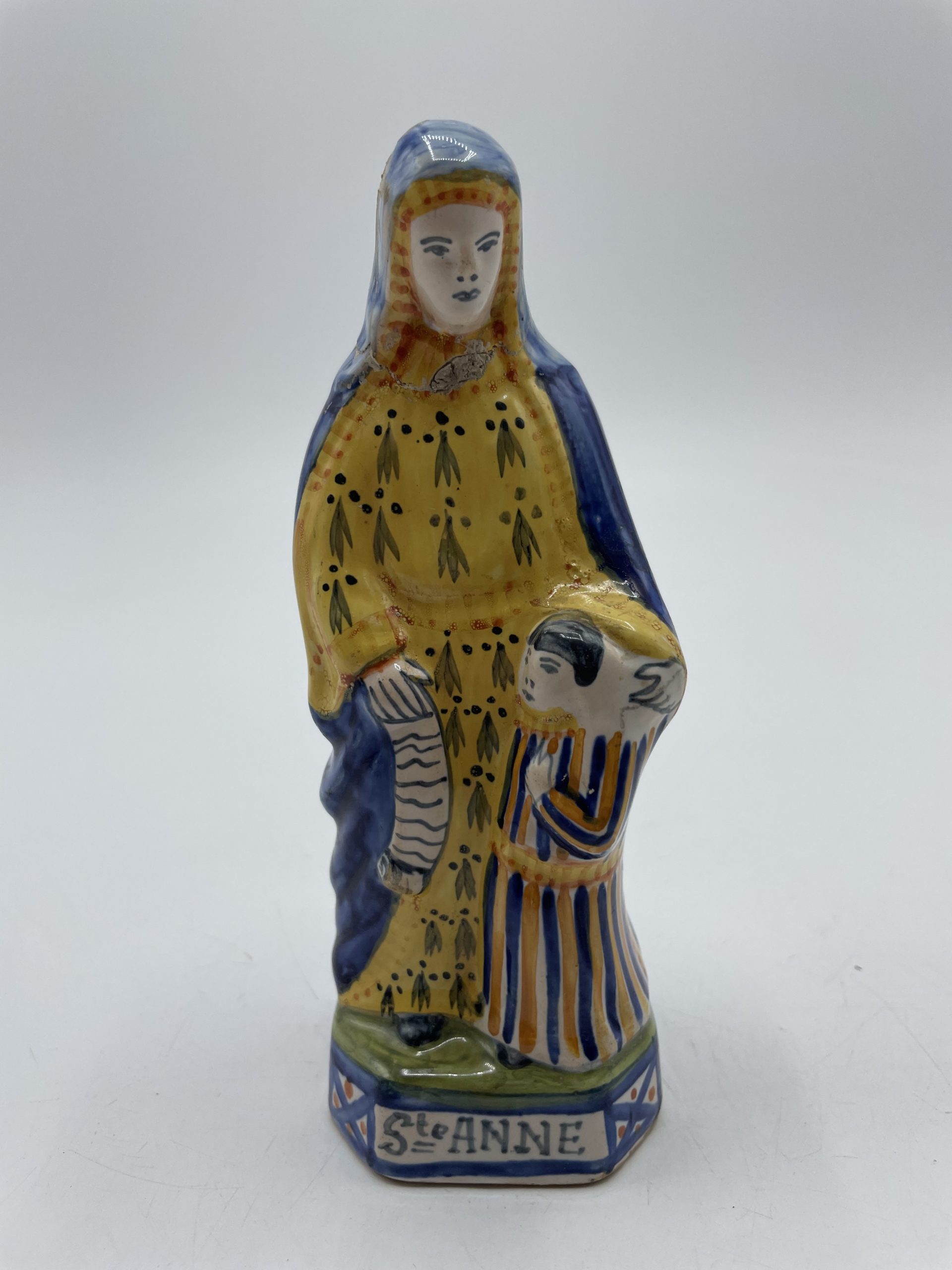 Cette jolie petite statue en faïence représente Sainte Anne qui tient contre sa jambe un enfant. Sainte-Anne est la mère de la Vierge Marie et c’est aussi la sainte patronne de la Bretagne. D’ailleurs, cette statue est signée du célèbre céramiste Henriot Quimper. Peinte de couleur bleue et jaune, la statue est signe en-dessous de sa base et elle est marquée du nombre 79, sûrement l’année de sa création. Vintage, des traces d’usure sont à prévoir et la tête de Sainte Anne a été recollée (cf photos). Un bel objet de dévotion à collectionner !