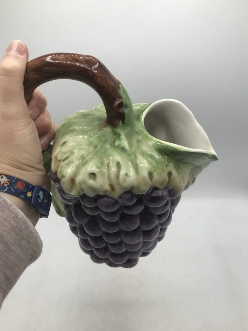 Pichet en barbotine grappe de raisin. Amoureux de la barbotine voici un très charmant pichet. Il est en bon état général pas de casse à signaler (cf photos). Il est fait main et vient du Portugal. Une belle pièce de vaisselle qui donnera le ton à votre service. Il a un diamètre de 13 cm avec une hauteur sans anse de 18 cm et de 24 cm avec anse. Idéal pour servir vos rafraichissements, vos invités vont vous le jalouser. Un style de vaisselle affirmé pour un effet assuré. Sortez des sentiers battus et créer votre propre service de vaisselle. Chineurs de barbotine il vous attend, une belle idée cadeau.