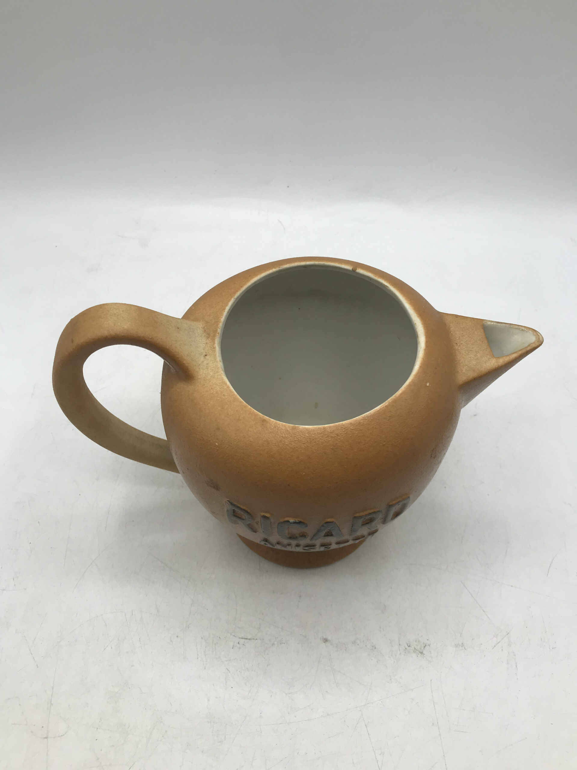Pichet Ricard en grès vintage. Fan de produits dérivés et amoureux de Ricard vous allez tomber sous le charme de ce pichet. De forme ronde avec une texture granuleuse au touché, il trônera au centre de la table avec panache. L’heure de apéritif va bientôt sonner. Il est en bon état général, quelques marques d’usure mais rien de gênant. Un vrai intemporel qui traverse le temps et qui n’a pas fini d’entendre des histoires drôles autour d’une table entre amis. Avis aux amateurs. Ce modèle apporte vraiment une belle touche ancienne avec son aspect au touché et sa couleur.