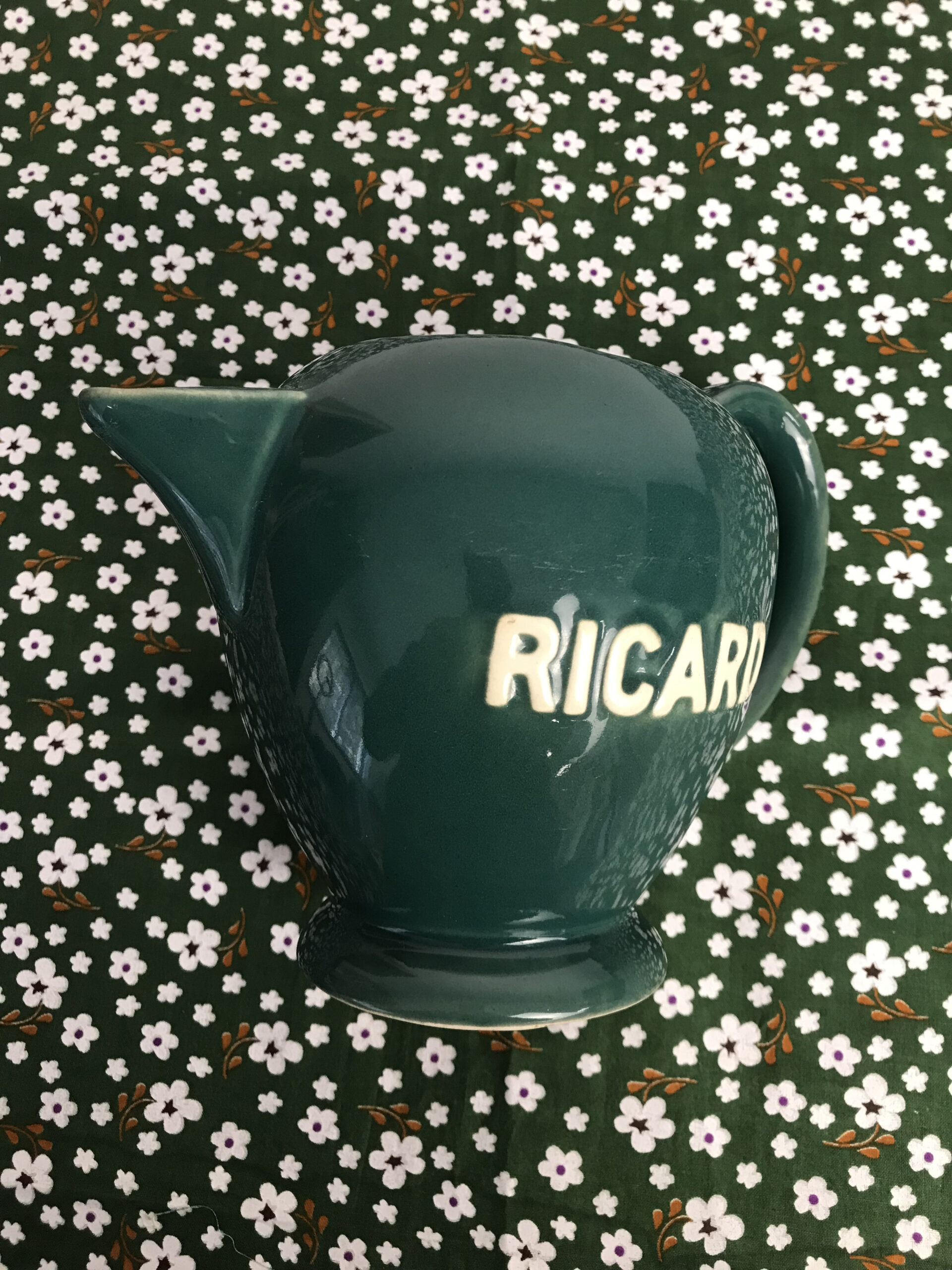 Pichet Ricard Vert vintage. Fan de produits dérivés et amoureux de Ricard vous allez tomber sous le charme de ce pichet. De forme ronde et d’une magnifique teinte verte foncée, il trônera au centre de la table avec panache. L’heure de apéritif va bientôt sonner. Il est en bon état général, quelques marques d’usure mais rien de gênant. Un vrai intemporel qui traverse le temps et qui n’a pas fini d’entendre des histoires drôles autour d’une table entre amis. Avis aux amateurs.