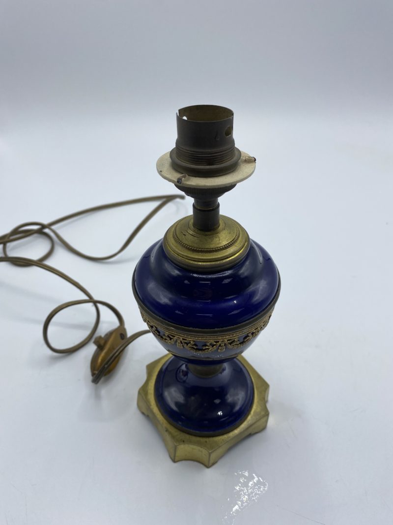 Ce joli pied de lampe vintage et en céramique émaillée et en laiton. D’une jolie couleur bleu cobalt, le pied de lampe a un joli style rétro et il est décoré d’une frise ornementale d’une guirlande dorée. En bon état de fonctionnement, il faudra prévoir une ampoule à baïonnettes pour que la lampe fonctionne. Vintage, des traces d’usure sont à prévoir (cf photos) jolies marques du temps passé. Une jolie lampe pour une ambiance retro et élégante !