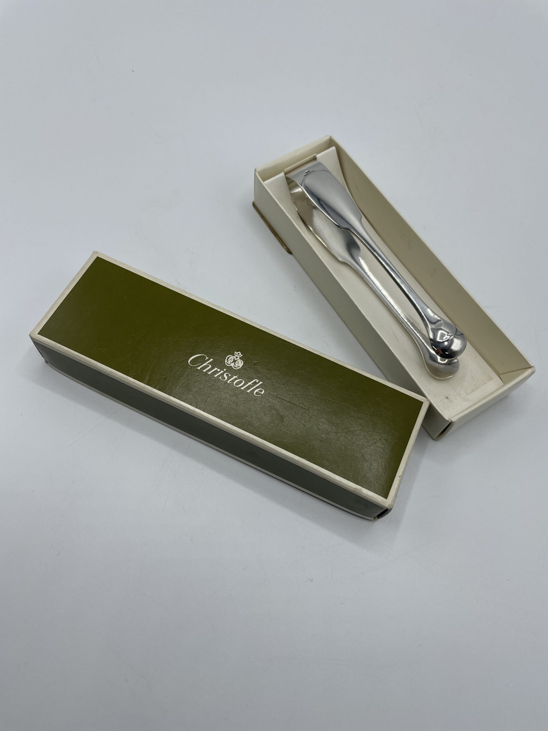De temps en temps on tombe sur ce genre de pépite ! Cette jolie pince à sucre en argent est estampillée et poinçonnée Christofle France. Dans sa boîte d’origine, cette pince à sucre modèle Cluny a un joli style art déco. En très bon état d’origine, cette pince à sucre en métal argenté est magnifique et fera un bel effet pour servir le thé ou le café à vos invités.