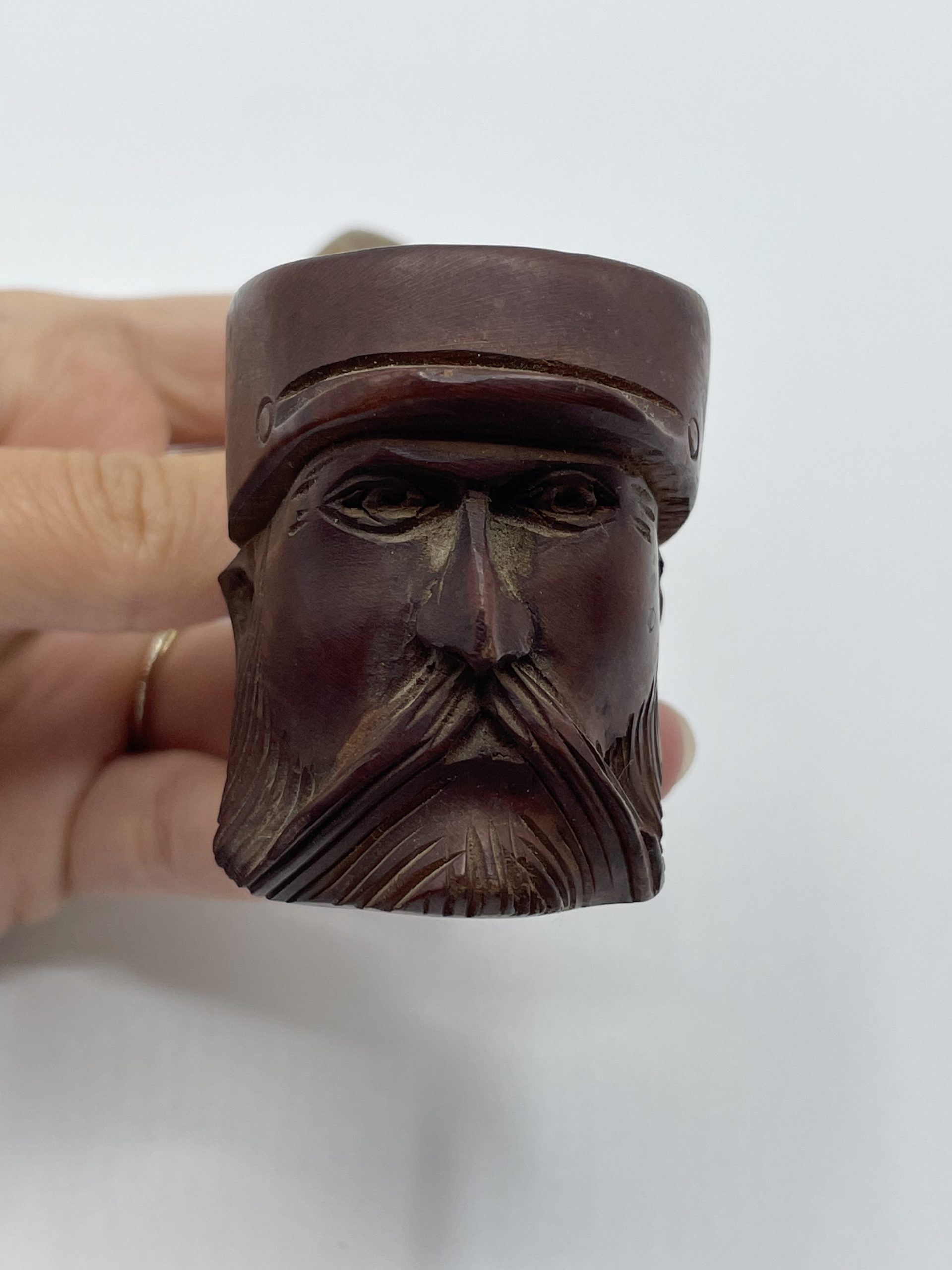 Pipe ancienne vintage en bois de bruyère sculptée militaire ROPPAmoureux de vintage et d’artisanat, cette pipe est faite pour vous ! Signée ROPP , la pipe en bois de bruyère est sculptée pour représenter une tête d’un militaire, sûrement un légionnaire de par sa barbe et sa moustache. En bon état général sans traces de coups ou de dents, la pipe est un objet artisanal et c’est donc un bel objet unique à collectionner pour son usage initial ou comme bel objet déco !