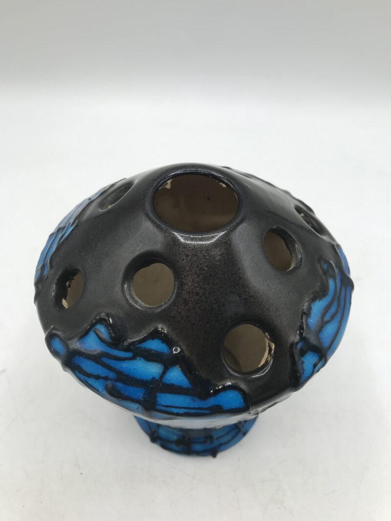 Alerte pépite!!! Plique fleurs Annecy signé Missy. Ce superbe pique fleur vient du potier du lac d’Annecy, il est signé Missy. Très jolie réalisation en céramique. Il est d’une bleu intense recouvert d’un graphisme noir mat. Il à une belle taille, un diamètre de 15 cm pour une hauteur de 17 cm. Un vrai bel objet qui apportera une touche peps à votre déco. Il est dans un état parfait. Une belle pièce signée made in Annecy.