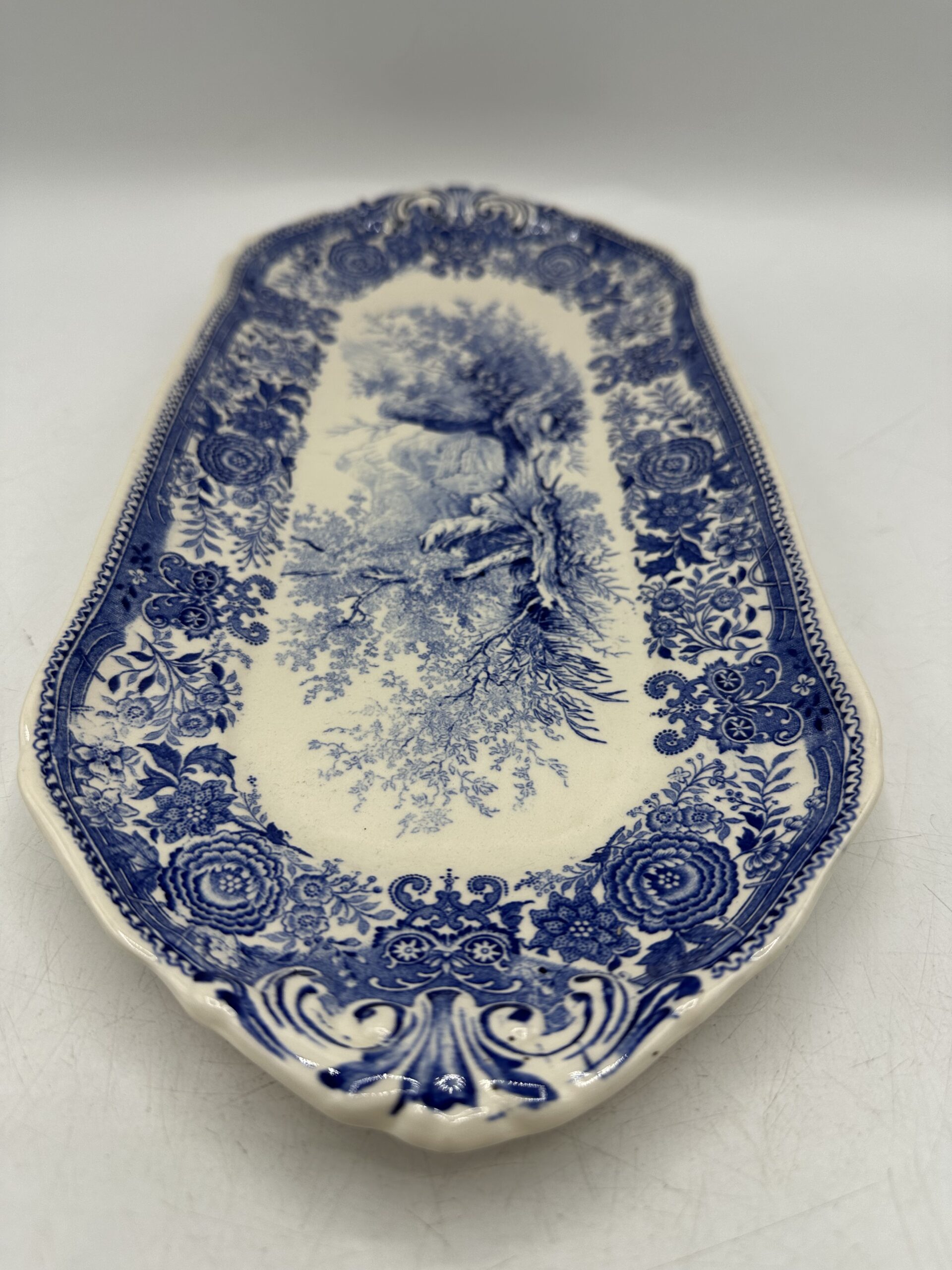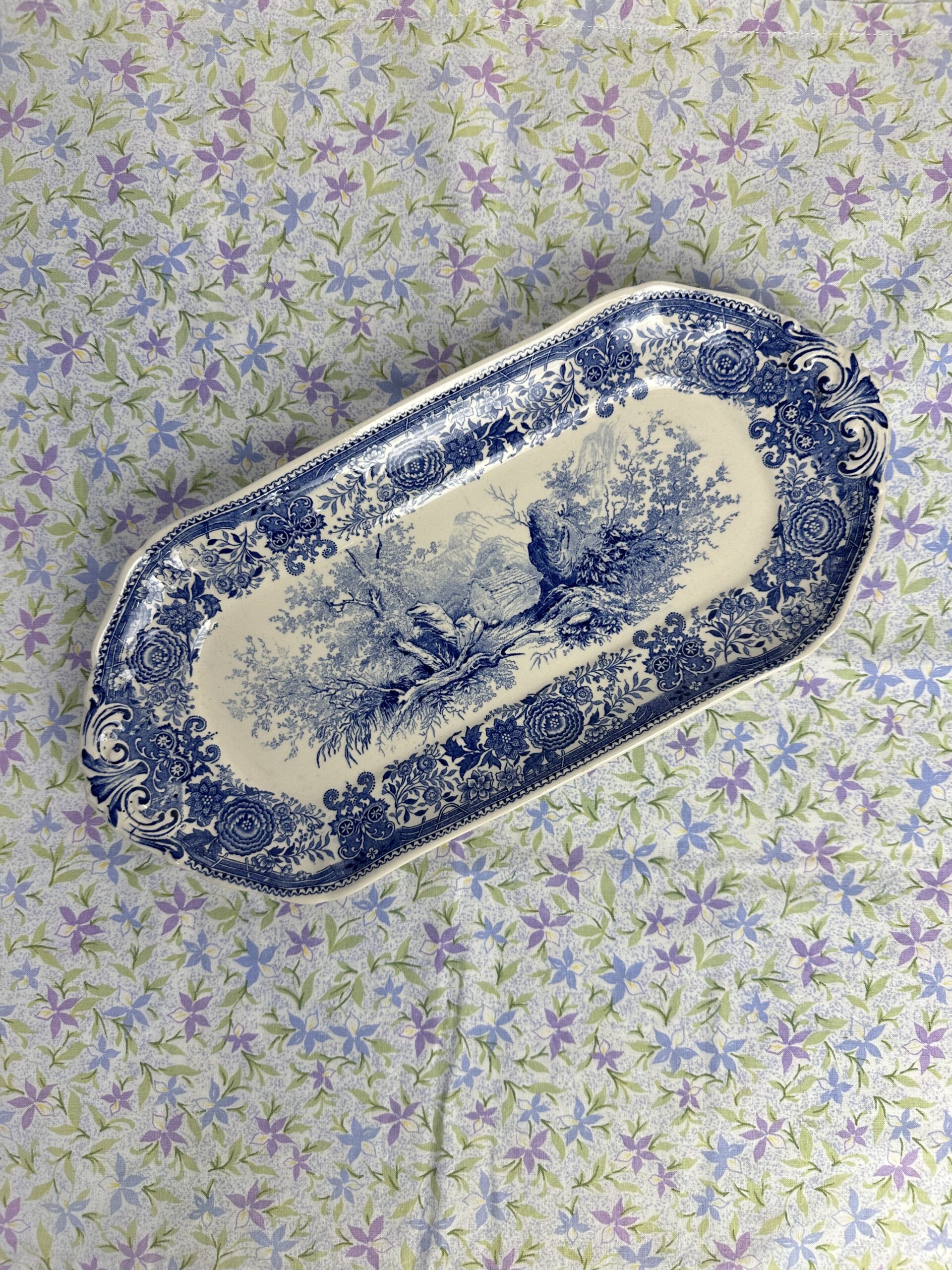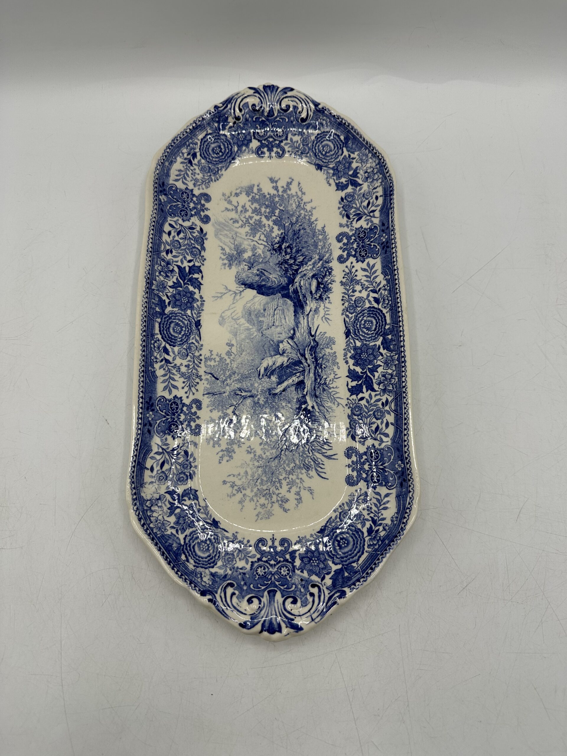 Le décor Burgenland de Villeroy et Boch illustre une scène champêtre bordée de motifs floraux. Son bleu profond sur fond crème lui confère un charme unique, typique de la vaisselle ancienne.