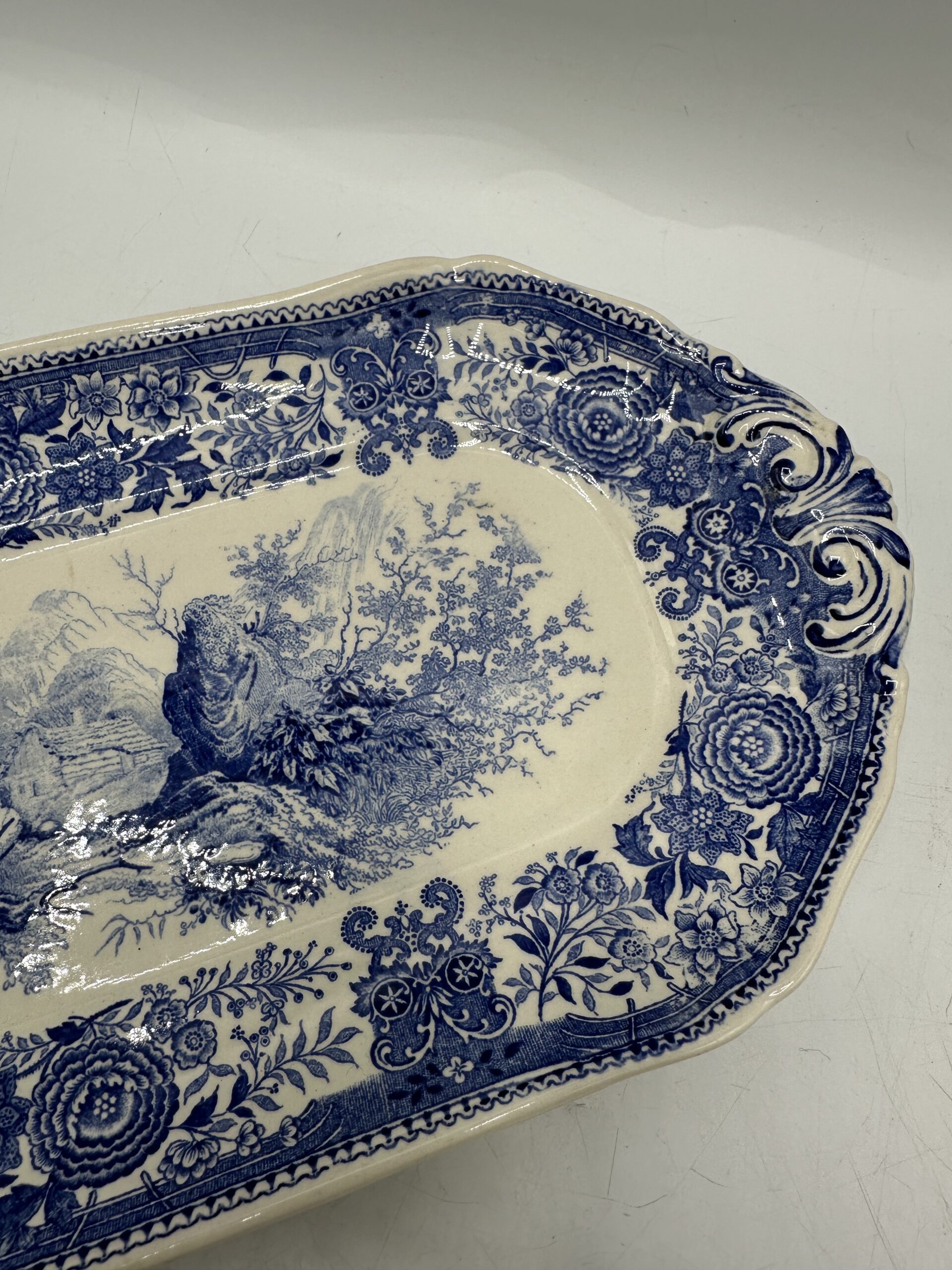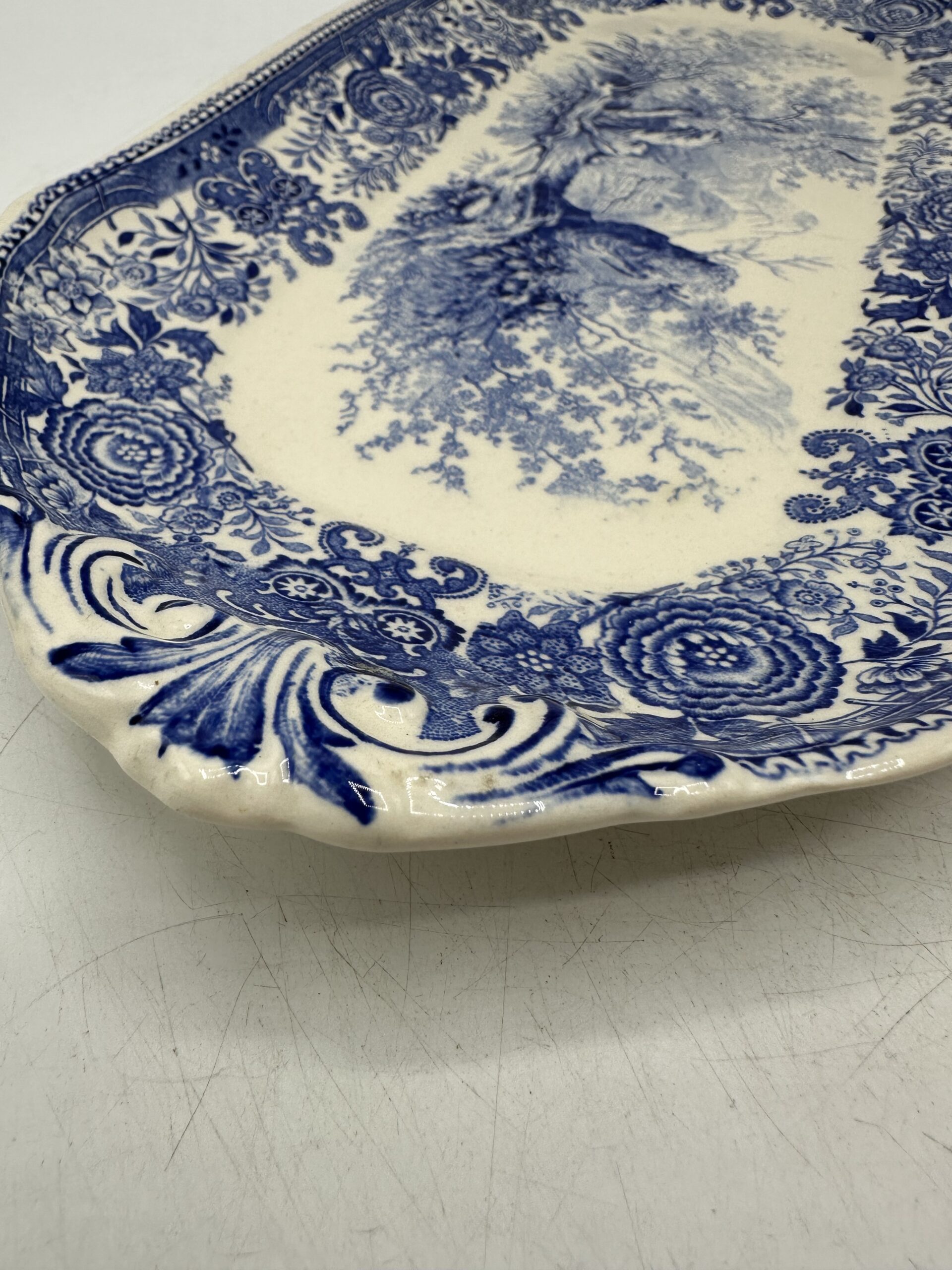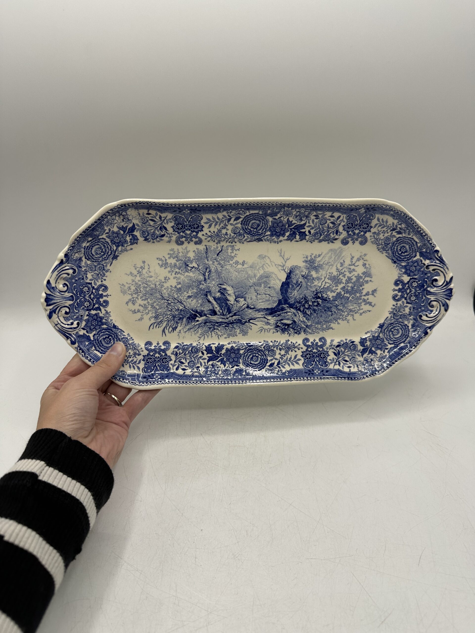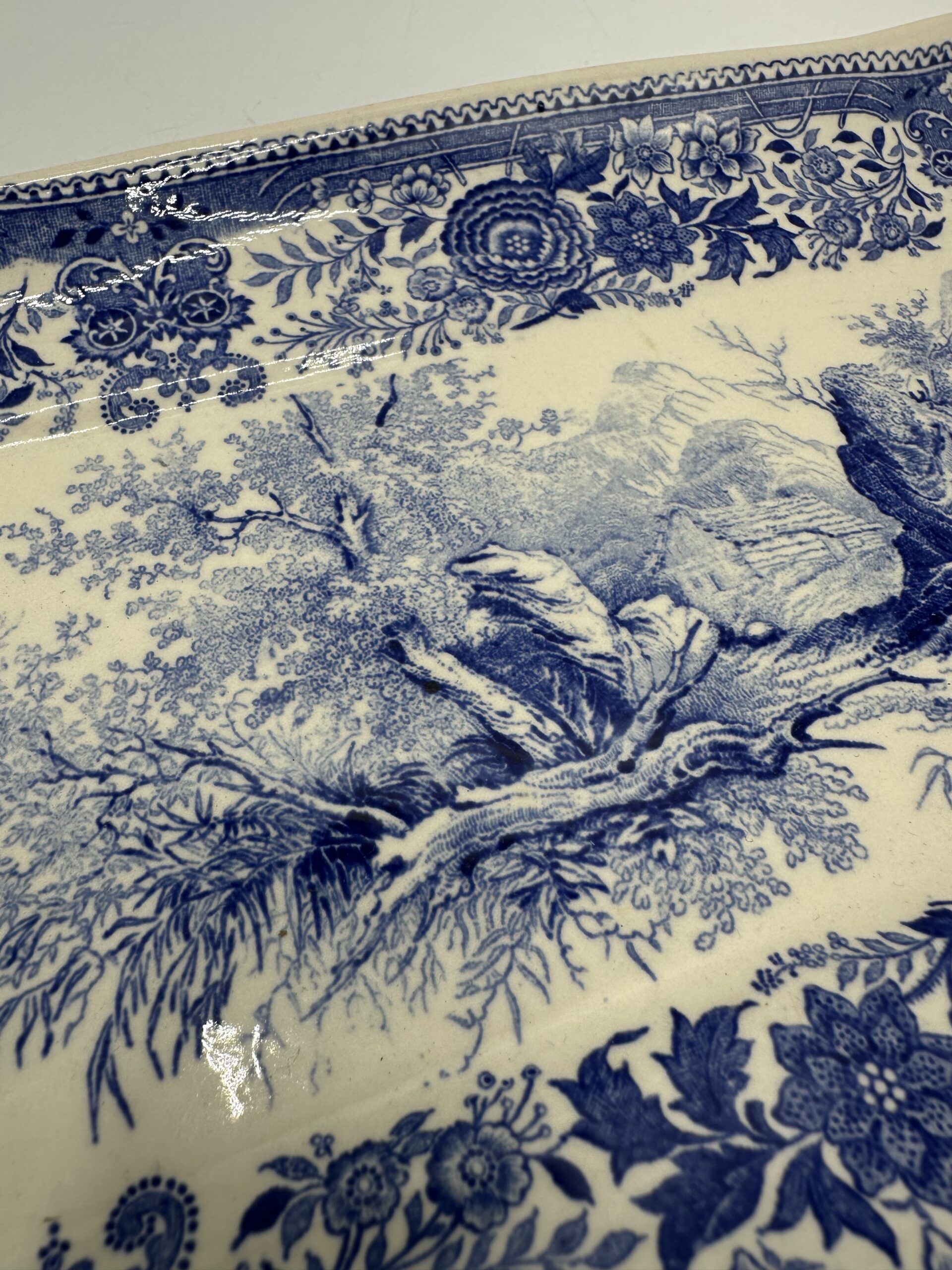 Le décor Burgenland de Villeroy et Boch illustre une scène champêtre bordée de motifs floraux. Son bleu profond sur fond crème lui confère un charme unique, typique de la vaisselle ancienne.