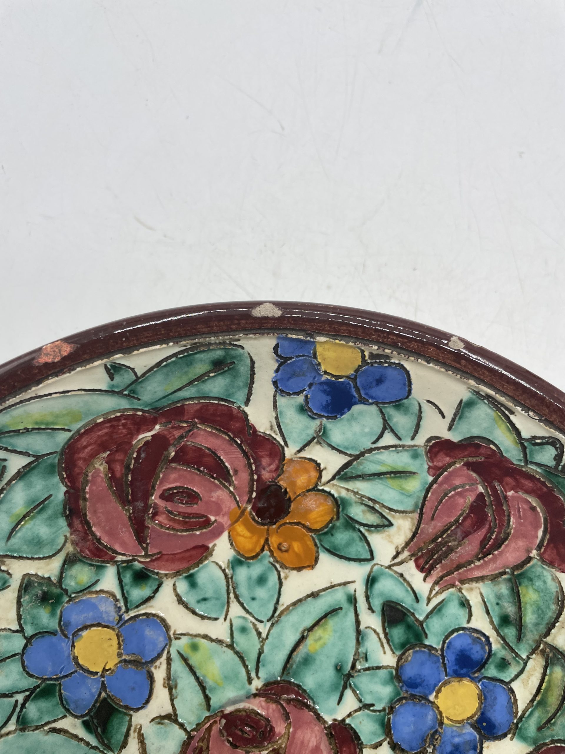 Ce joli plat creux est en terre cuite émaillée. De couleur beige, il est décoré de motifs de fleurs de couleurs rouges, prunes, oranges, jaunes, bleues et vertes et ‘un liseré prune assorti. Signé de la main du potier et du numéro de série 4.297, il s’agit d’une création artisanale et donc d’une pièce unique. Vintage des traces d’usure et des petits éclats sont à prévoir (cf photos) jolies marques du temps passé. Un joli plat parfait comme coupe de fruit ou comme grand vide poche !