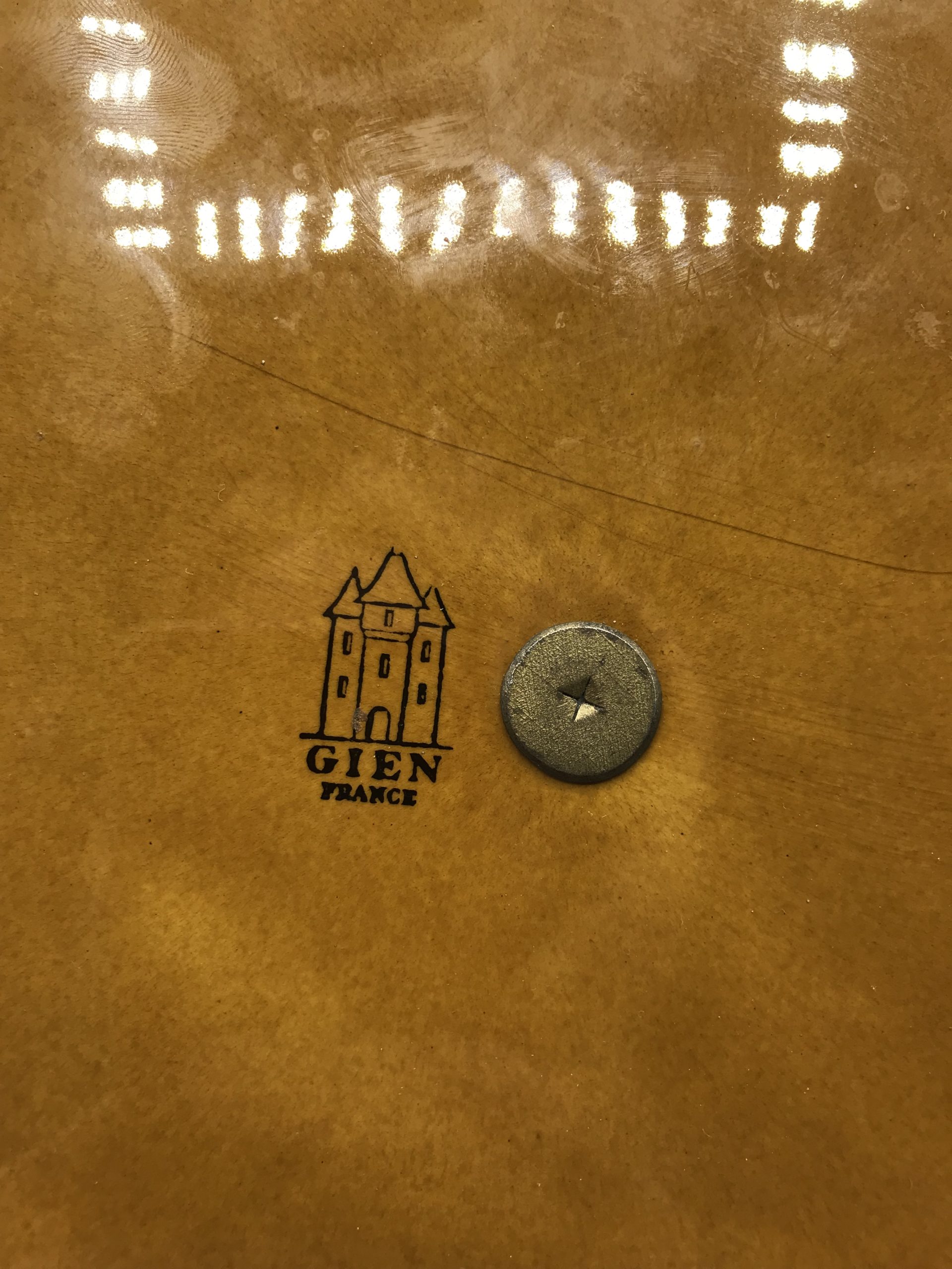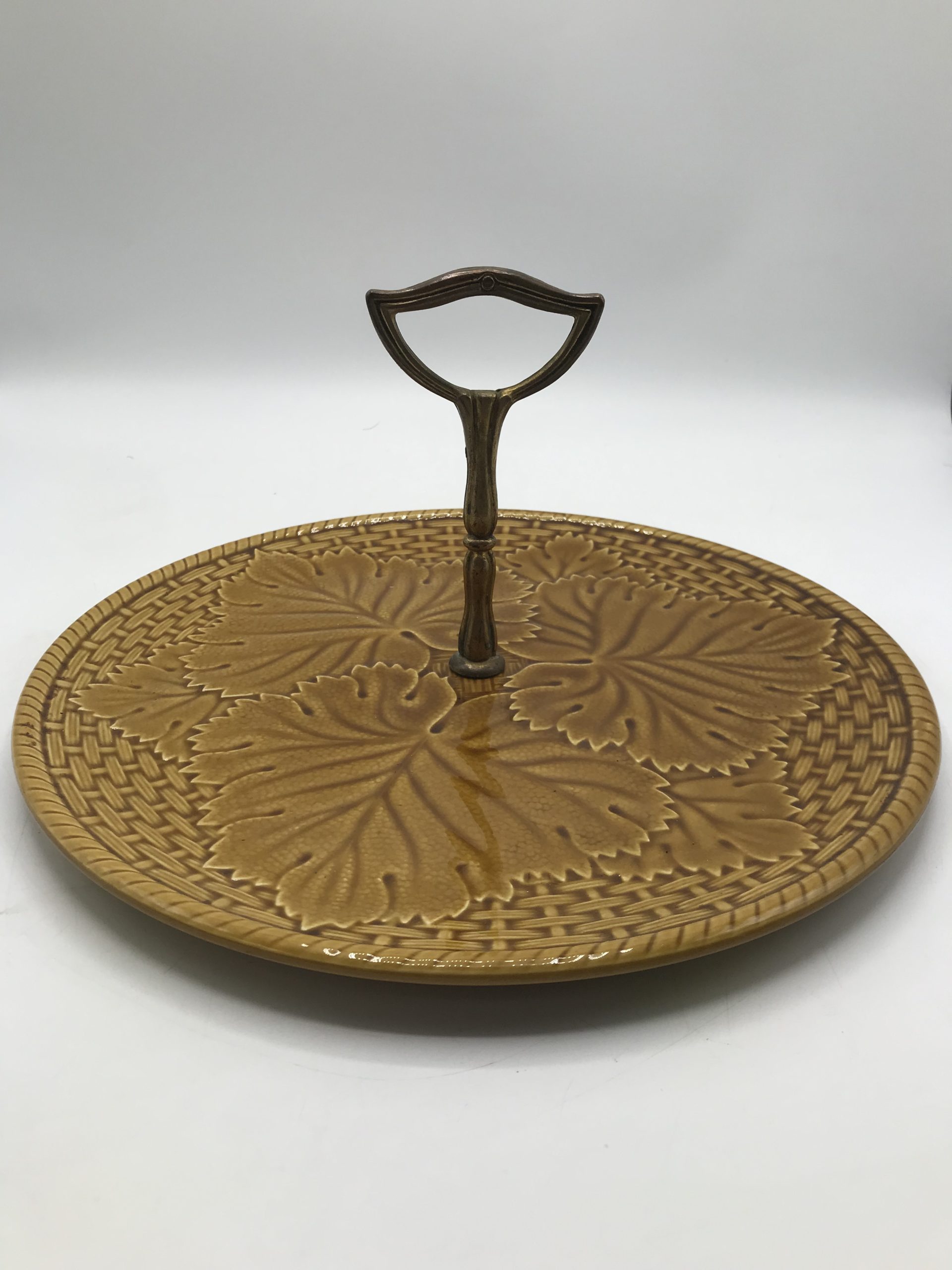 Plateau à fromage jaune-orangé en faïence de gien à décor de feuilles de vigne sur panier tressé. Des années 1960, il est en très bon état. Une belle pièce pour mettre en valeur nos si bons fromages de France.