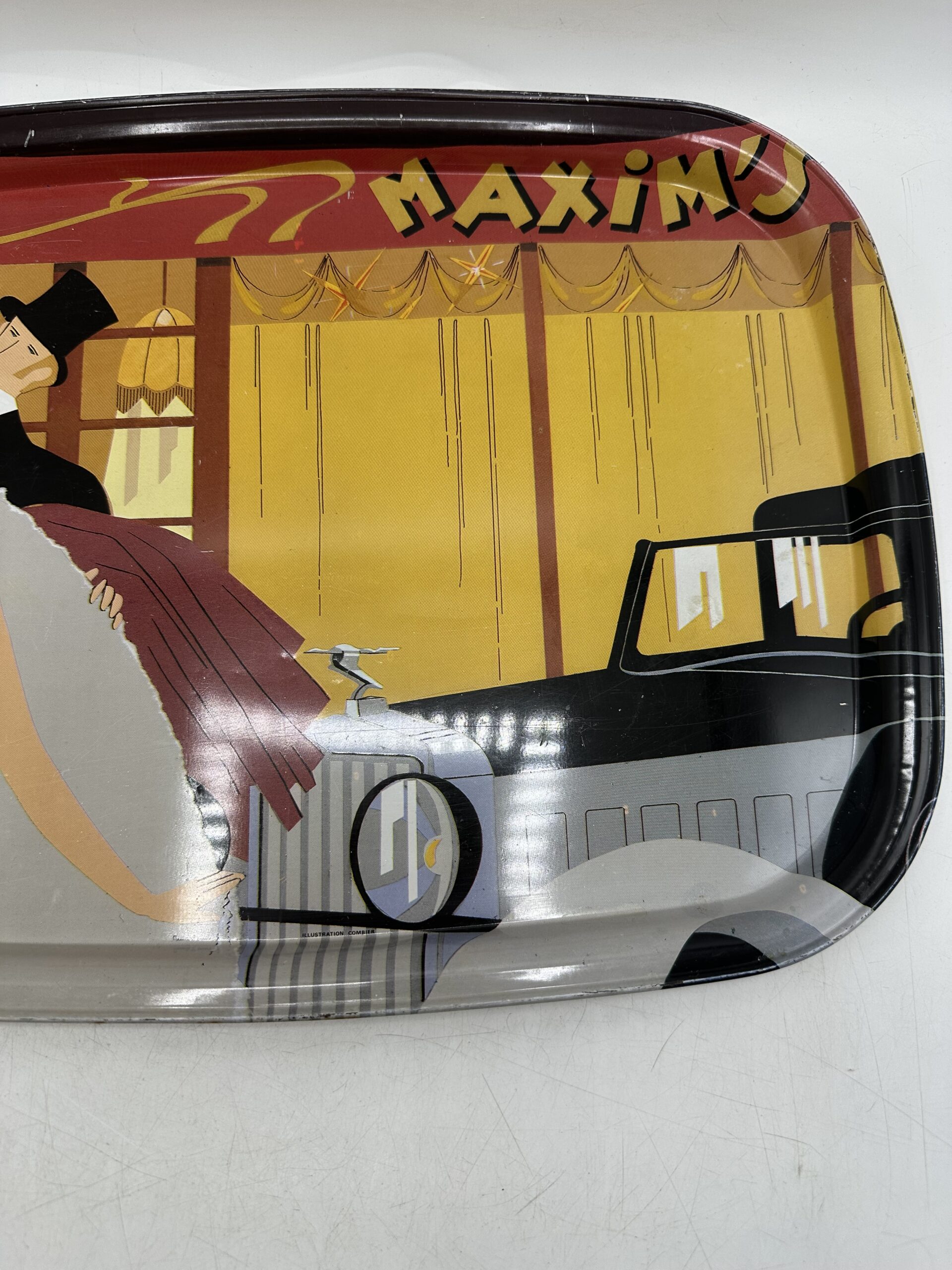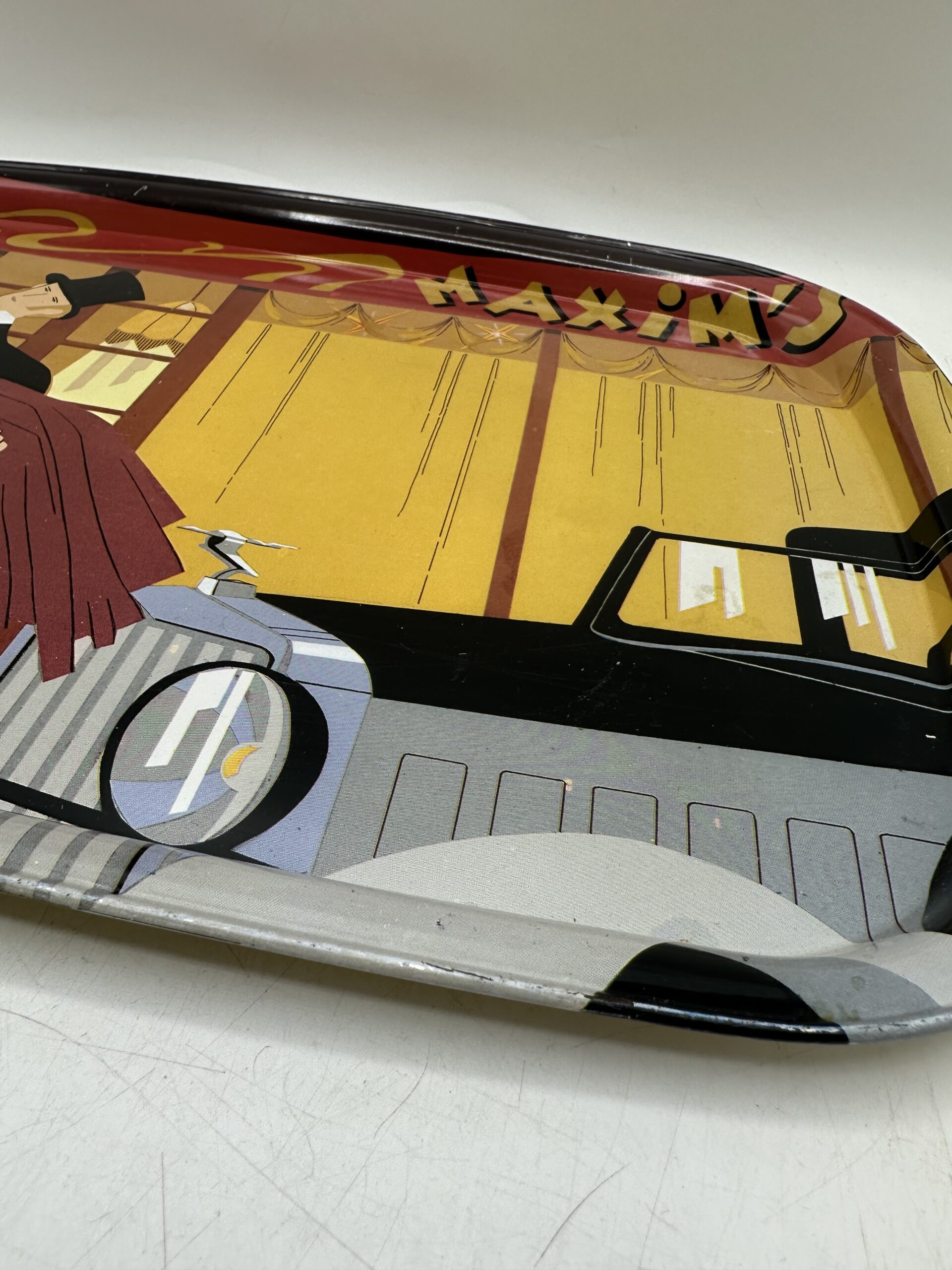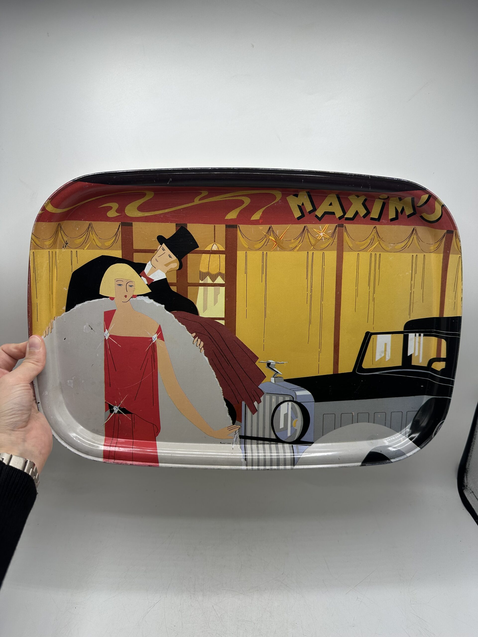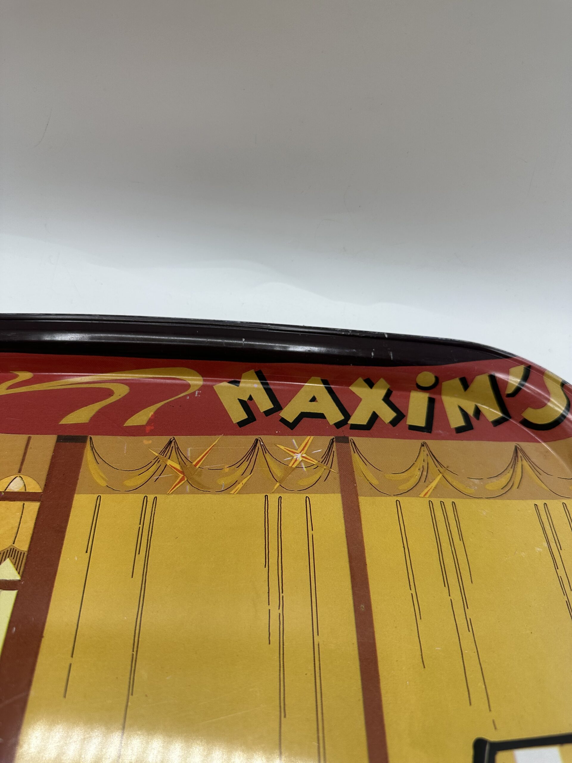 Plateau de type plateau repas en métal avec le dessin et les couleurs typiques Maxim’s.