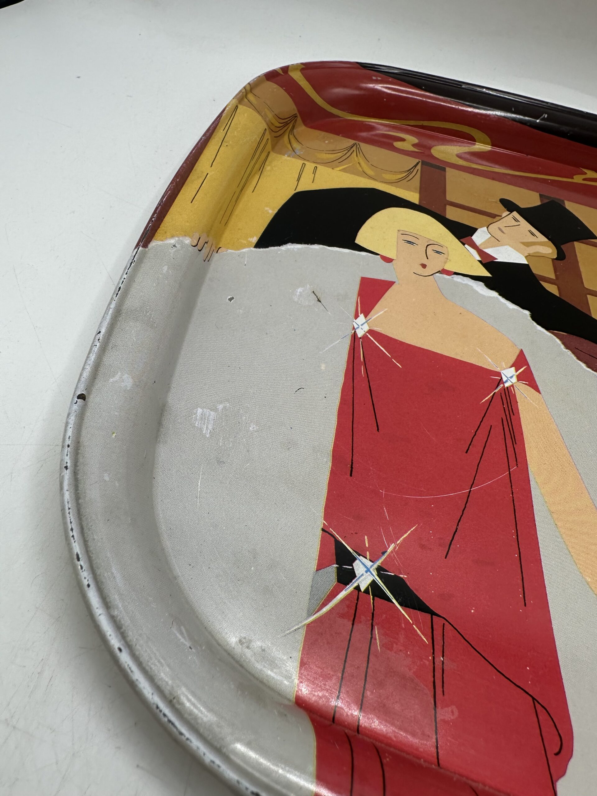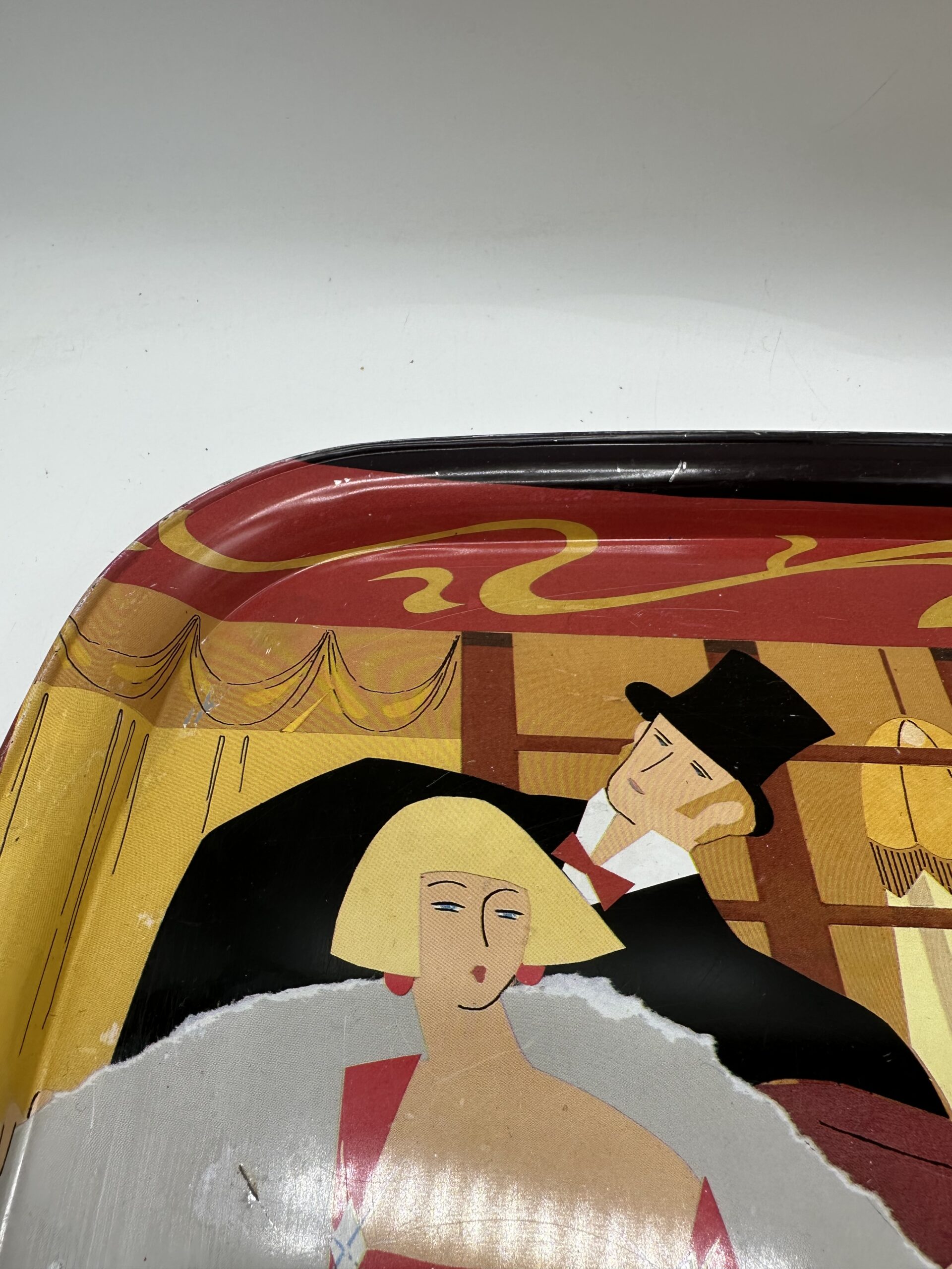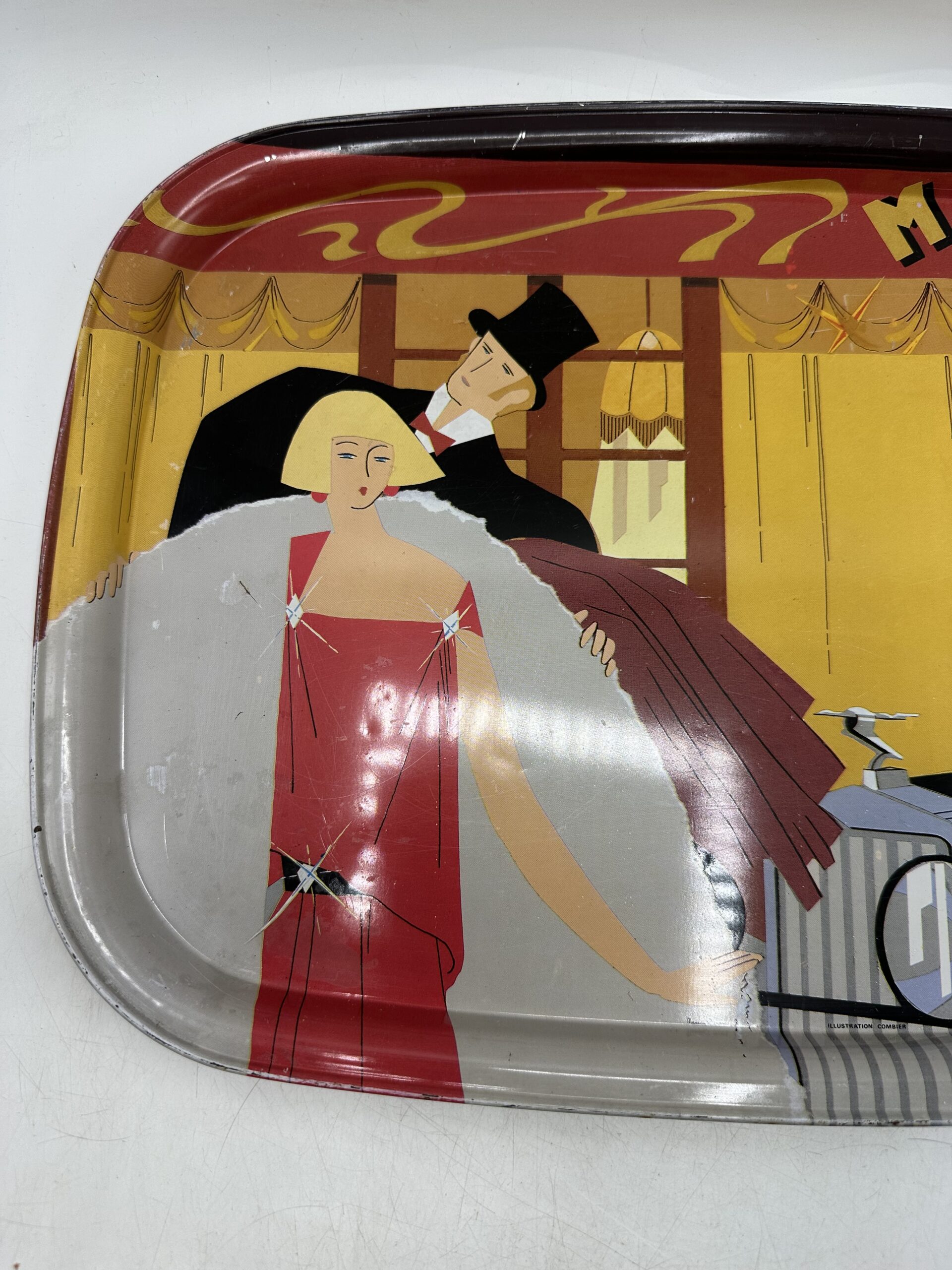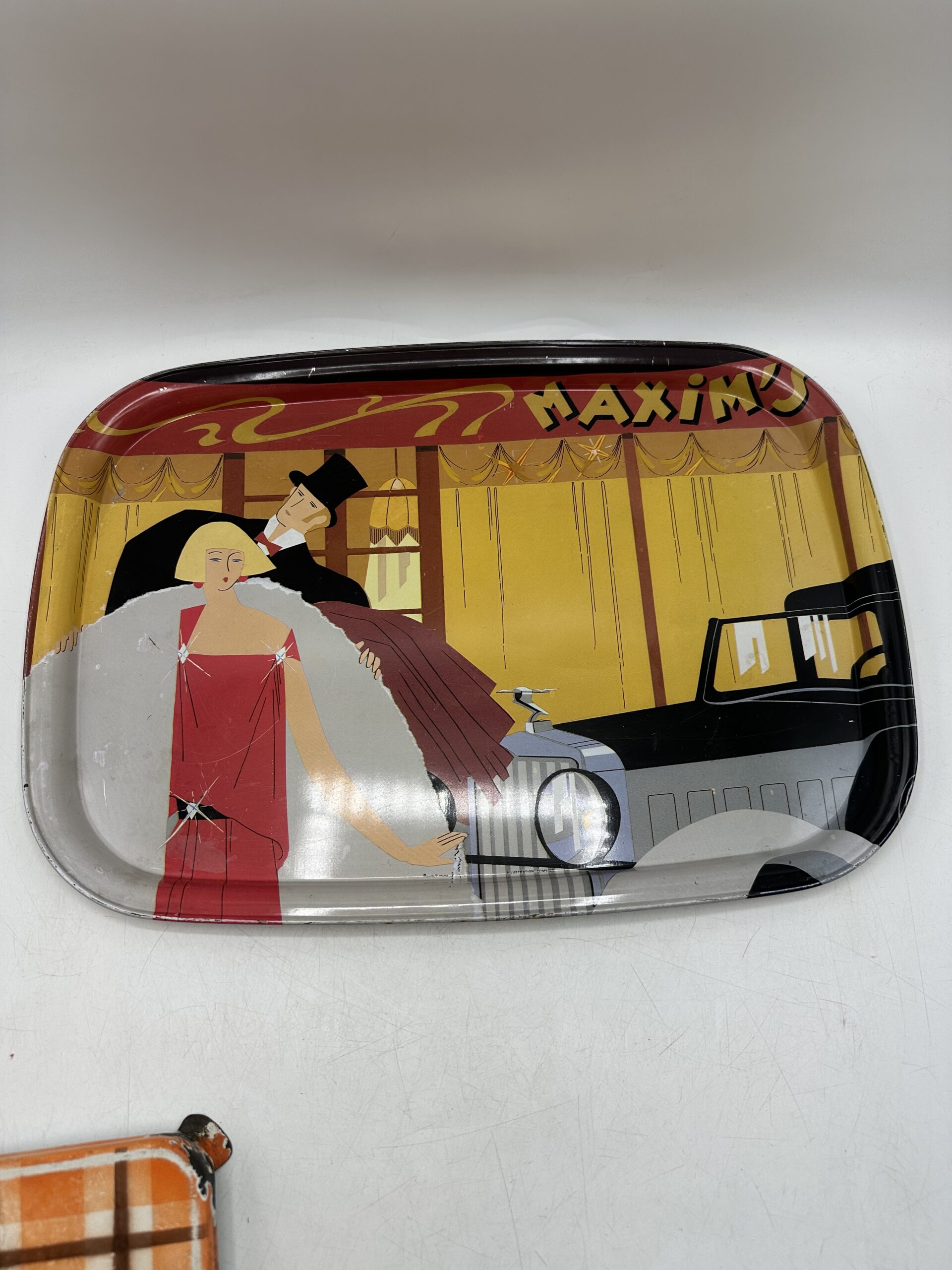 Plateau de type plateau repas en métal avec le dessin et les couleurs typiques Maxim’s.