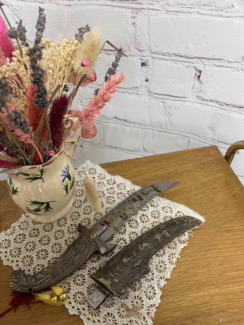 Collectionneurs d’armes blanche et de collection, ce joli petit poignard est un petit poignard originaire de Chine à lame courbe. La la me en acier est peinte avec une illustration représentant un déplacement royal ou de hauts dignitaires militaires à cheval et à pied qui partent de la Cité interdite dans un style qui rappelle les estampes chinoises anciennes de couleur rouge et or. La lame est protégée par un fourreau courbé.en métal qui reprend la même illustration en relief gravé sur le métal et décoré d’un élément en forme de dragon en relief sur le dessus. La garde du couteau est décorée de motifs ornementaux gravés et de de 2 petites suspensions dans les mêmes couleurs que la lame.La poignard est assez récent et la lame peut être sortie en forçant le système de sécurité à vis. Un joli poignard à collectionner.