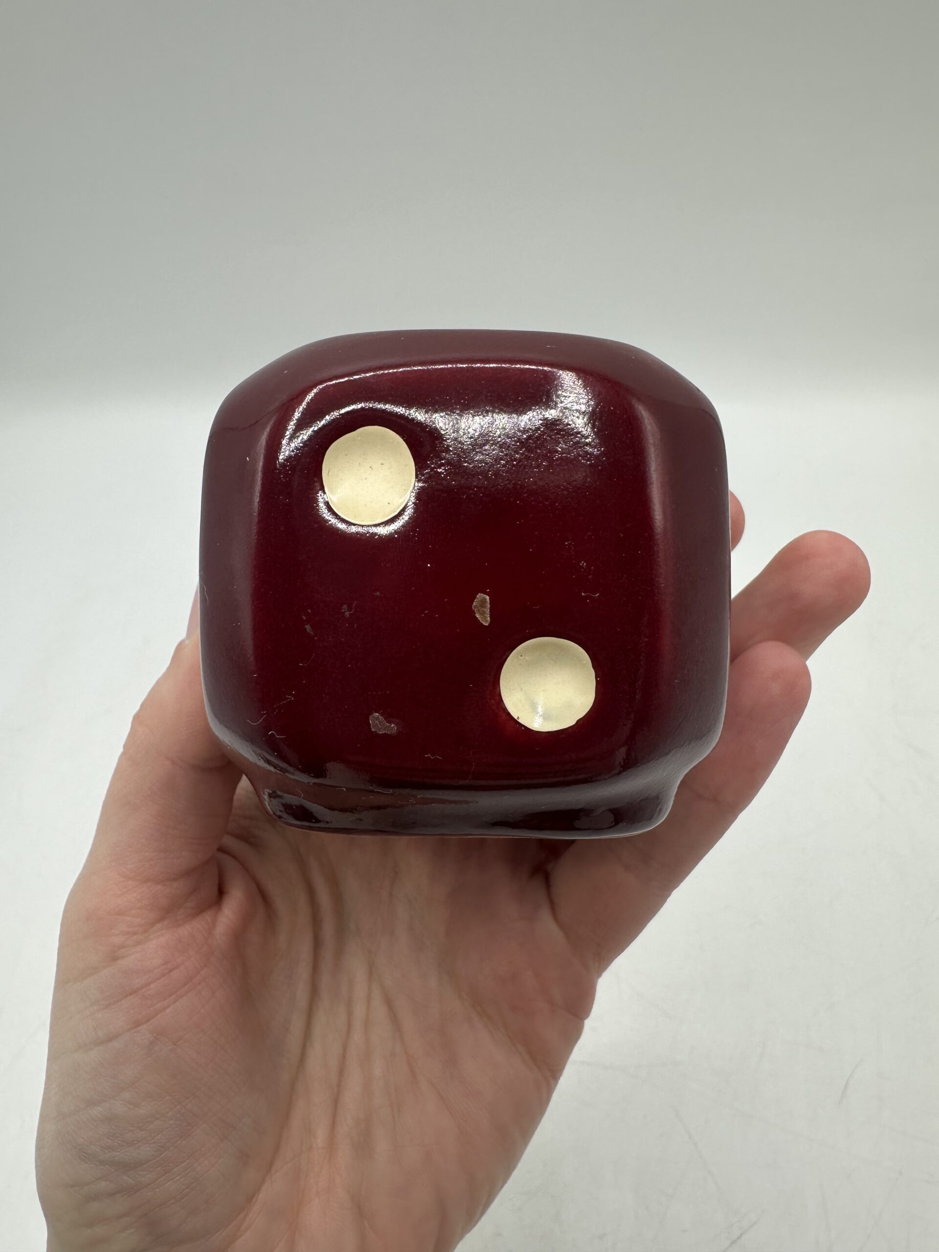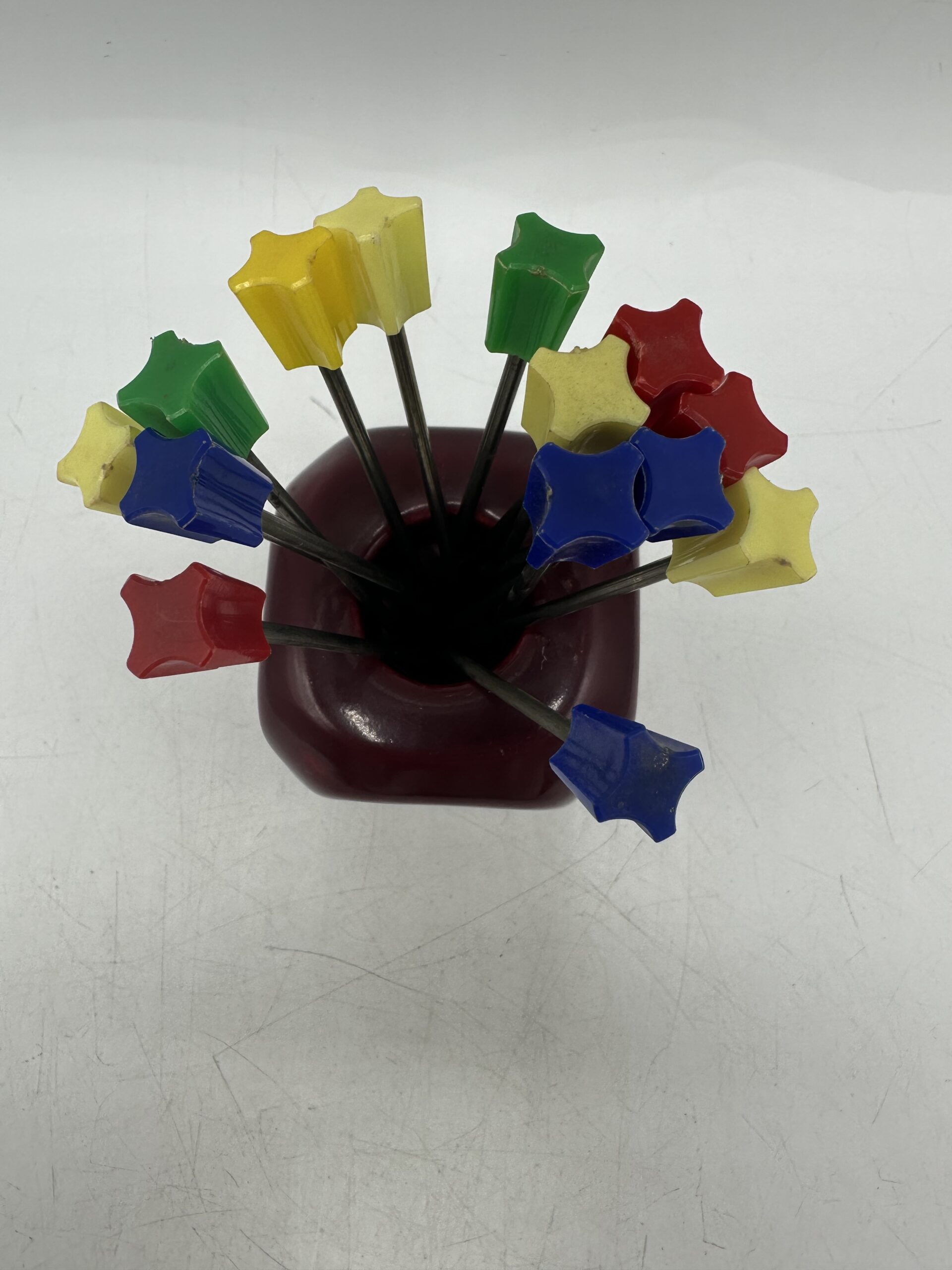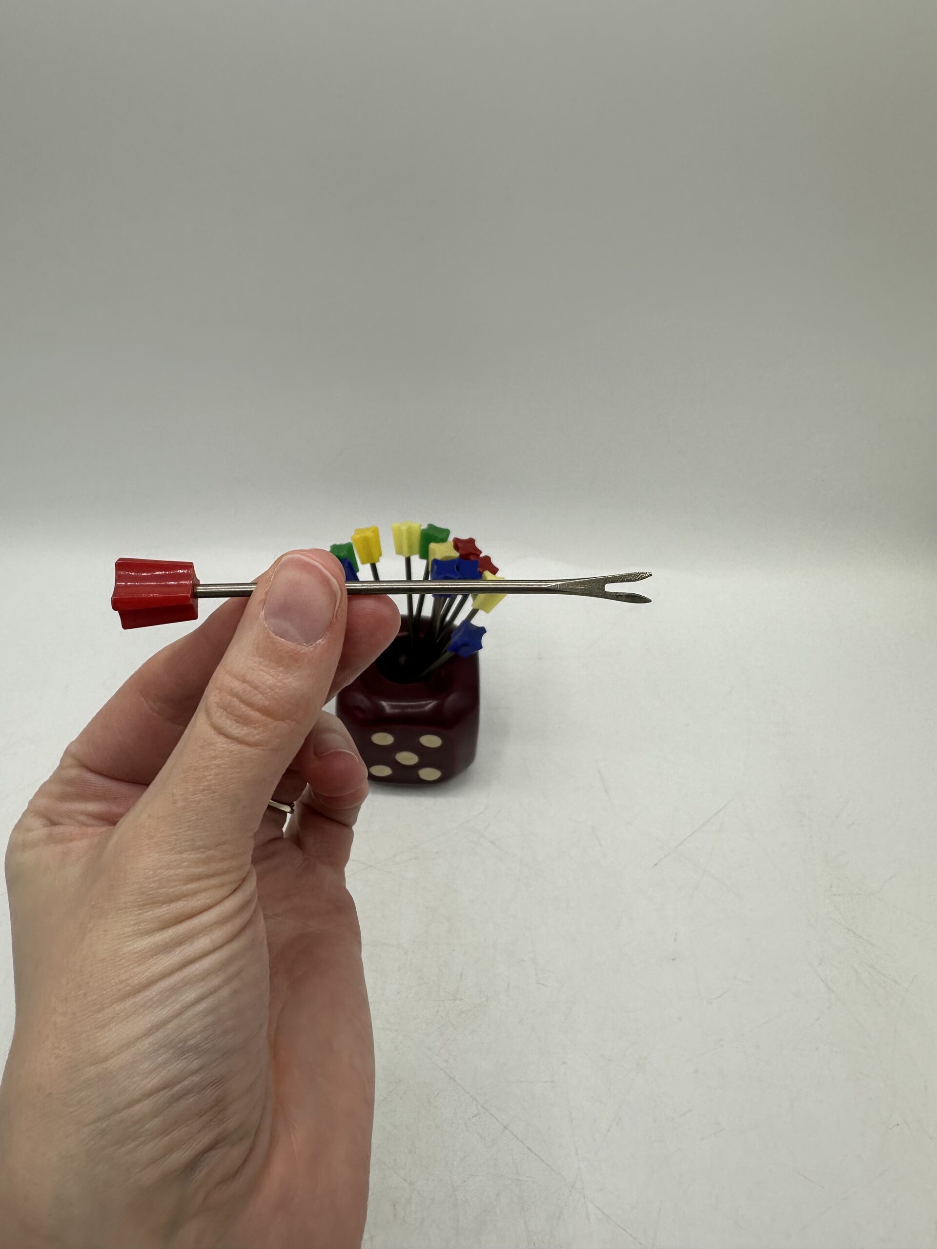 Ce dé vintage en céramique permet d’y ranger des pique à escargots ou pour l’apéritif. IL est en bon état général, avec des petites traces d’usures normales. Le dé est en céramique rouge bordeaux. Avec, il y a 14 piques colorés. Ils présentent eux aussi des marques d’usures normales.