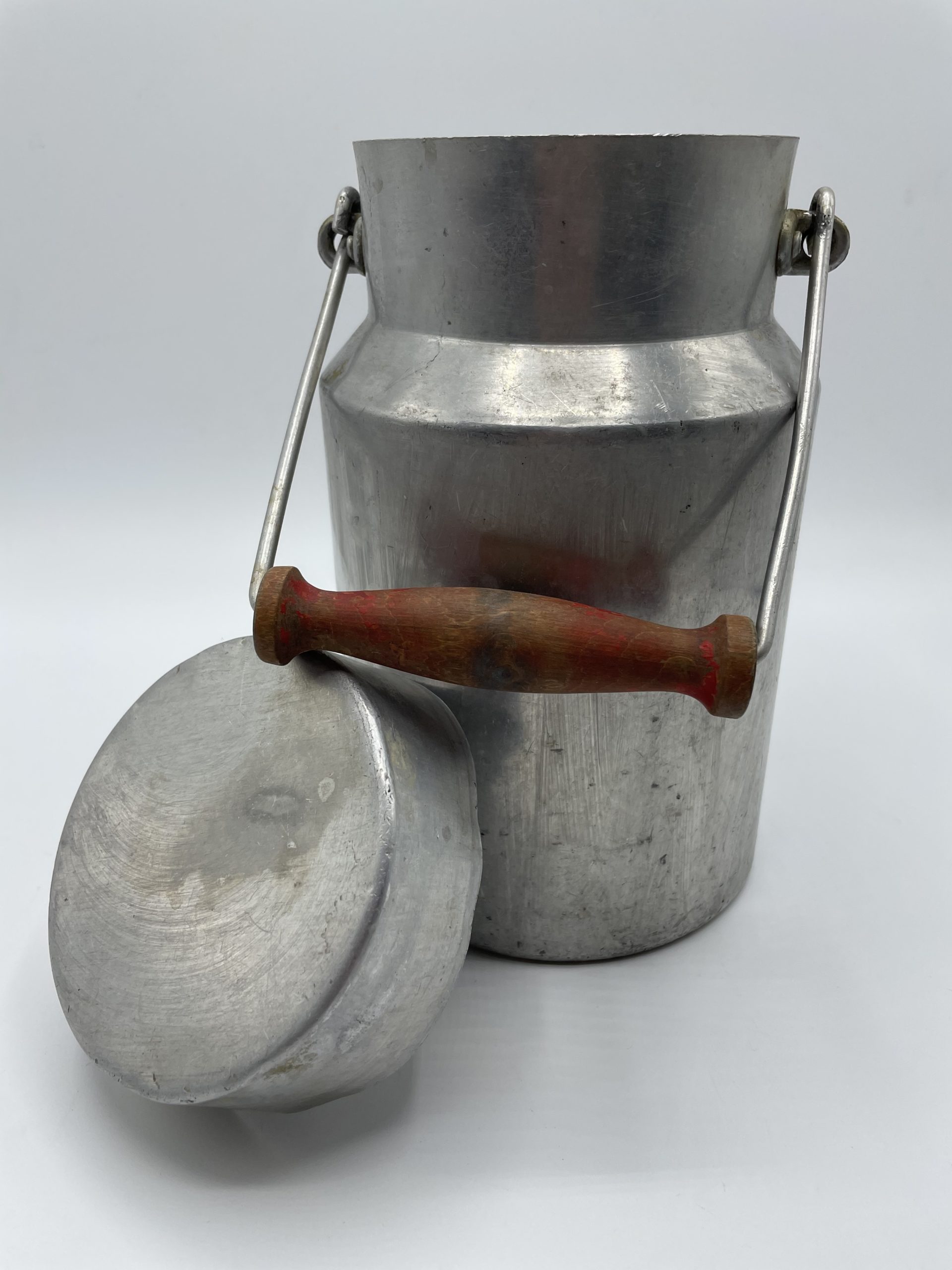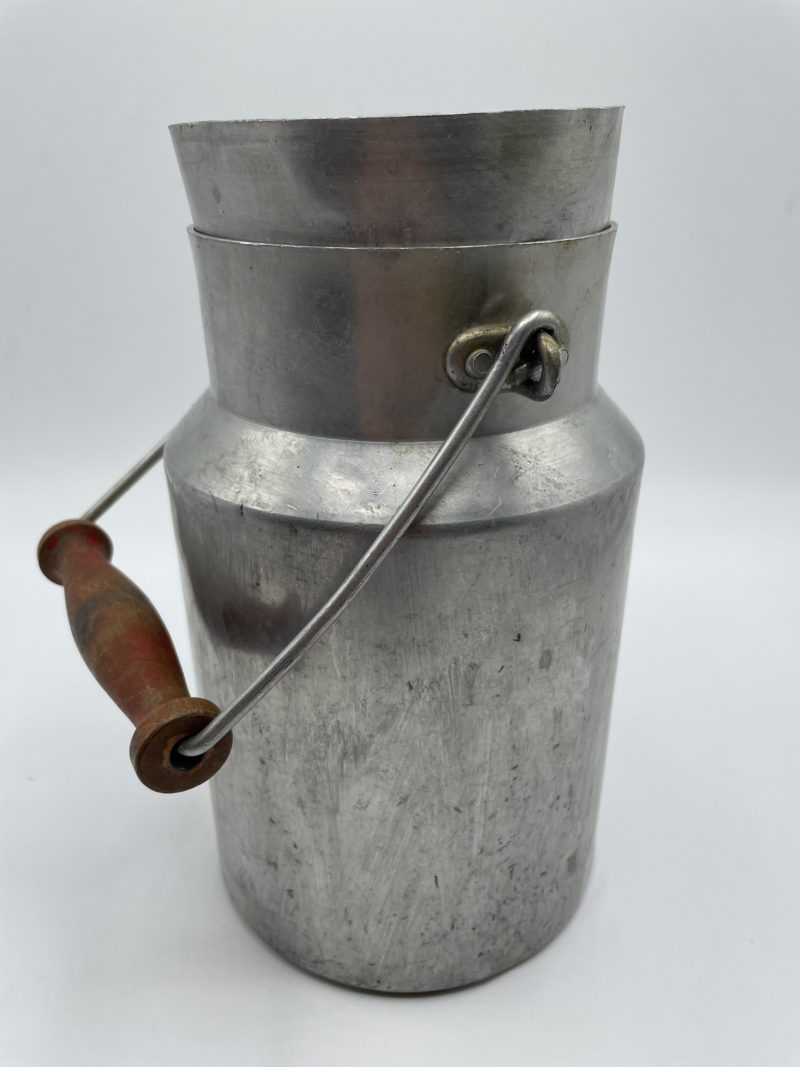 Ancien pot à lait en aluminium pur des années 50 environs d’une capacité d’un litre. Le couvercle est un peu cabossé mais reste fonctionnel. Avec sa jolie poignée en bois, le pot à lait est en bon état général