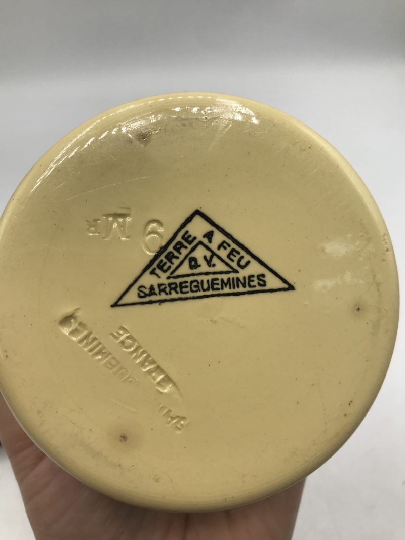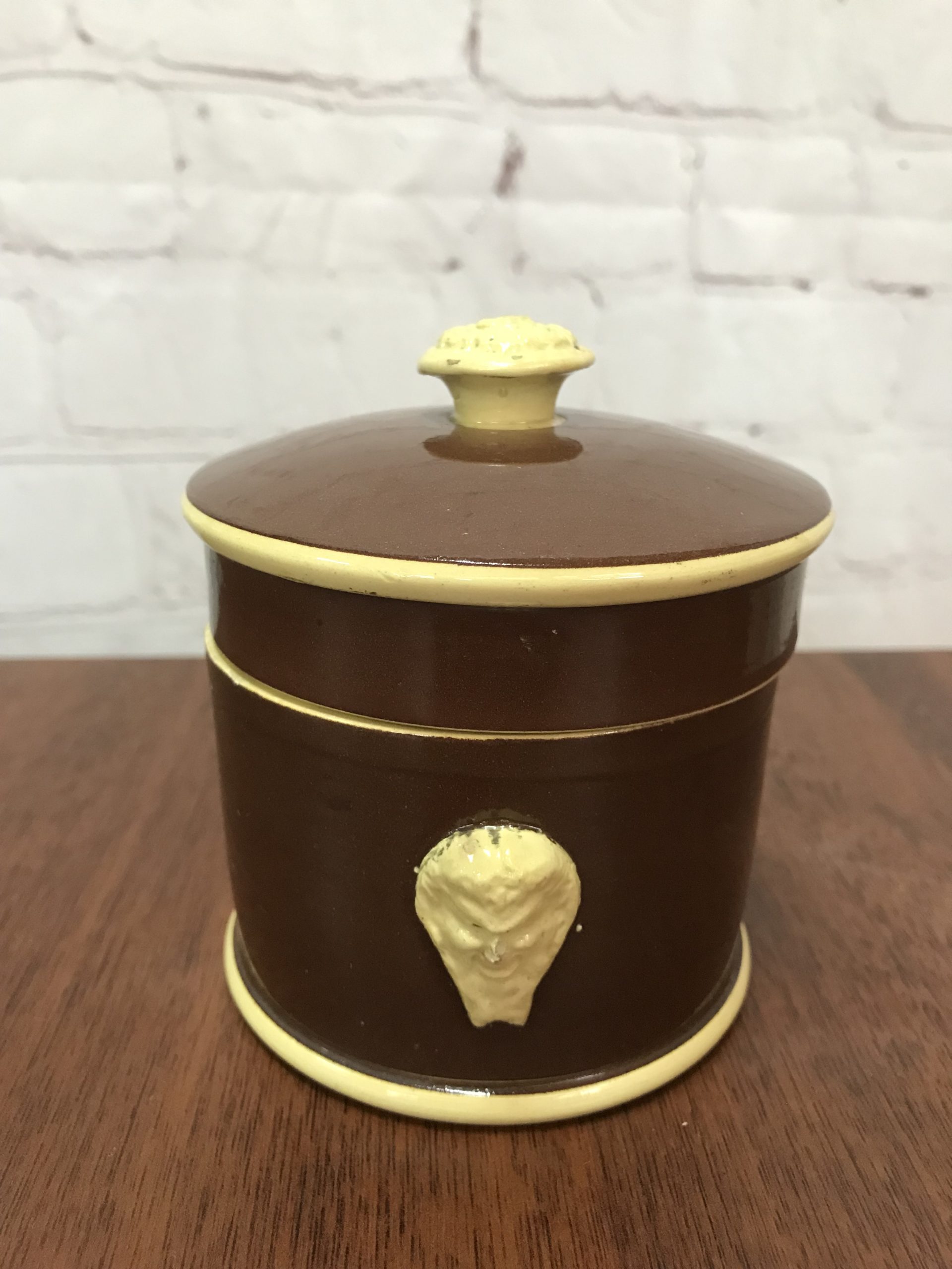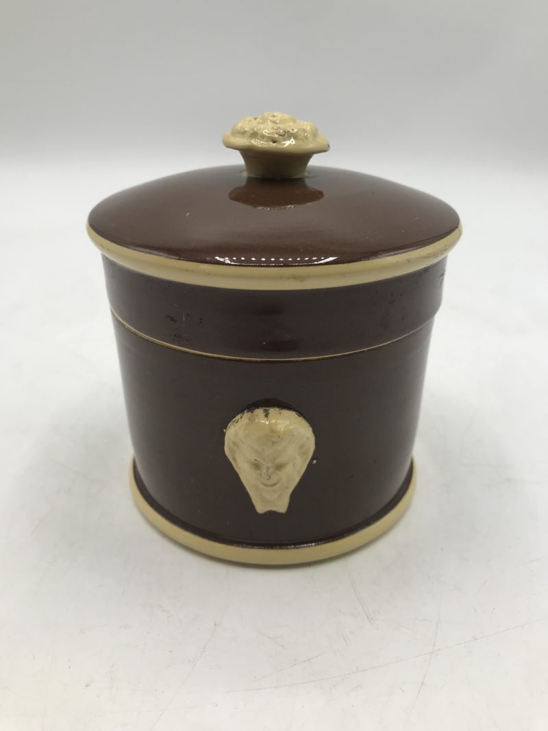 Alerte pépite !! Ancien pot avec couvercle, bicolore marron chocolat et vanille, orné de deux mascarons dont la fonction apotropaïque est d’éloigner les mauvais esprits et qu’ils ne pénètrent pas dans la demeure. Signé Sarreguemines terre a feu. Une jolie pièce à avoir prés de soi, pou la déco et pour être bien entouré. Un petit éclat à signaler sur le rebord intérieur, sinon il est en très bon état vu son âge. Le pot mesure 9,5 cm de diamètre pour une hauteur de 7,5 cm sans couvercle, et 12 cm avec couvercle.