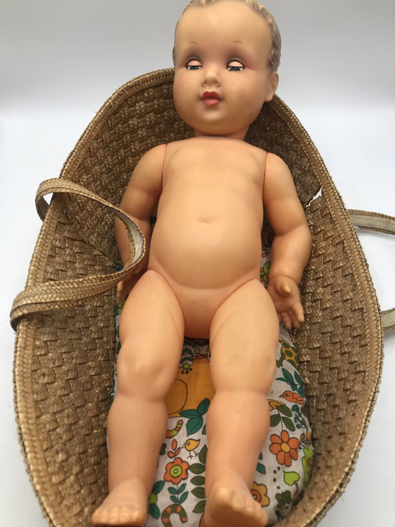 Poupon Convert Nano 1947. Joli et craquant poupon de chez Convert Nano il porte le petit moulin sur sa nuque et le numéro 50. Il a traversé le temps et porte quelques marques d’usure, a noter des griffures au niveau du coup (cf photos). Quelques décolorations sur les cheveux et le plastique. ce petit baigneur a une vrai belle tête d’ange. Ses paupières son mobiles et sa bouche fermée. Il est livré avec un petit couffin fait main. Il n’attend que vous pour vivre une seconde vie. Amoureux des jouets anciens et des poupons, il est pour vous.