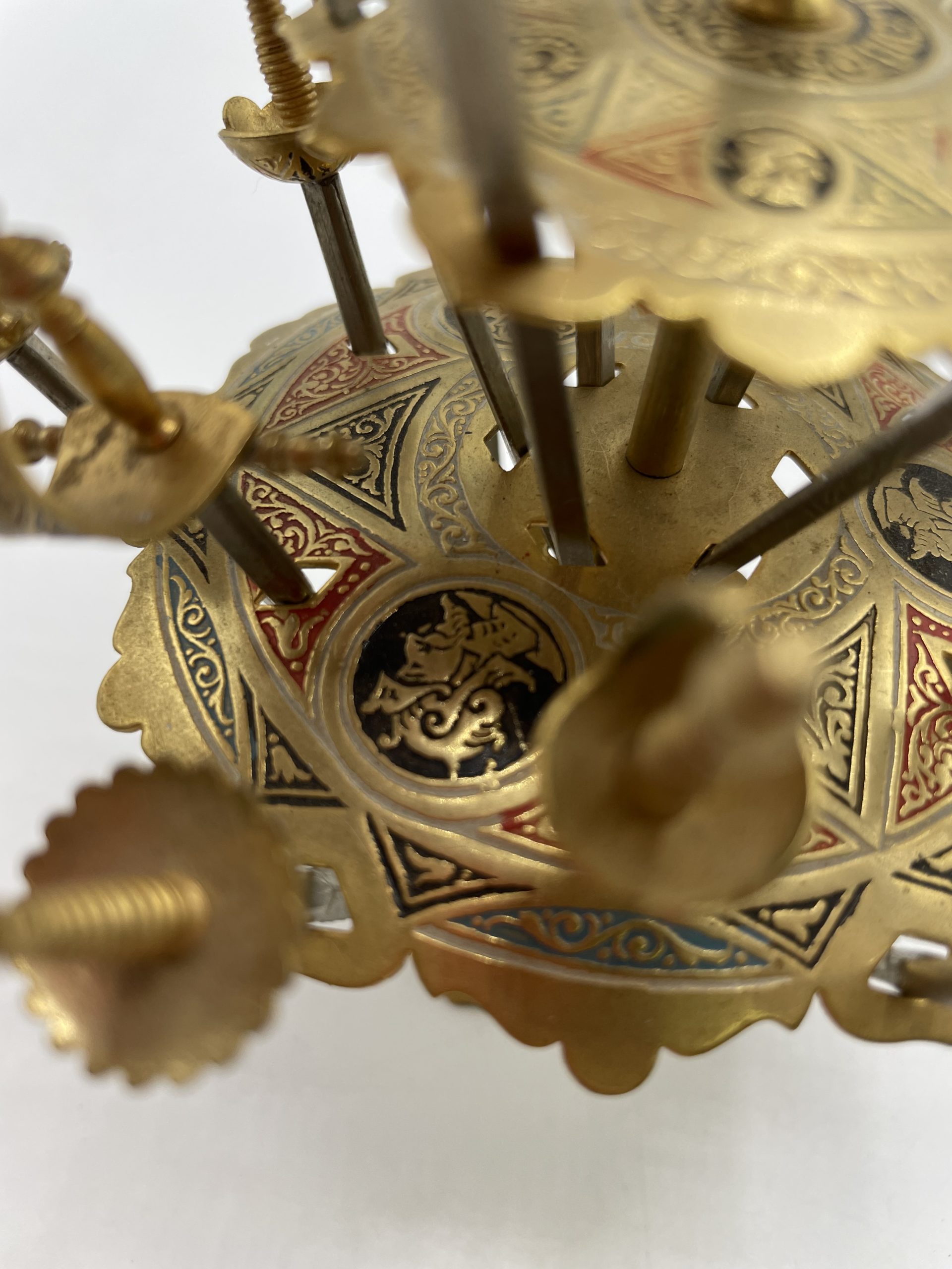 Très joli présentoir à pics pour l’apéritif en formes d’épées. D’origine espagnole, ce superbe présentoir en laiton date des années 50 60 et on pet lire l’inscription Toledo sur le dessus du présentoir, souvenir de la ville connu pour ses monuments médiévaux arabes et chrétiens. Les épées et le présentoir sont finement décorées avec des motifs berbères blancs, noirs, rouges et bleus. Il y a au total 14 piques décorés dans 4 styles différents. Original et royal, ce joli présentoir sera parfait poser sur un buffet ou une table !