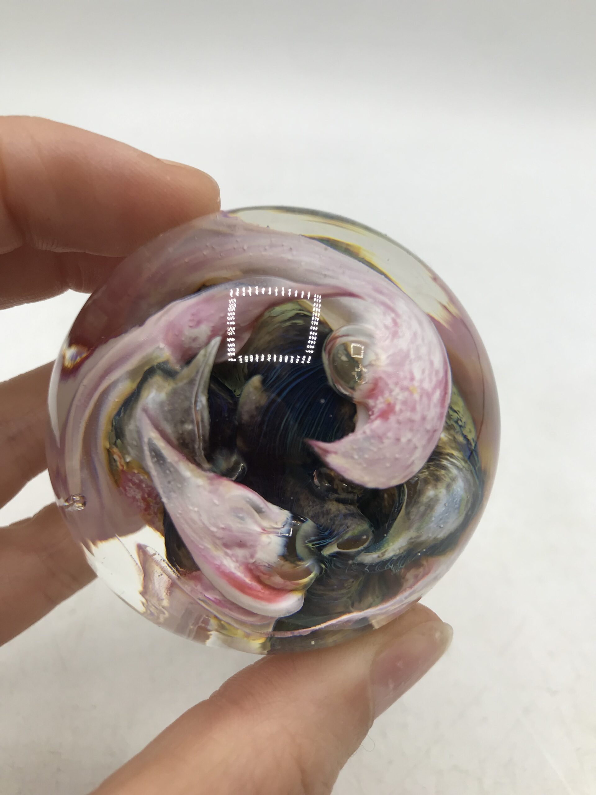 Presse papier verre soufflé « Anémone ». Petit accessoire plein de grâce et de pureté. Une boule de verre soufflé qui nous fait penser à une anémone ou autre coraux dans fonds marins. Joli moment de poésie visuelle qui invite à la rêverie. Parfait comme presse papier sur votre bureau, ou tout simplement en élément de décoration. Un bel objet qui trouvera facilement sa place. L’effet visuel est magnifique. Elle arbore des couleurs, rose, verte, blanche, bleu. Un jeu de texture magique. Elle porte une signature mais impossible de la déchiffrer (cf photos). Légères traces d’usure sur le verre mais à peine perceptibles.