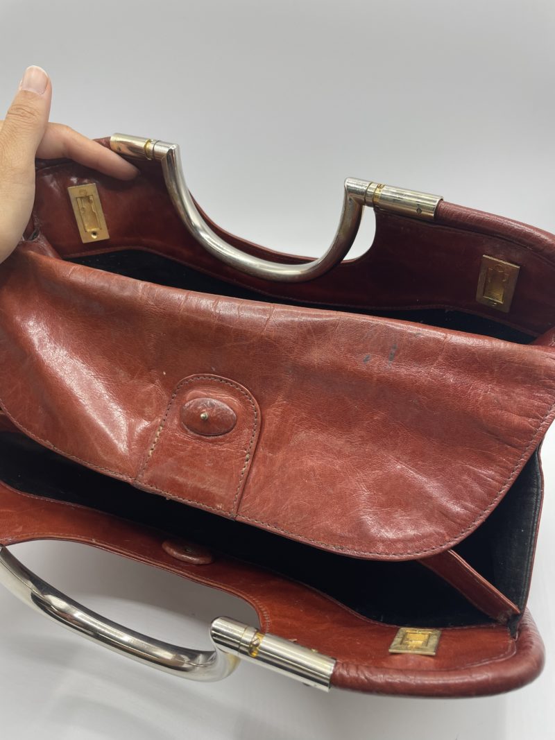 Ancien petit sac à main de la célèbre marque de sac et de maroquinerie Lancel en cuir lisse de couleur brique. Le sac a 3 compartiments et des poches intérieures qui permettent de ranger facilement ses affaires. Les anses en métal sont hyper retro et donnent tout le charme à ce sac. Initialement, on pouvait accrocher des lanières ou des anses longues pour porter le sac à l’épaule ou en bandoulière. Le sac présente quelques traces d’usure (cf photos) jolies marques du temps passé.Un petit nettoyage sera à prévoir pour lui rendre son lustre d’antan. Vintage et collector, ce sac vous accompagnera de partout et a encore de beaux jours devant lui !