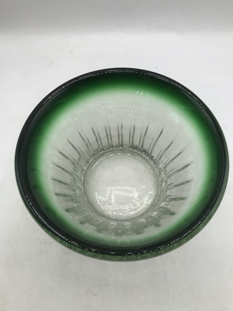 Le saladier est en corole plus étroit à la base et ouvert vers le haut. De couleur transparent il est habillé d’un anneau vert foncé qui se dégrade doucement dans le vert, un effet retro vintage à couper le souffle.