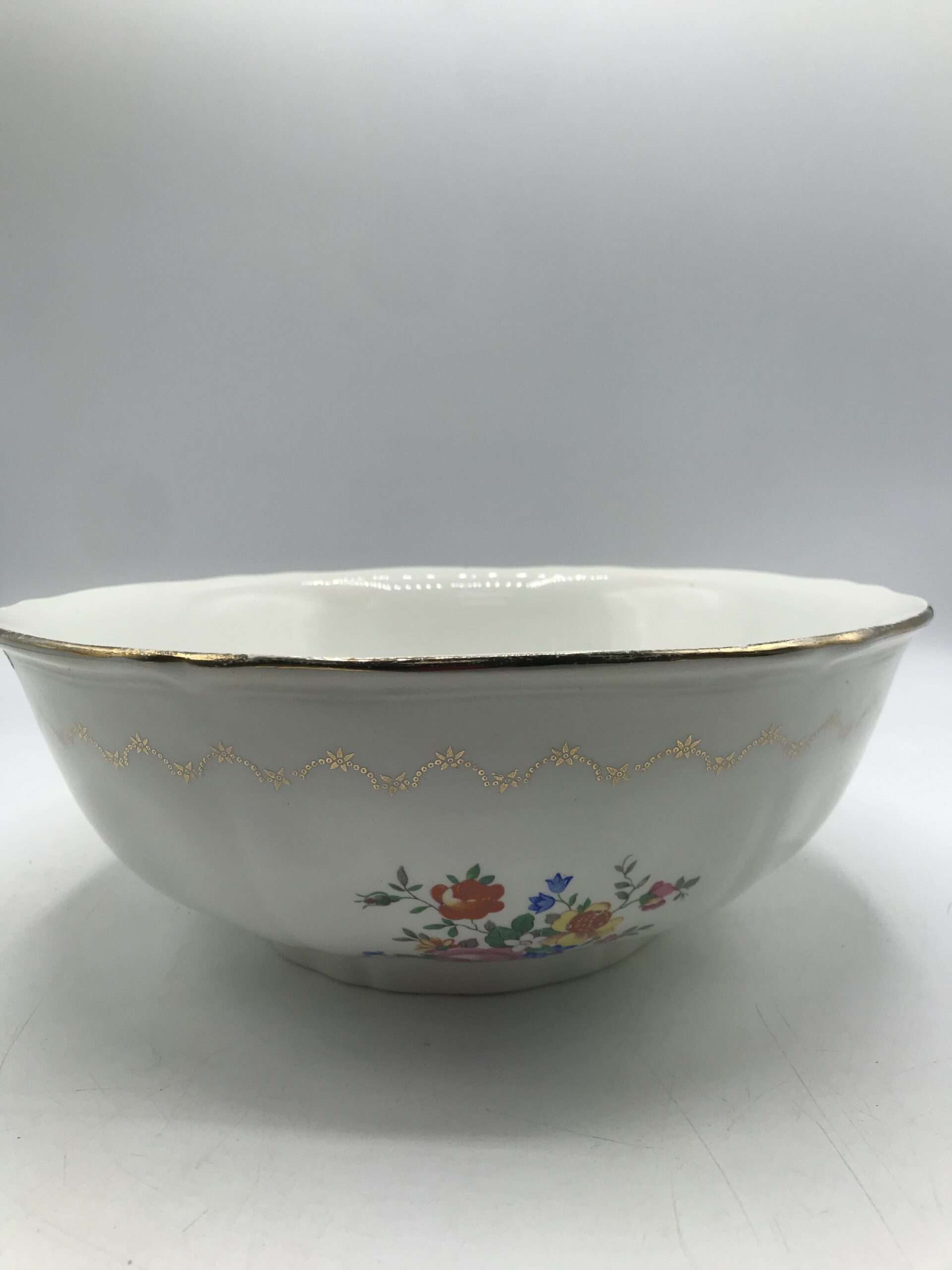 Alerte pépite !!!! Pour les amoureux de St Amand. Voici un saladier magnifique. IL à un diamètre de 26,5 cm pour une hauteur de 10 cm. Il est plein de chic et de grâce. De jolies petites fleurs colorées viennent décors ses contours par bouquets. On y trouve aussi une frise dorée qui fait le tour du saladier avec des petites fleurs stylisées. Pas d’éclat mais des traces du temps, des marques à l’intérieur et les rebords dorés sont un peu usés (cf photos). Une belle pièce qui peut servir également de plat à fruits.