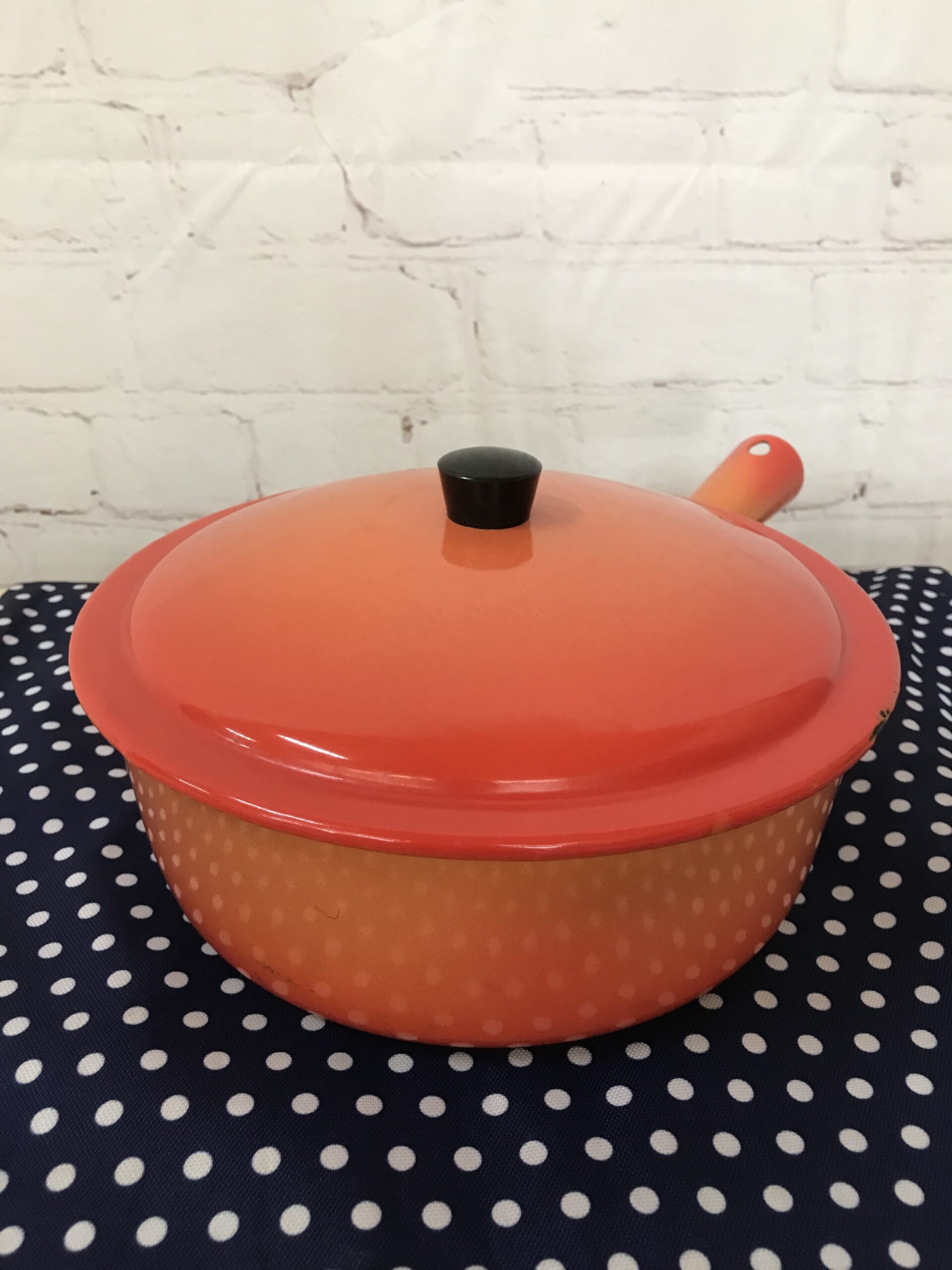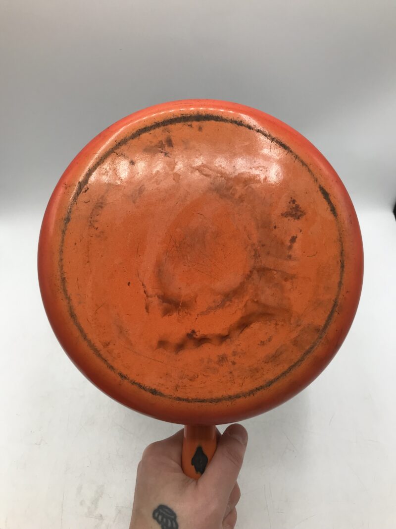 Sauteuse avec couvercle en émail vintage. Pour les amoureux de la déco ou de la cuisine. Cette sauteuse en émail de couleur orange vintage va vous séduire. Elle à un diamètre de 23 cm pour une hauteur de 8,5 cm. Elle porte des éclats sur le bord et sous la poignée et des marques sur la semelle. Poignée qui est en tube comme les ancien caquelons, super effet retro. Elle est plus destinée à de la décoration car c’est un bel objet de vaisselle emblématique, et elle a traverser les années, elle en porte les marques. Vrai coup de cœur avec son couvercle, elle est prête à briller aux yeux de tous.