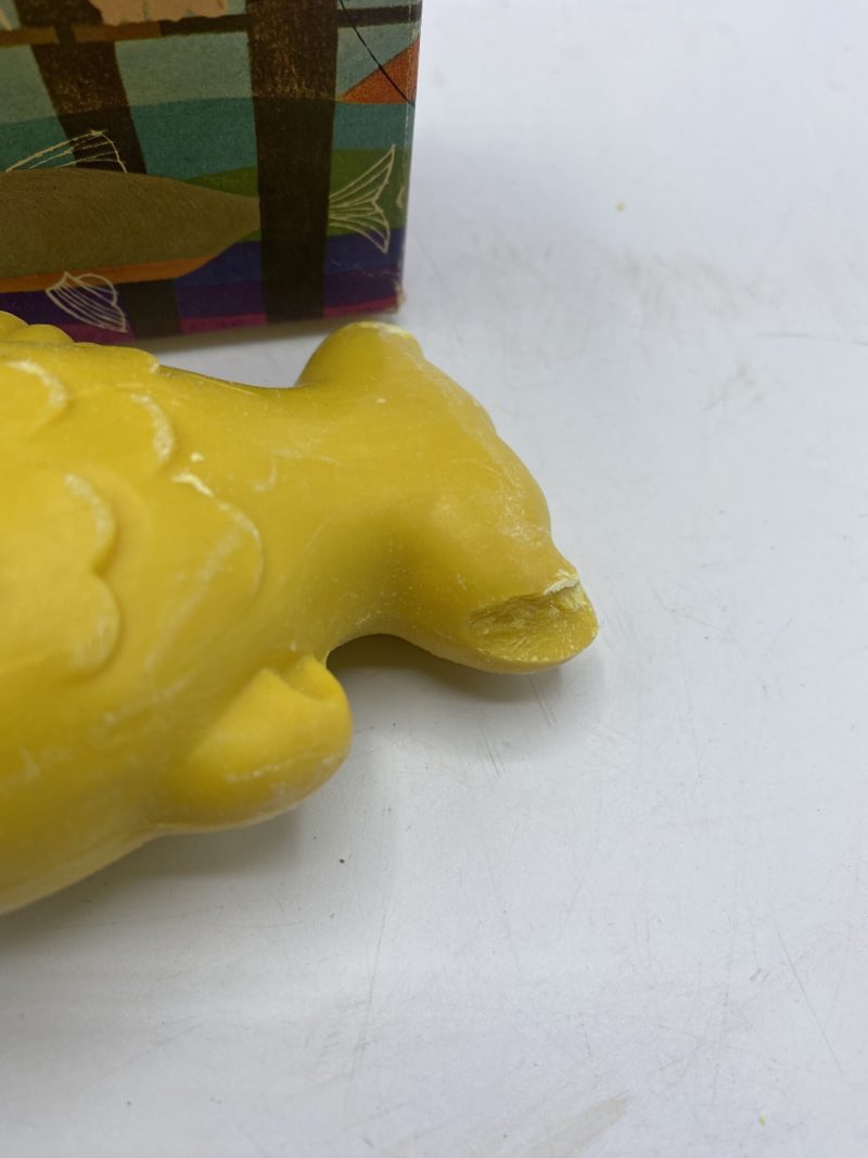 On craque d’amour pour ce joli petit savon ! De la marque de cosmétique Avon, ce savon vintage est en forme de poisson de couleur jaune. Attaché à une corde, il peut s’accrocher pour être suspendu. Vintage, le savon présente quelques traces d’usure et des coups (cf photos) et il est emballé dans sa boîte d’origine et il fait partie de la collection «Sunny the Sunfish». On adore !