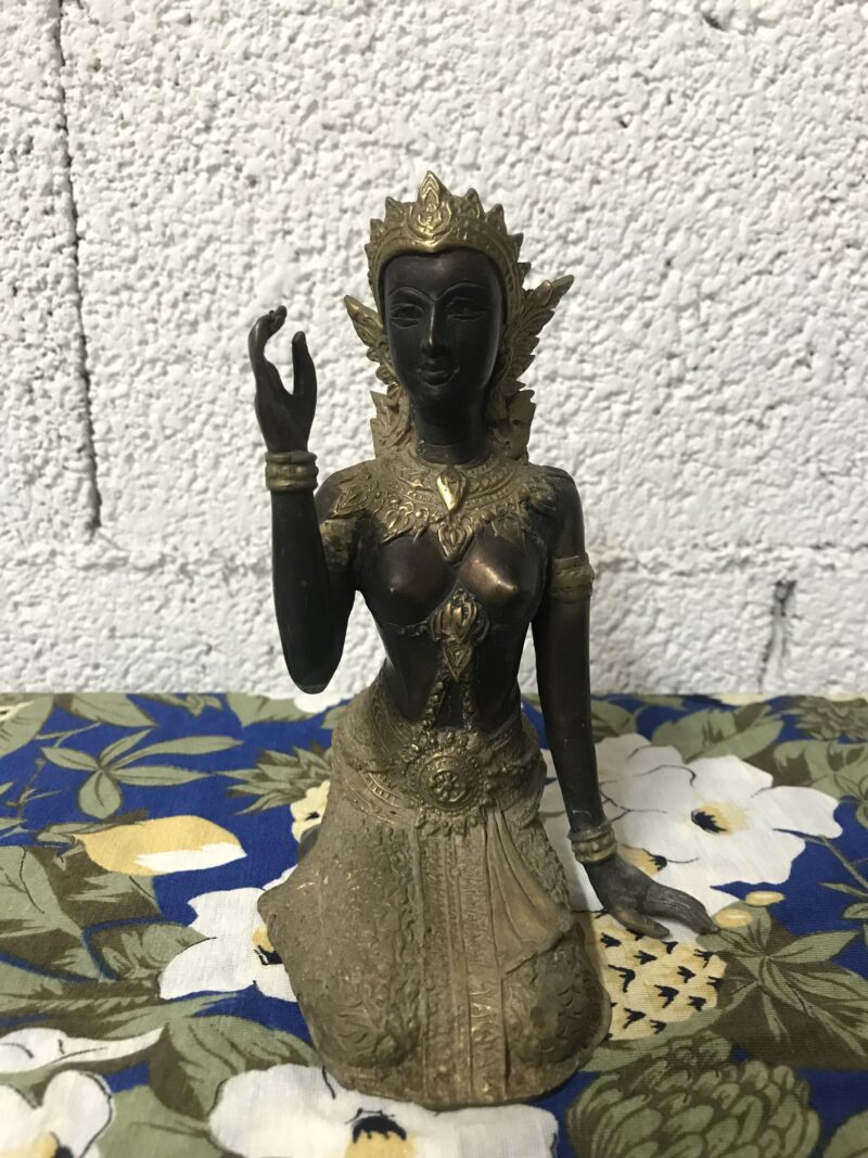 Sculpture bronze doré divinité. Une merveille de statuette, elle représente une gardienne de temple en position agenouillée. Une main levée une main au sol, elle est en bon état mais nécessitera un bon nettoyage pour révéler toute sa superbe. A noter des imperfection sur une des main (cf photos). Donner un peu de spiritualité et d’évasion à votre décoration. Une belle pièce pleine de symboles et de grâce, ouvrez vos chakras laisser la plénitude vous envahir. Une futur alliée dans vos moments de détente dans une ambiance apaisée. Avis aux amateurs de voyages et de sculptures en bronze. Son charme vous séduira.