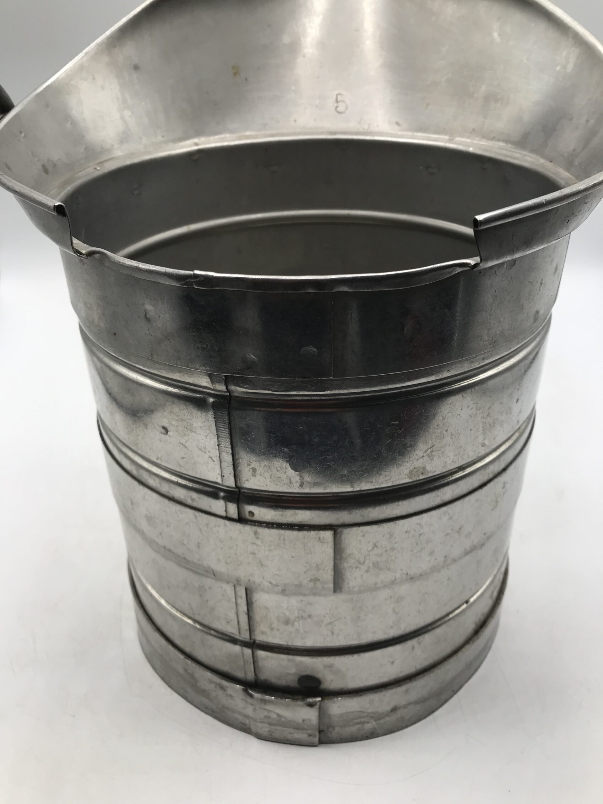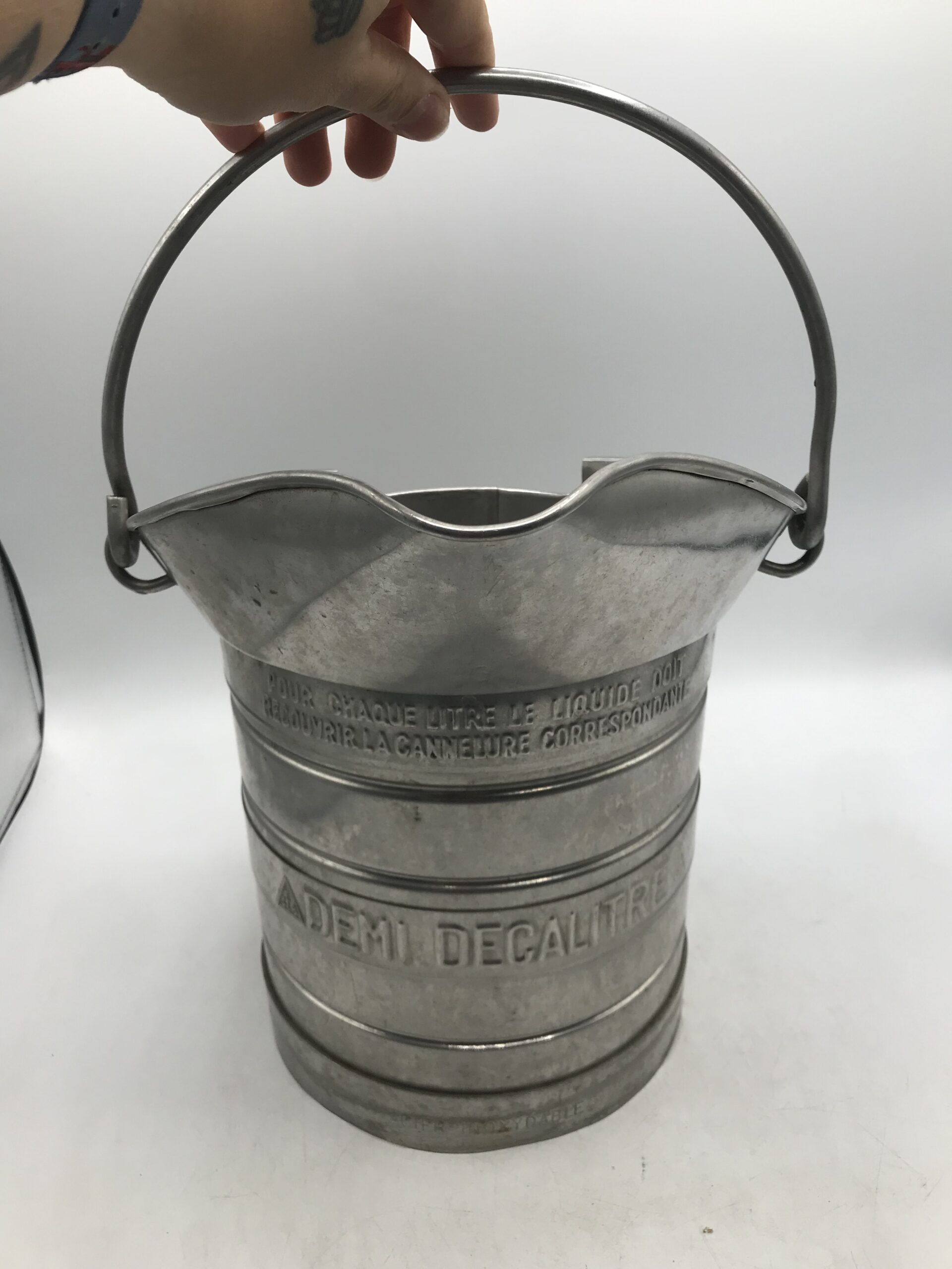 Seau Cache Pot Demi Décalitre. Il est marqué sur le devant avec la mesure SEB « Decalitre » SEB qui est d’environ 2,6 gallons dans les mesures américaines et est utilisé pour contenir et mesurer jusqu’à dix litres de liquide car il y a des chiffres sur la surface intérieure de chaque côté. Charmant seau de ferme en métal qui était utilisé à l’époque pour fabriquer du vin, du cidre, de l’huile d’olive. Un bel objet ancien qui a beaucoup de charisme. Il peut aussi bien être utilisé comme cache pot ou juste pour compléter une déco champêtre. Le seau a un diamètre de 19 cm pour une hauteur total de 28 cm. Le seau porte des marques de rouille sur le fond (cf photos) mais reste en bon état général. En acier inoxydable, il est taillé pour résister.