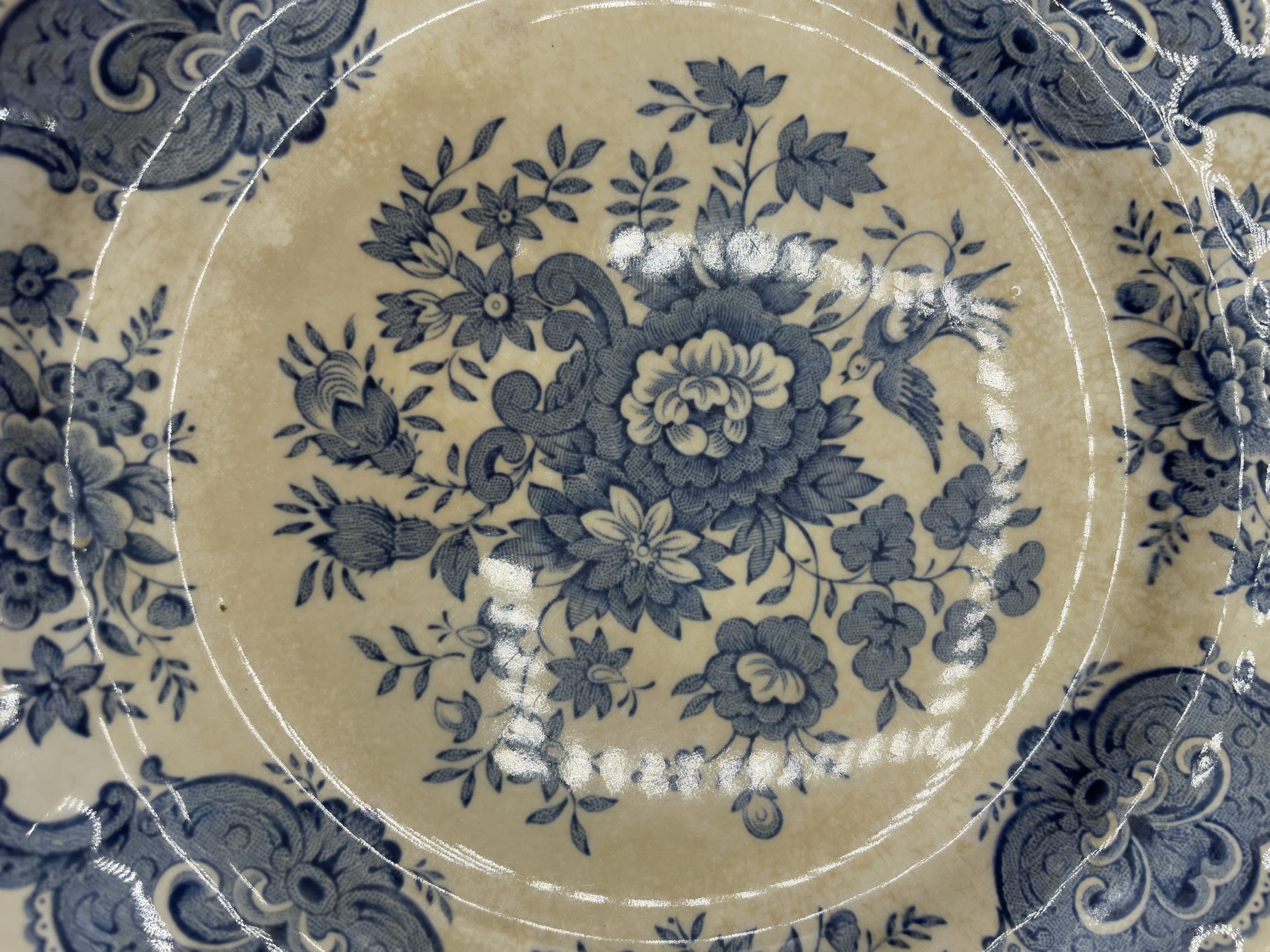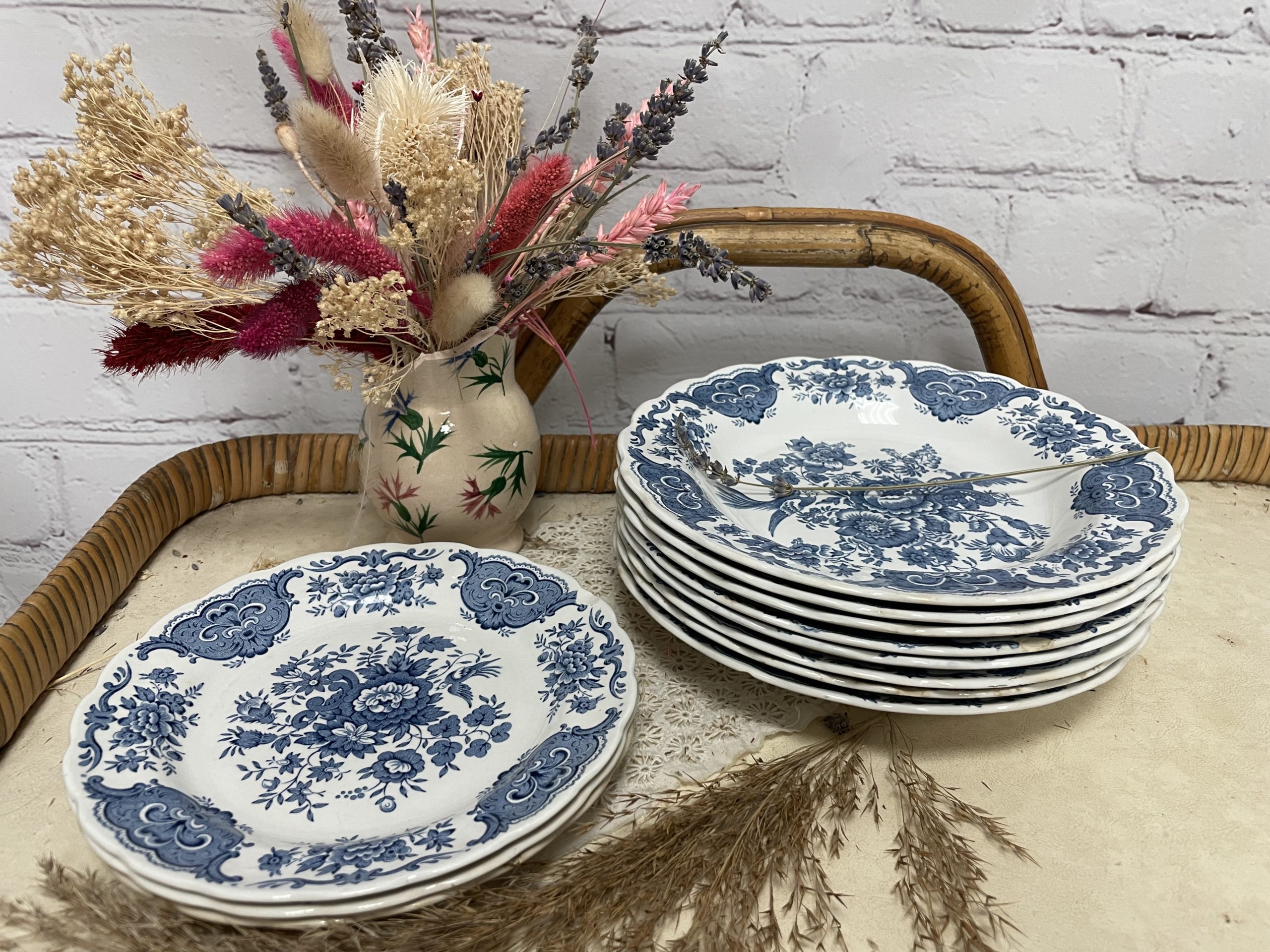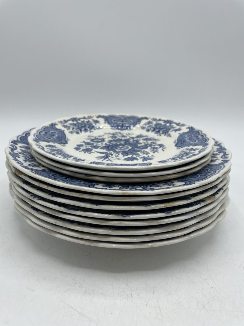 On craque pour ce joli service vintage qui se compose de 3 assiettes à dessert et de 8 assiettes creuses. Estampillé Ridgway Satffordshire, ce service en faïence anglaise fiat partie de la collection Windsor. De couleur blanche, les assiettes sont décorées d’une frise de fleurs et d’éléments ornementaux et d’un motif central de bouquet de fleurs de jardin avec un oiseau de couleur bleue, typique de la vaisselle anglaise. Vintage, des traces d’usure et ds éclats sont à prévoir (cf photos) jolies marques du temps passé. Un service à l’esprit printanier et romantique à souhait !