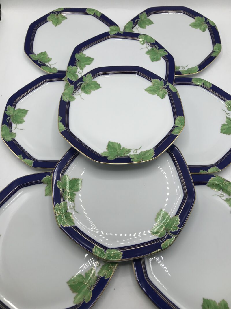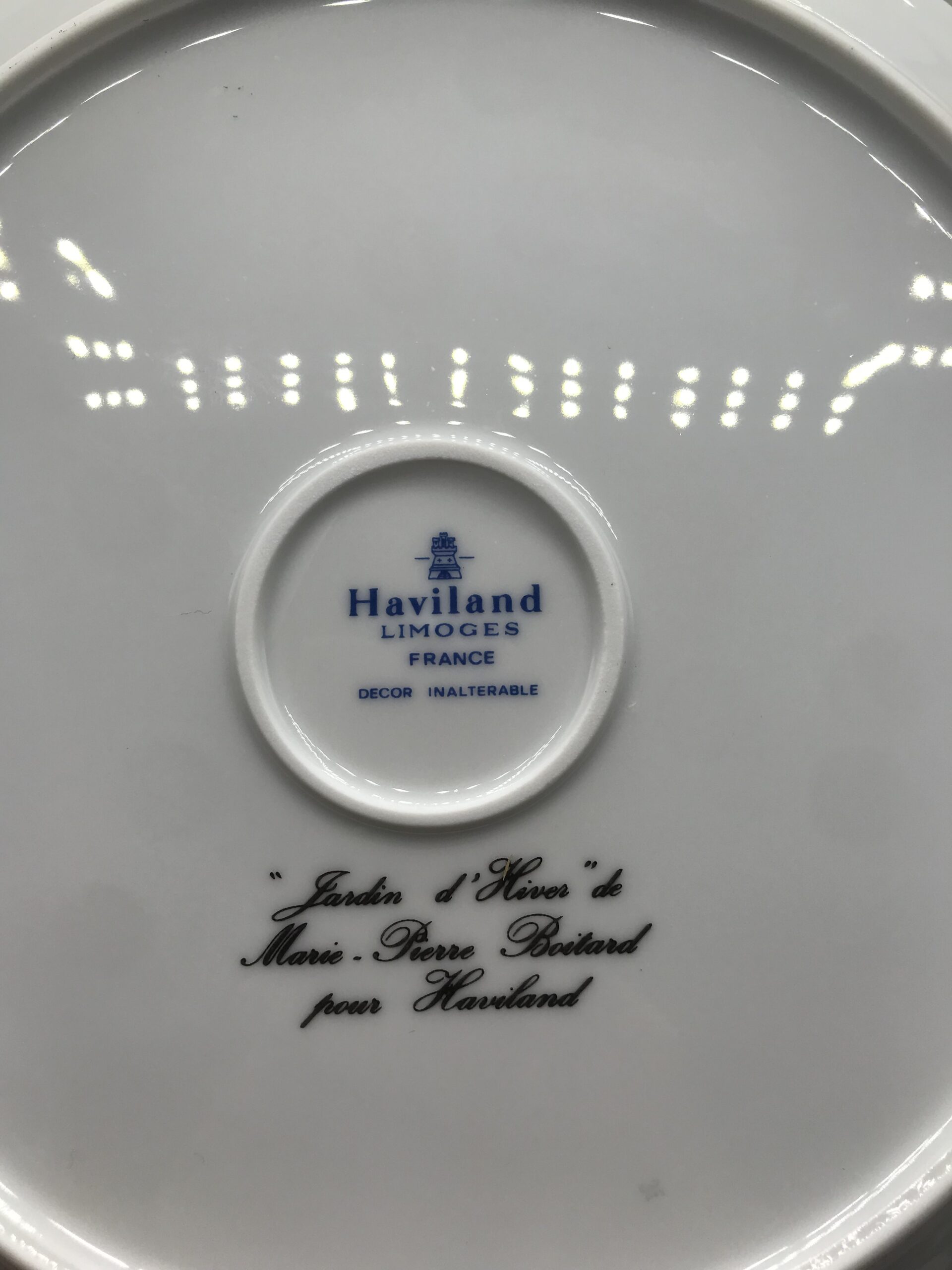 Alerte pépite !!! Service 12 assiettes à dessert Limoges « Jardin d’hiver ». Nous avons eu la chance d’avoir un service plus que complet de la collection « Jardin d’hiver » porcelaine de Limoges. Nous avons décomposé ce service pour faire plusieurs lots, n’hésitez pas à vous balader sur le site pour y découvrir les autres. Dans cette annonce nous parlons de l’ensemble de 12 assiettes plates à dessert. Les assiettes ont un diamètre de 19,8 cm pour une hauteur de 1,5 cm. Une belle harmonie de couleur entre le bleu électrique des bords et le vert vif des feuilles. Les assiettes sont de couleur blanche bleutée pour se marier avec les décors. Limoges nous offre une très jolie collection avec ce thème. Les dorures viennent apporter un air festif à l’ensemble. Les assiettes sont dans un état proche du neuf, aucun éclat très peu pour ne pas dire aucunes traces d’usure. Avis aux amateurs de vaisselles Française.