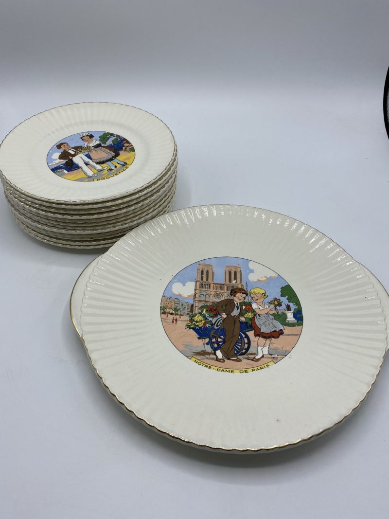 On craque d’amour pour ce sublime service de 13 pièces qui se compose de 12 assiettes à dessert et d’1 plat de présentation. Estampillé Digoin Sarreguemines, le service est en porcelaine opaque et il est décoré de scènes de couples en tenues traditionnelles des régions de France. Ainsi on retrouve la Provence, l’Auvergne, le Languedoc, la Savoie, l’Alsace, le Poitou,le Berry, la Bretagne, le Béarn, le Limousin, les Flandres et la Normandie. Le plat de présentation est quant à lui décoré d’une scène d’un coupe devant Notre Dame de Paris. Le service est aussi décoré d’un joli liseré fin et doré qui ajoute en élégance. Vintage, des traces d’usure sont à prévoir(cf photos) jolies marques du temps passé. Un joli service qui sera parfait pour servir un gâteau ou une belle tarte aux fruits pour le dessert ou le goûter !