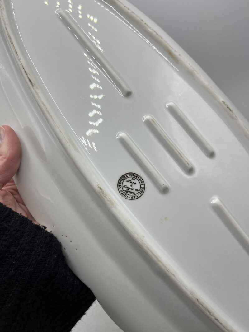 Cette vaisselle en véritable porcelaine SFP France présent de jolis et délicats motifs de différents poissons dans leur environnement. Le pourtour des assiettes et du plat revêtent de jolies arabesques dorées.