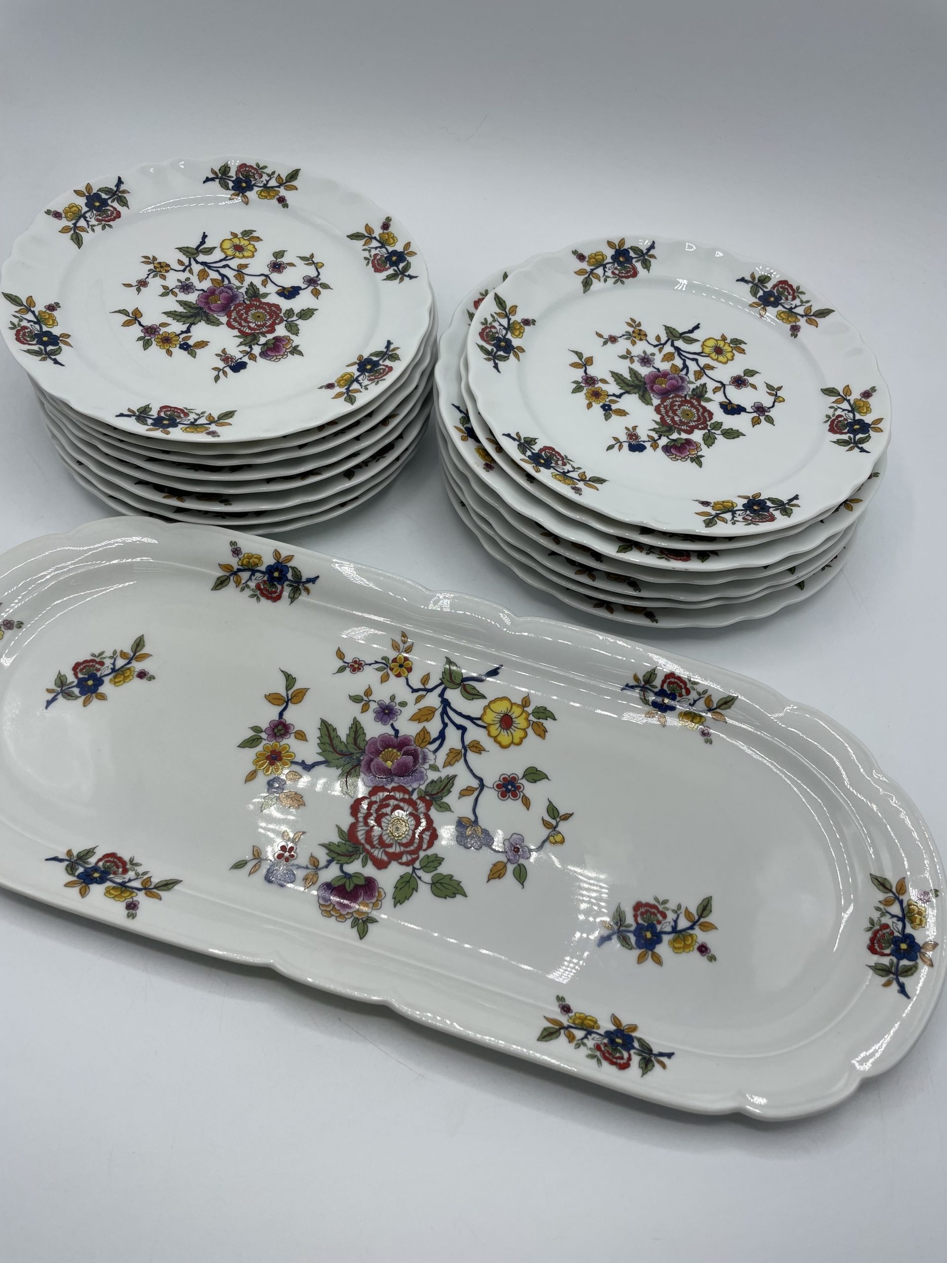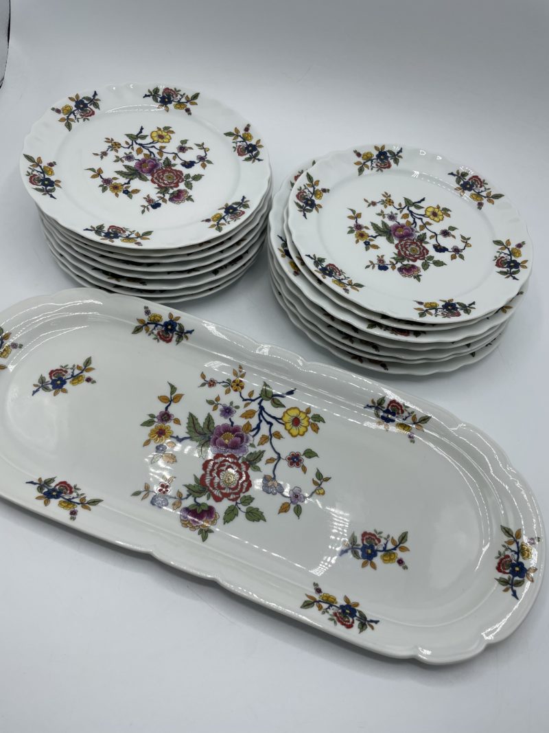 On craque d’amour pour ce sublime service de 16 pièces. Il se compose d’1 plat à cake, de 5 assiettes plates et de 10 assiettes à dessert. En porcelaine, le service est estampillé P Pastaud Limoges. Il est décoré d’un sublime motif de fleurs colorées bleues, jaunes, rouges, vertes, violettes et marron. Vintage, des légères traces d’usure sont à prévoir sur les assiettes (cf photos). Sans grande incidence sur l’aspect esthétique du service. Un magnifique service à la fois romantique et très élégant qui pourra très bien aller sur une table bohème ou romantique !