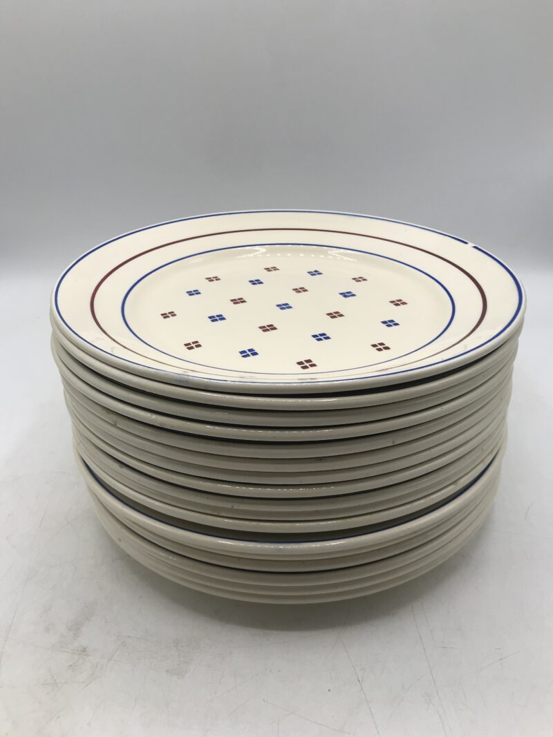 Service 17 assiettes plates « Madeleine » Lunéville K&G. Magnifique service que je décompose en plusieurs lots pour que tout le monde y trouve son compte. N’hésitez donc pas à regarder les autres annonces. Ce lot concerne 17 assiettes plates. Elles ont un diamètre de 23 cm pour une hauteur de 2,5 cm. A noter 1 assiette porte un petit éclat (cf photo), mais le service est en bon état général. La collection « Madeleine » est superbe, de jolis décors graphiques sont posés au centre et trois liserés tournent sur les bords des assiettes. Avec sa couleur crème mélangée aux couleurs bleu et rouge des décorations, c’est un pari gagné pour le coté design. Très belles pièces de vaisselles anciennes qui apporteront de cachet à vos tables. Surprenez vos invités. Le charme du MADE IN FRANCE.