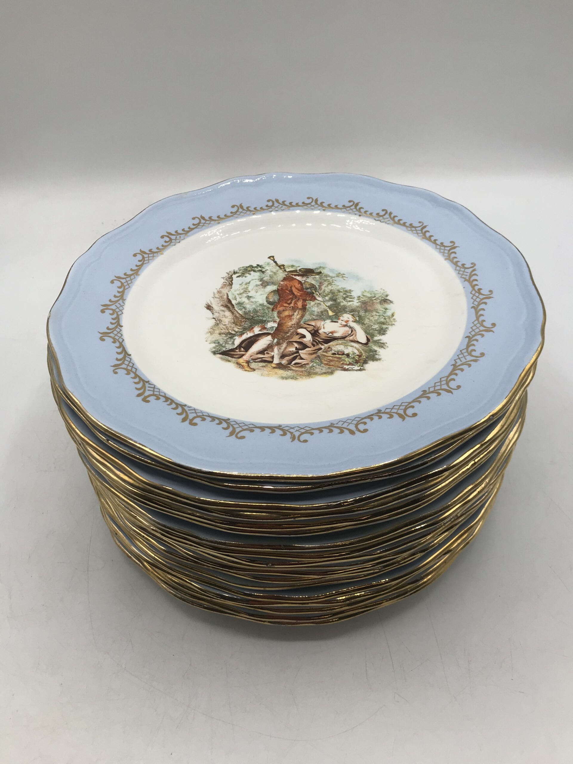 Ce lot est composé de 18 assiettes plates anciennes de diamètre 24 cm pour une hauteur de 2 cm. Elles sont signées L’Amandinoise, elles sont en bon état mais présentent des marques du passé, petite patine et usure sur les dorure (cf photos).