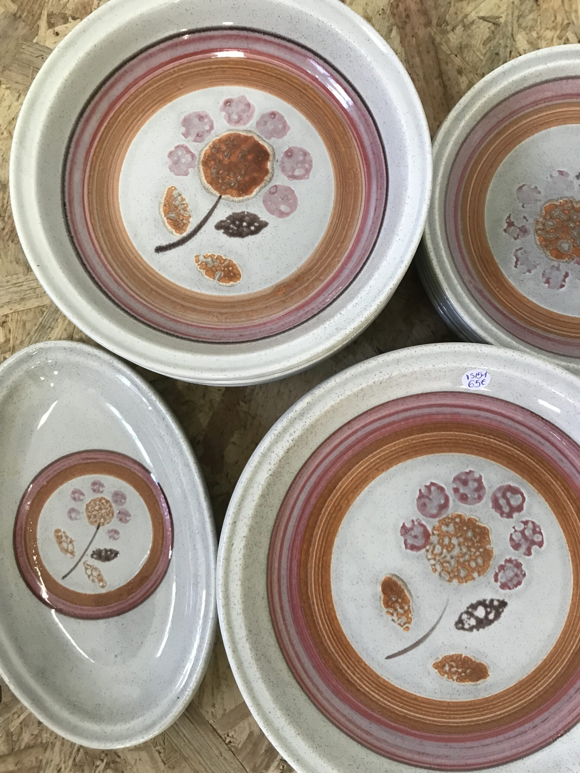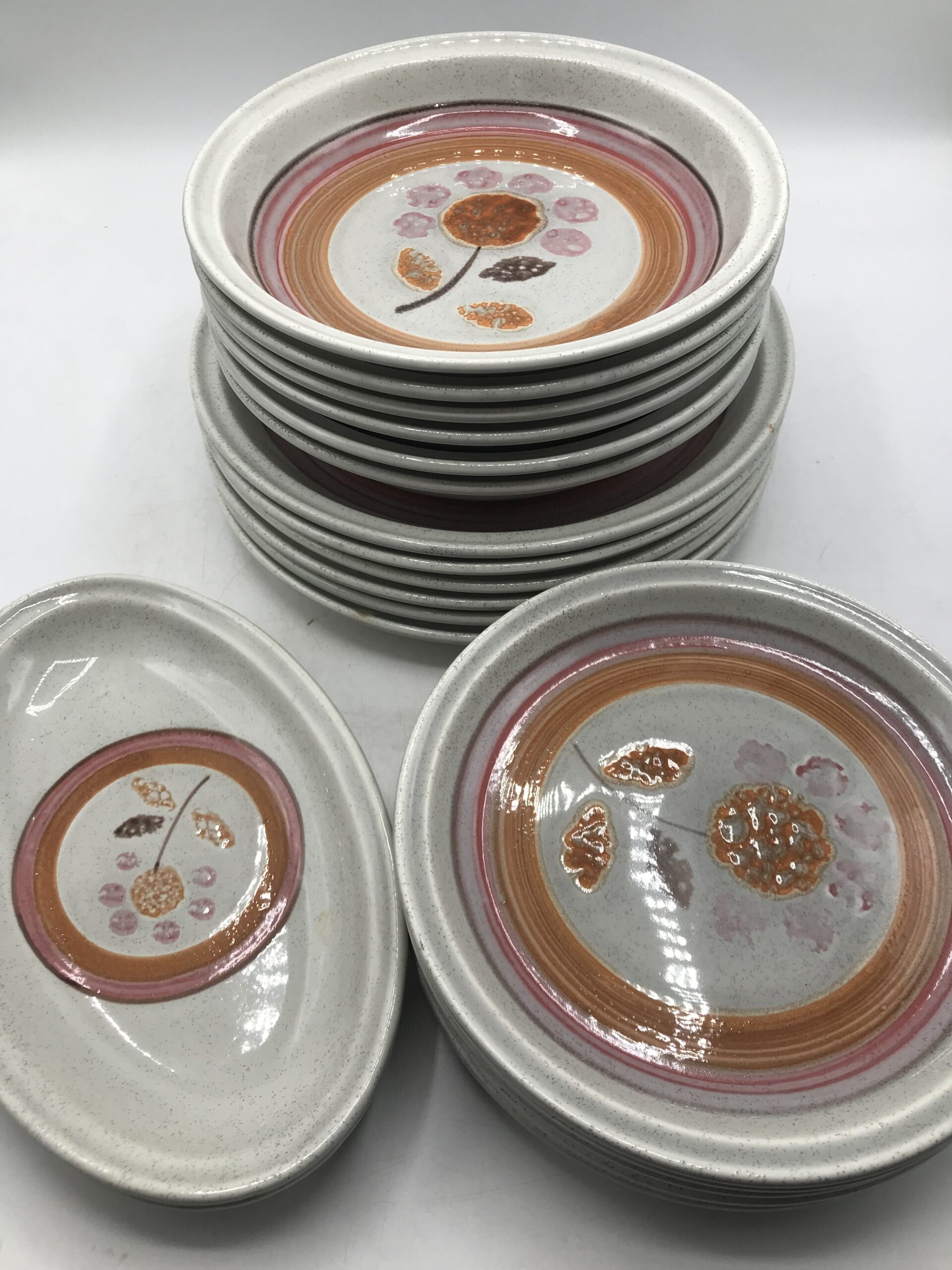 Service 19 pièces L’Ateliers d’art du Revernay France. Splendide service plein de douceur. Le service est composé de 6 assiettes plates, 2 coupelles ovales, 5 assiettes à desserts et de 6 assiettes creuses. Les assiettes plates ont un diamètre de 25 cm pour une hauteur de 3 cm. A noter une porte un tout petit éclat ( cf photo). Nou avons également 2 petites coupelles ovales de taille 23X15X3 cm. Pour compléter ce service nous avons aussi 5 assiettes à desserts de diamètre 20 cm pour une hauteur de 2,5 cm, à noter une porte un petit éclat ( cf photo). Et pour finir 6 assiettes creuses de diamètre 21,5 cm pour une hauteur de 4 cm. Ce service joue sur les couleurs pastels de rose, d’oranger et de marron. Ses décors sont floraux. Une belle note champêtre sur votre table.