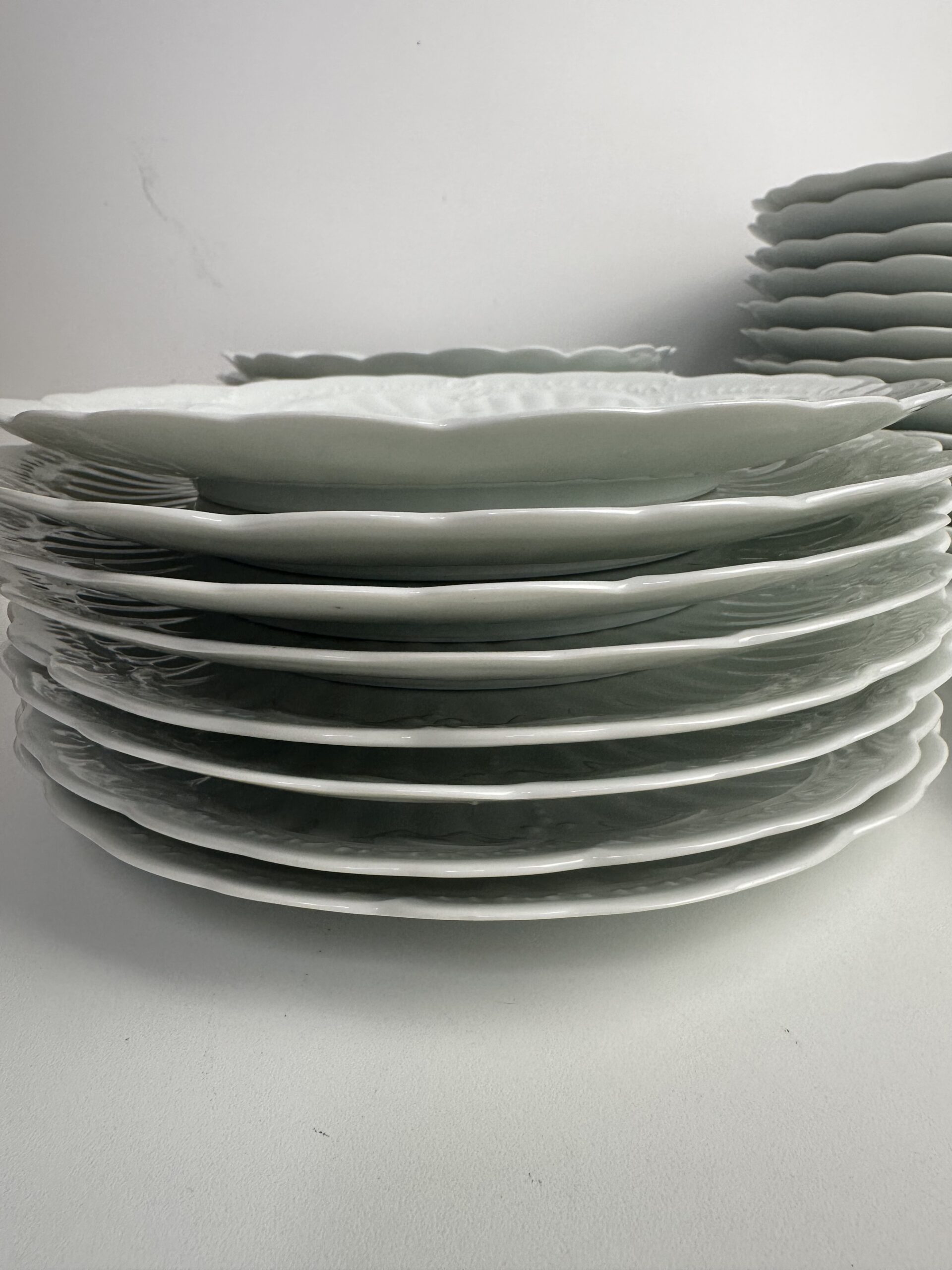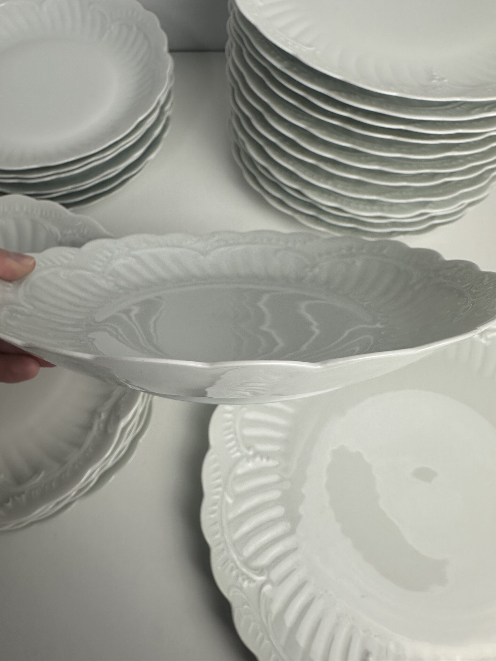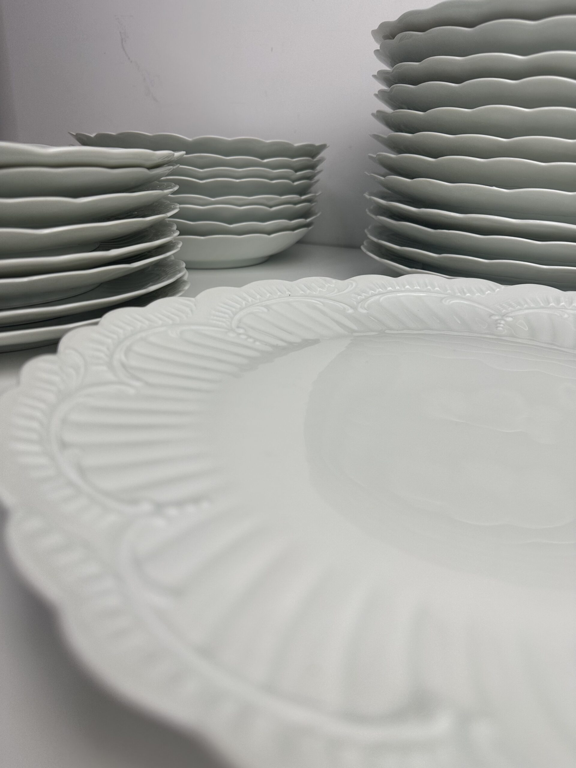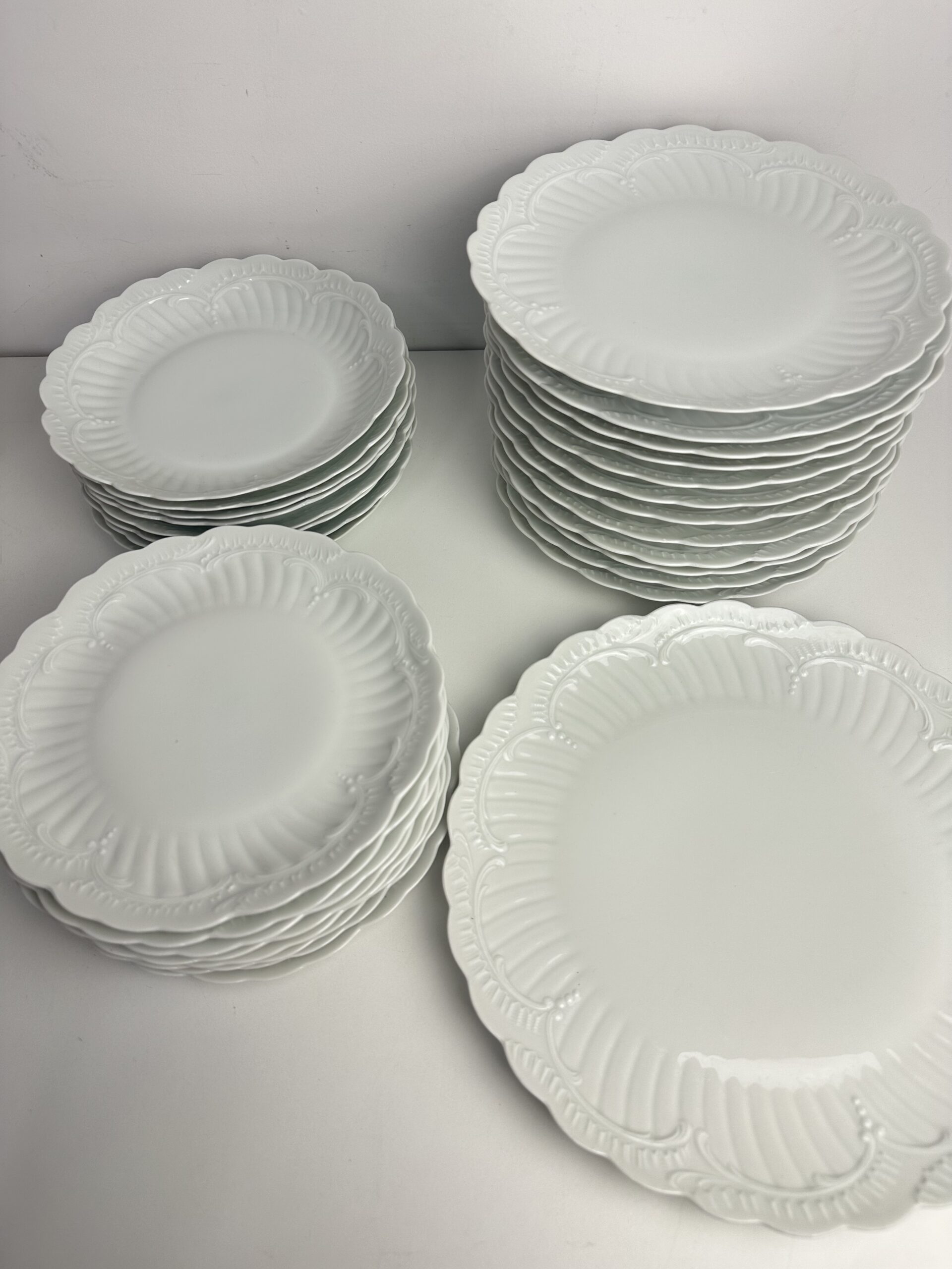IL s’agit d’un modèle très simpliste Limoges. Les pièces sont toutes en porcelaine blanches. On retrouve les mêmes motifs délicats et légèrement en reliefs, qui ressemble à des moulures. Les assiettes et le plat ont les bords festonnés.
