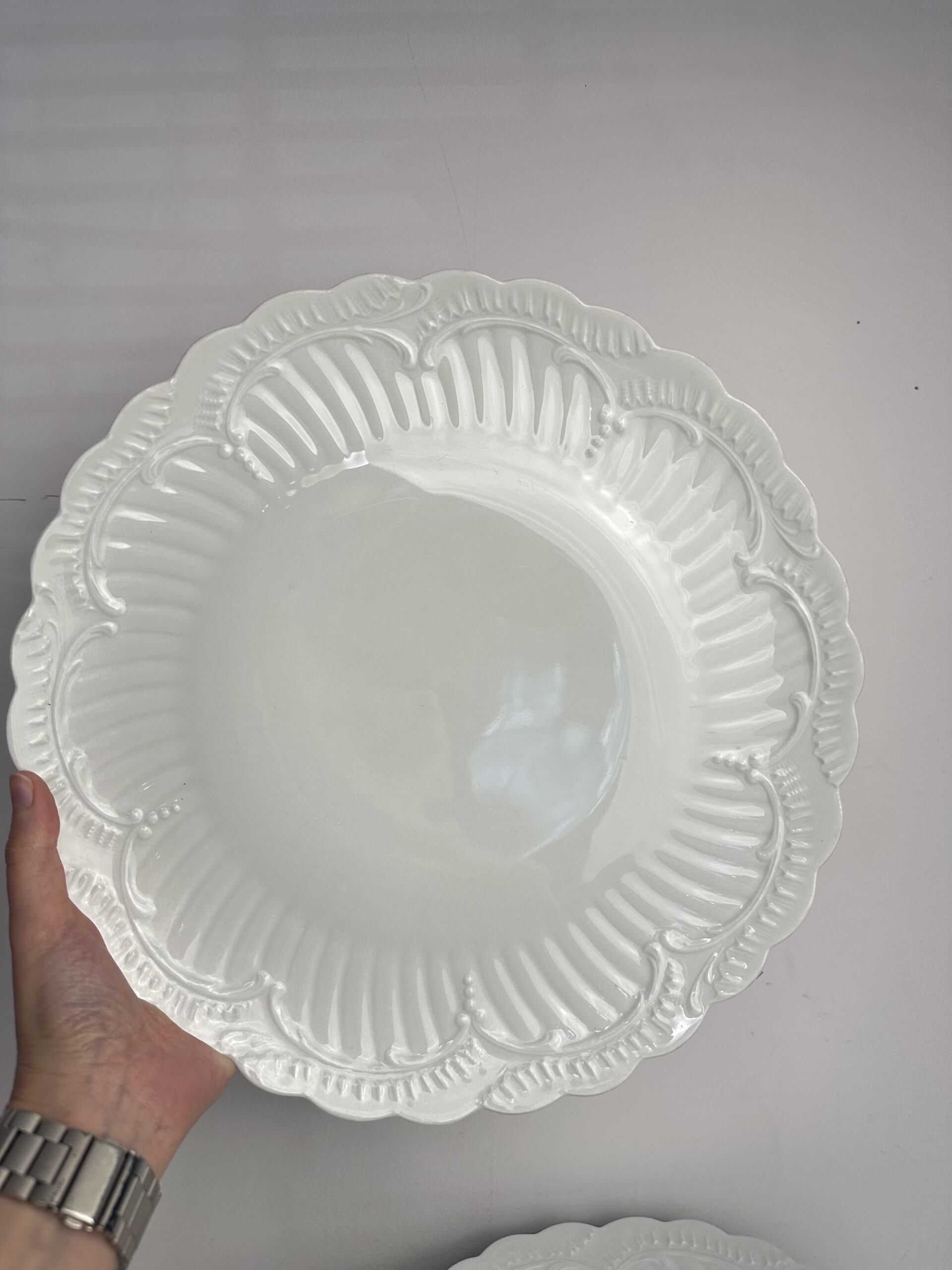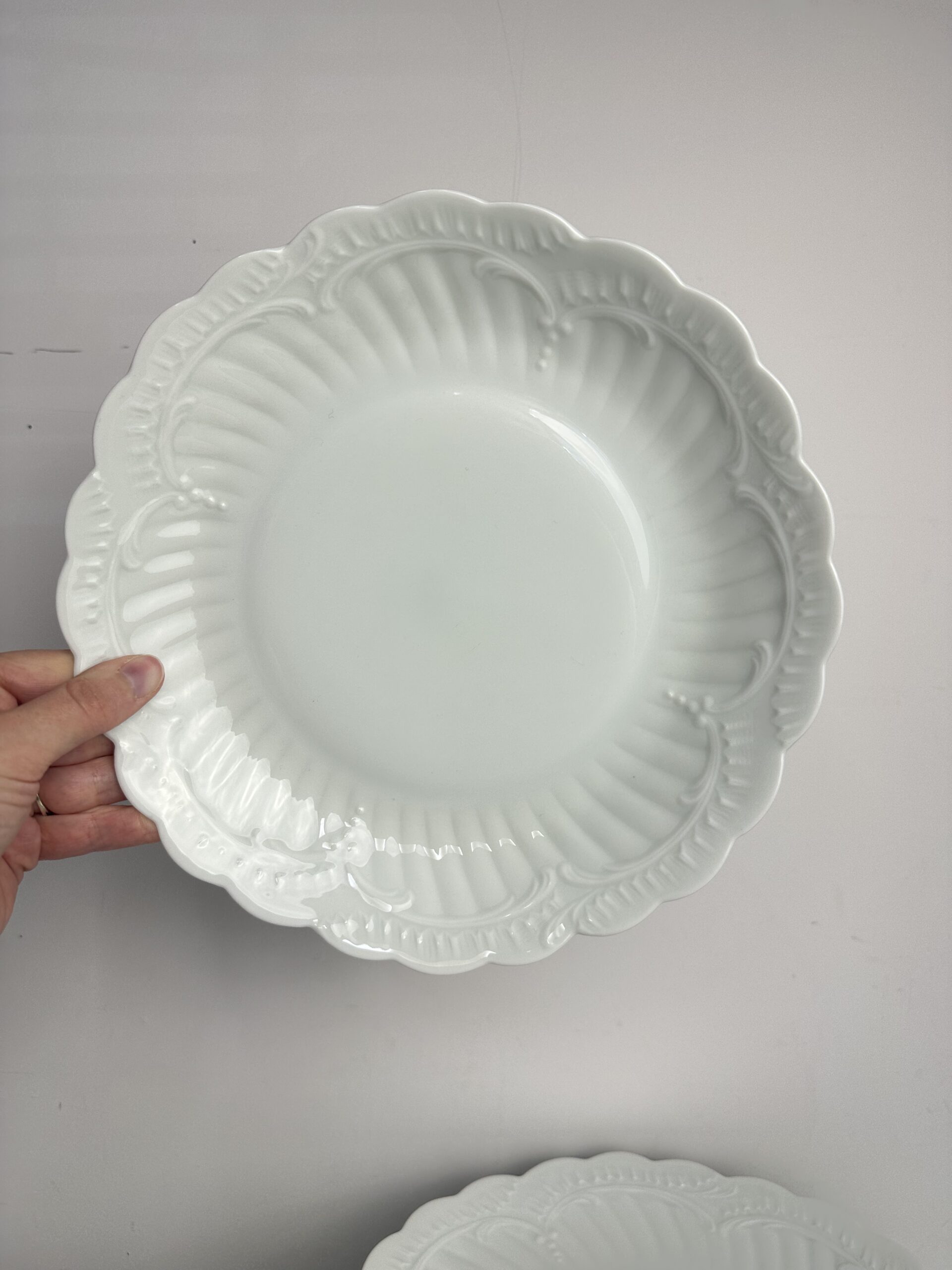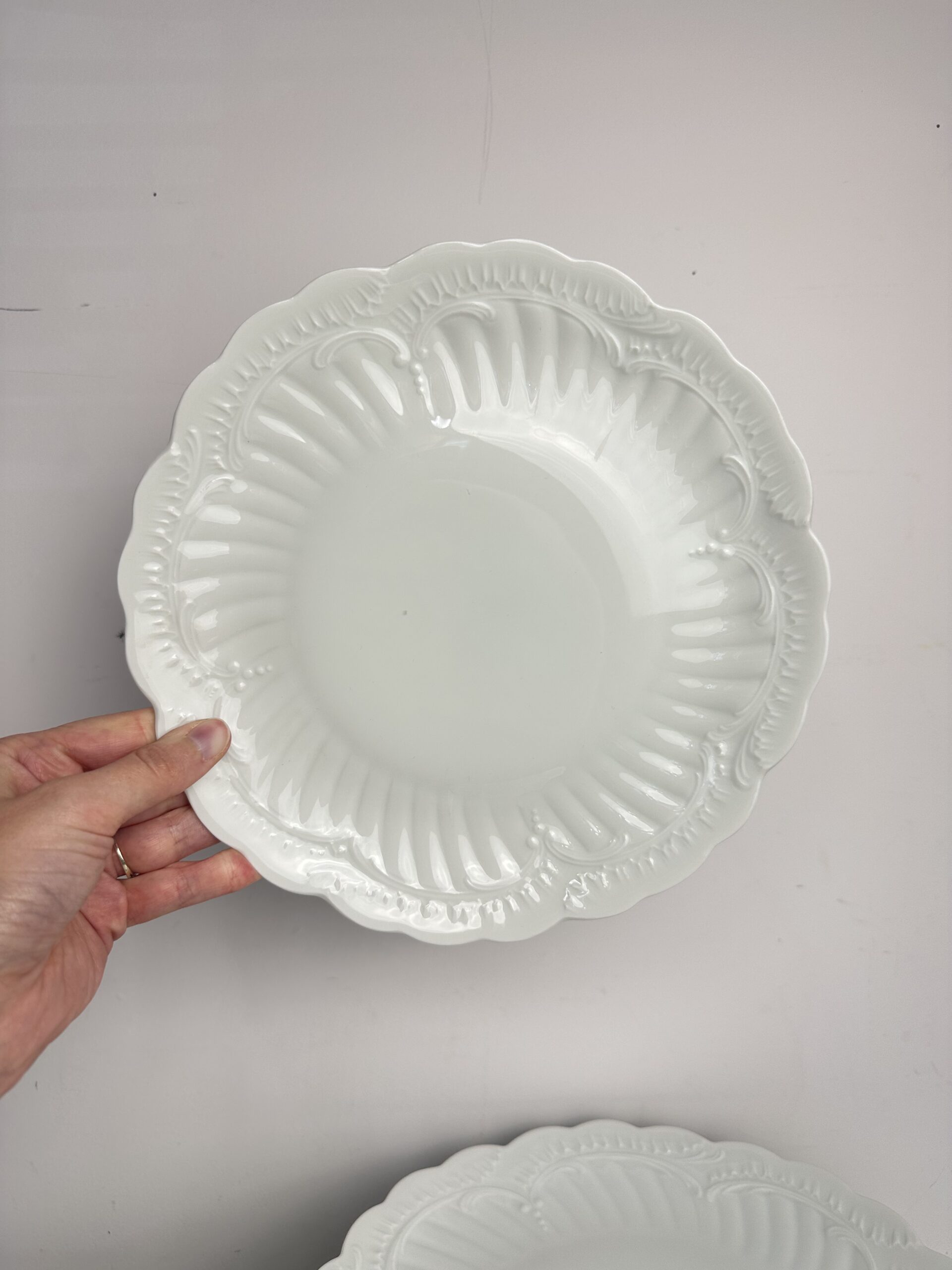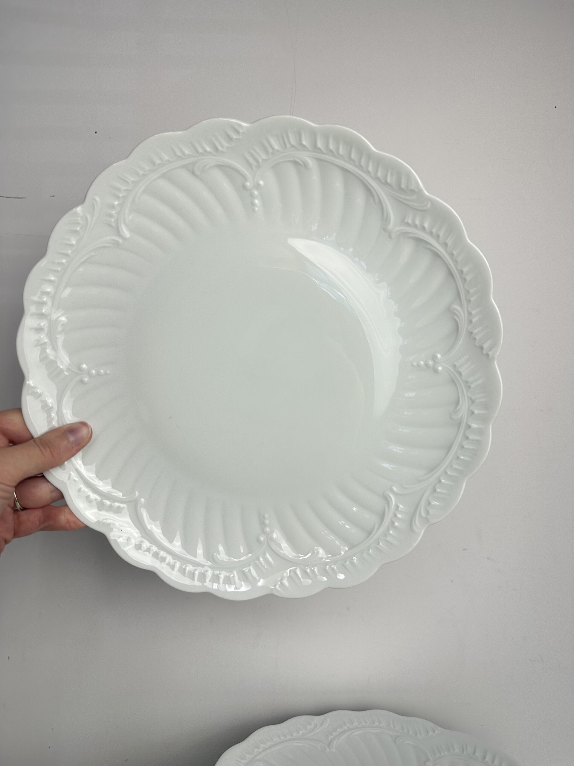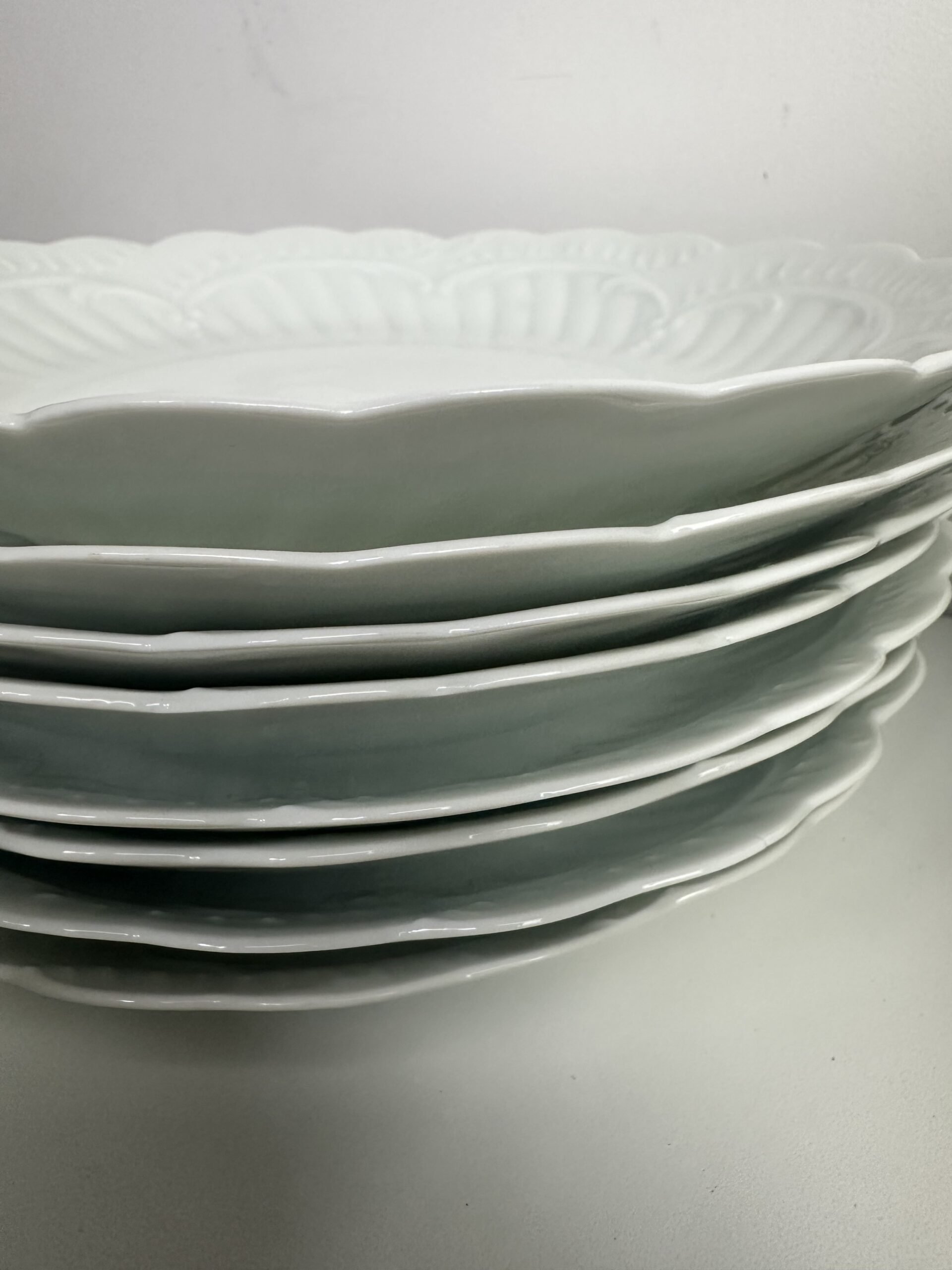 IL s’agit d’un modèle très simpliste Limoges. Les pièces sont toutes en porcelaine blanches. On retrouve les mêmes motifs délicats et légèrement en reliefs, qui ressemble à des moulures. Les assiettes et le plat ont les bords festonnés.