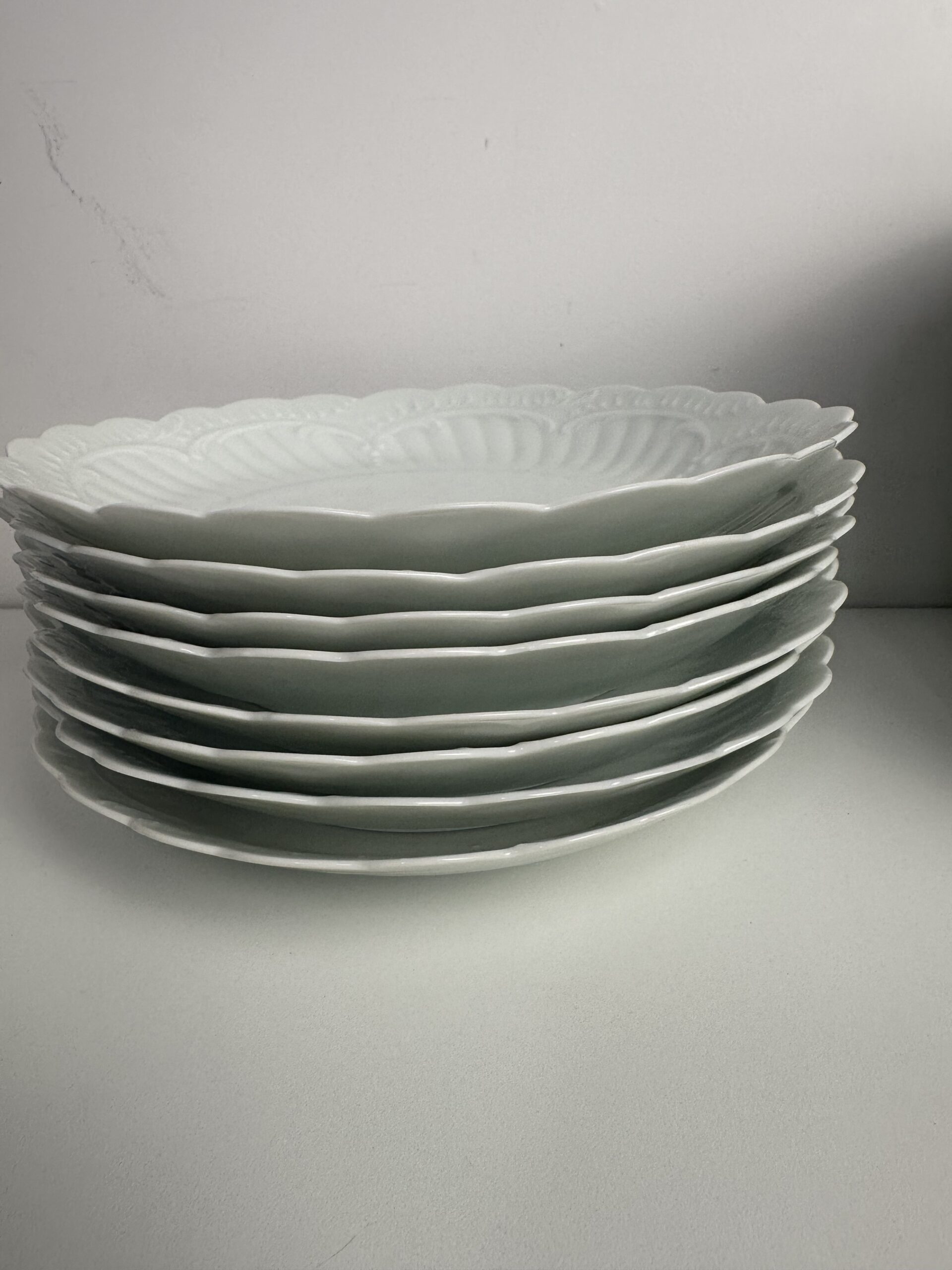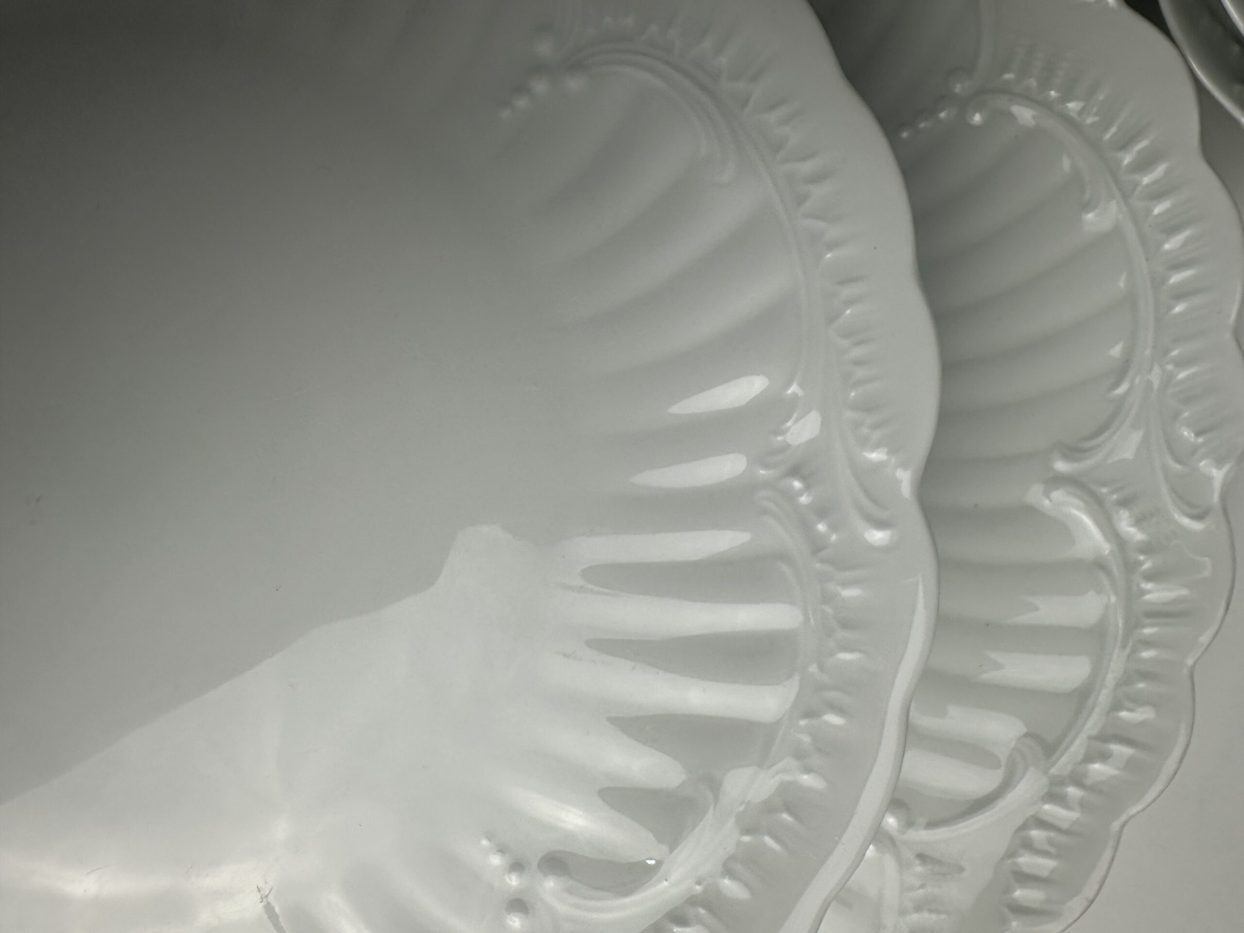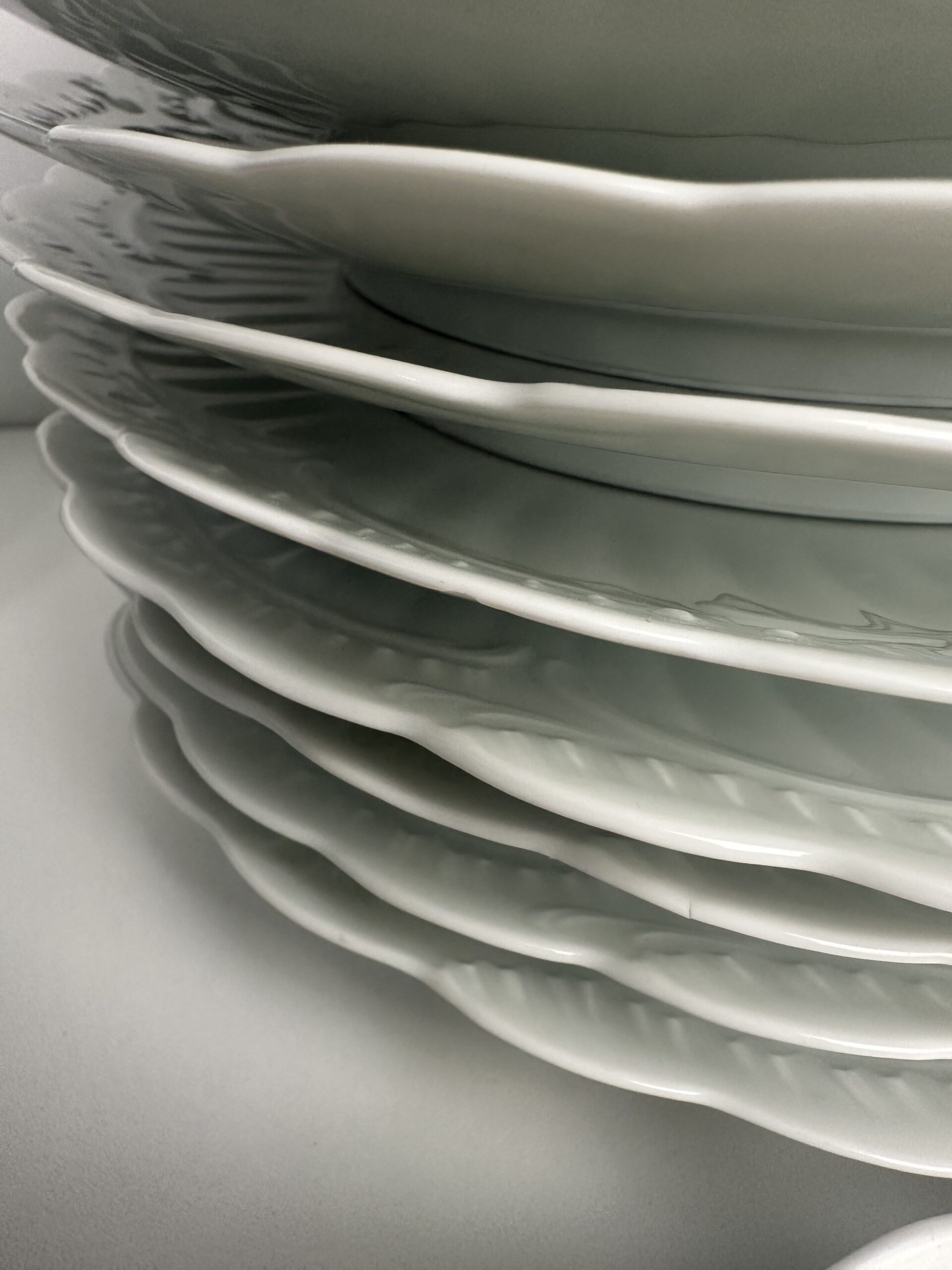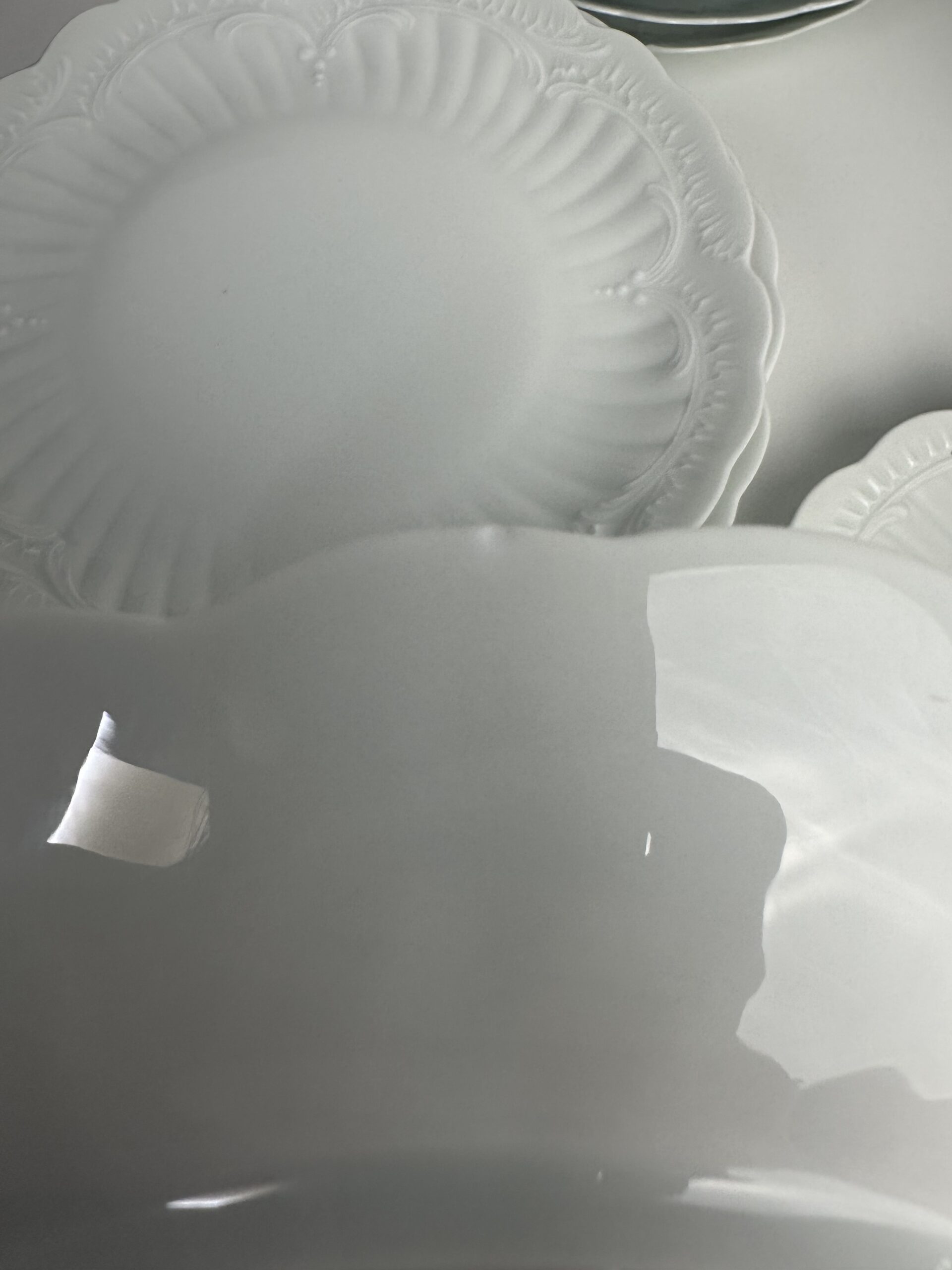IL s’agit d’un modèle très simpliste Limoges. Les pièces sont toutes en porcelaine blanches. On retrouve les mêmes motifs délicats et légèrement en reliefs, qui ressemble à des moulures. Les assiettes et le plat ont les bords festonnés.