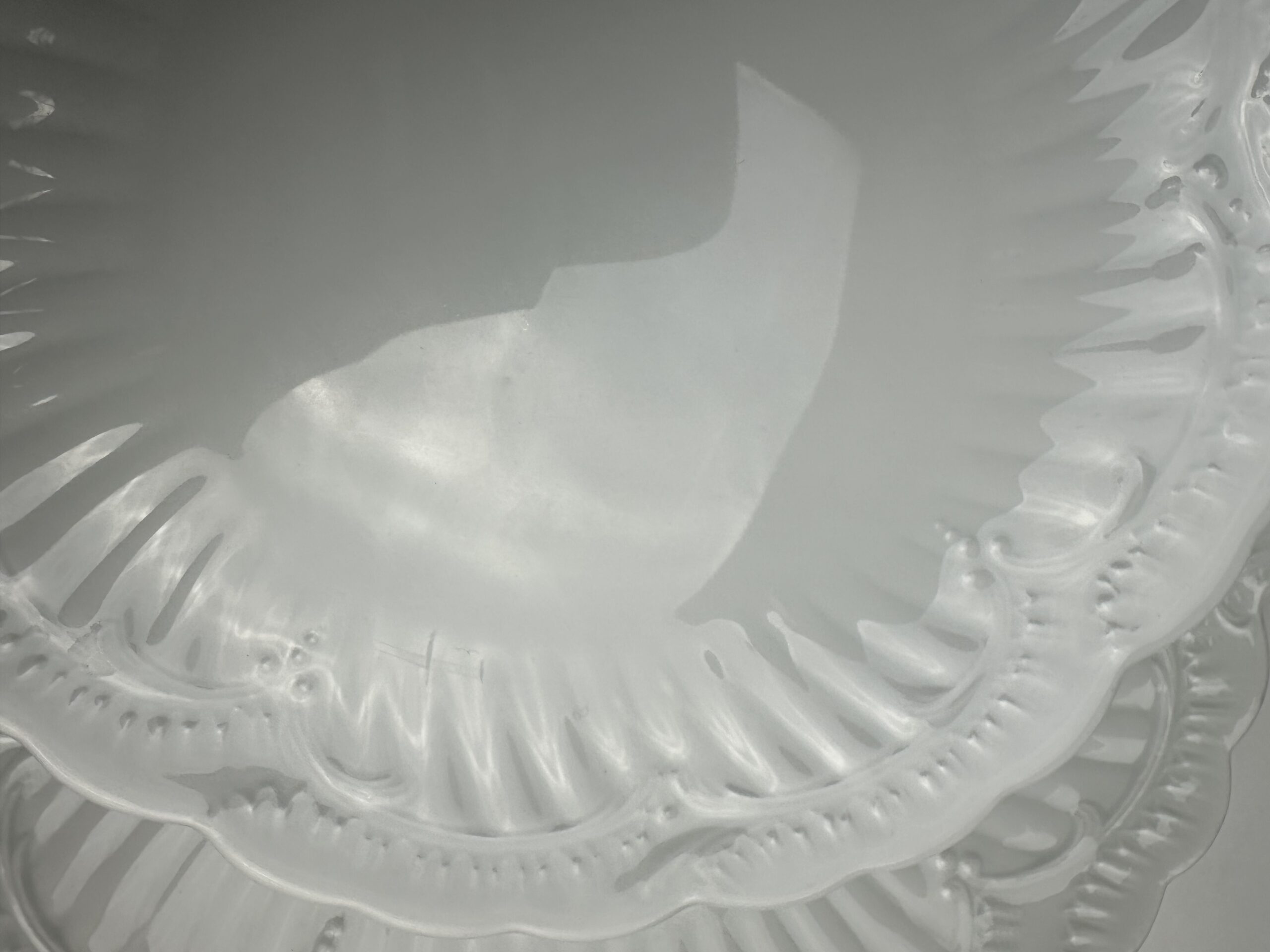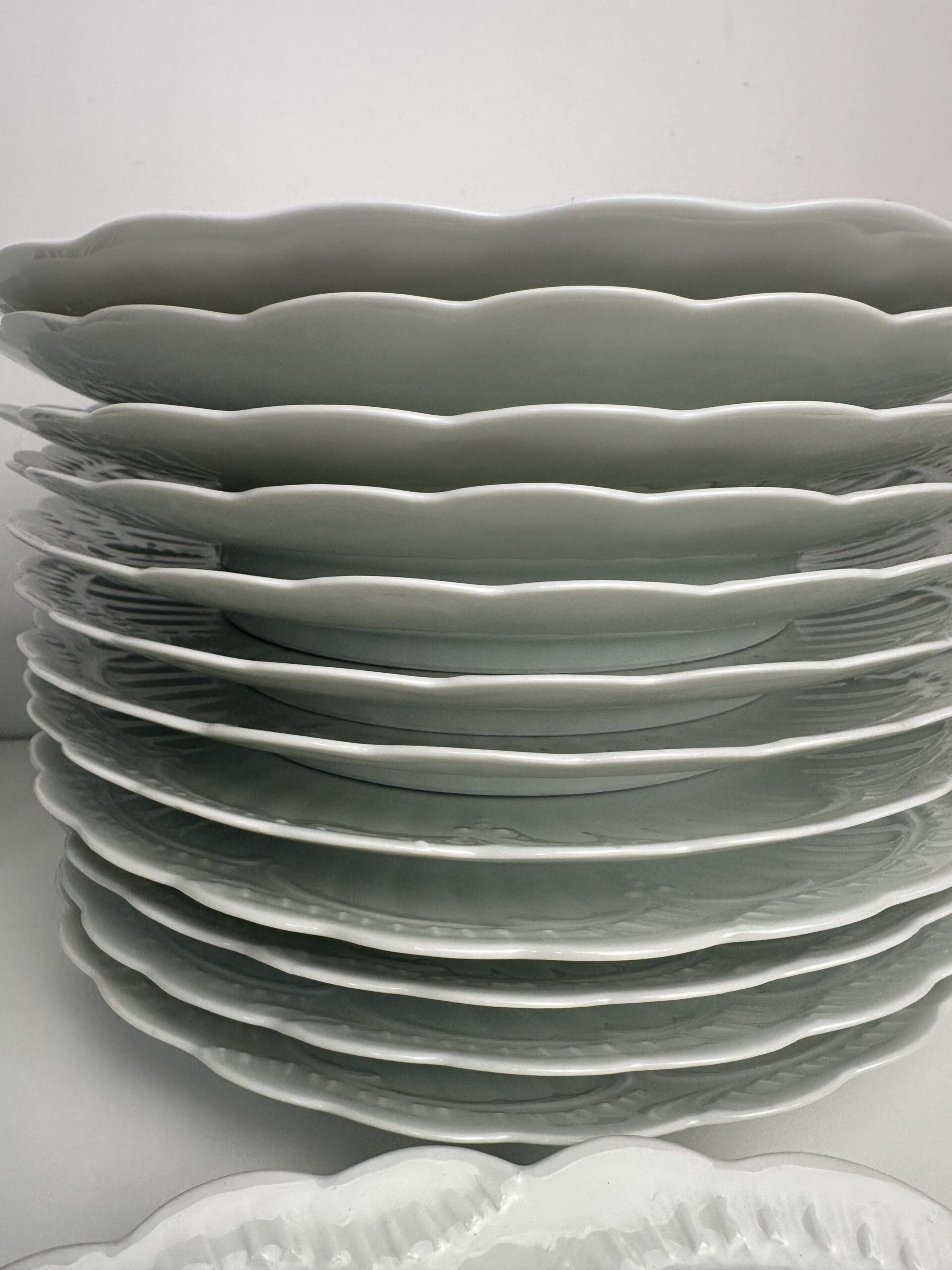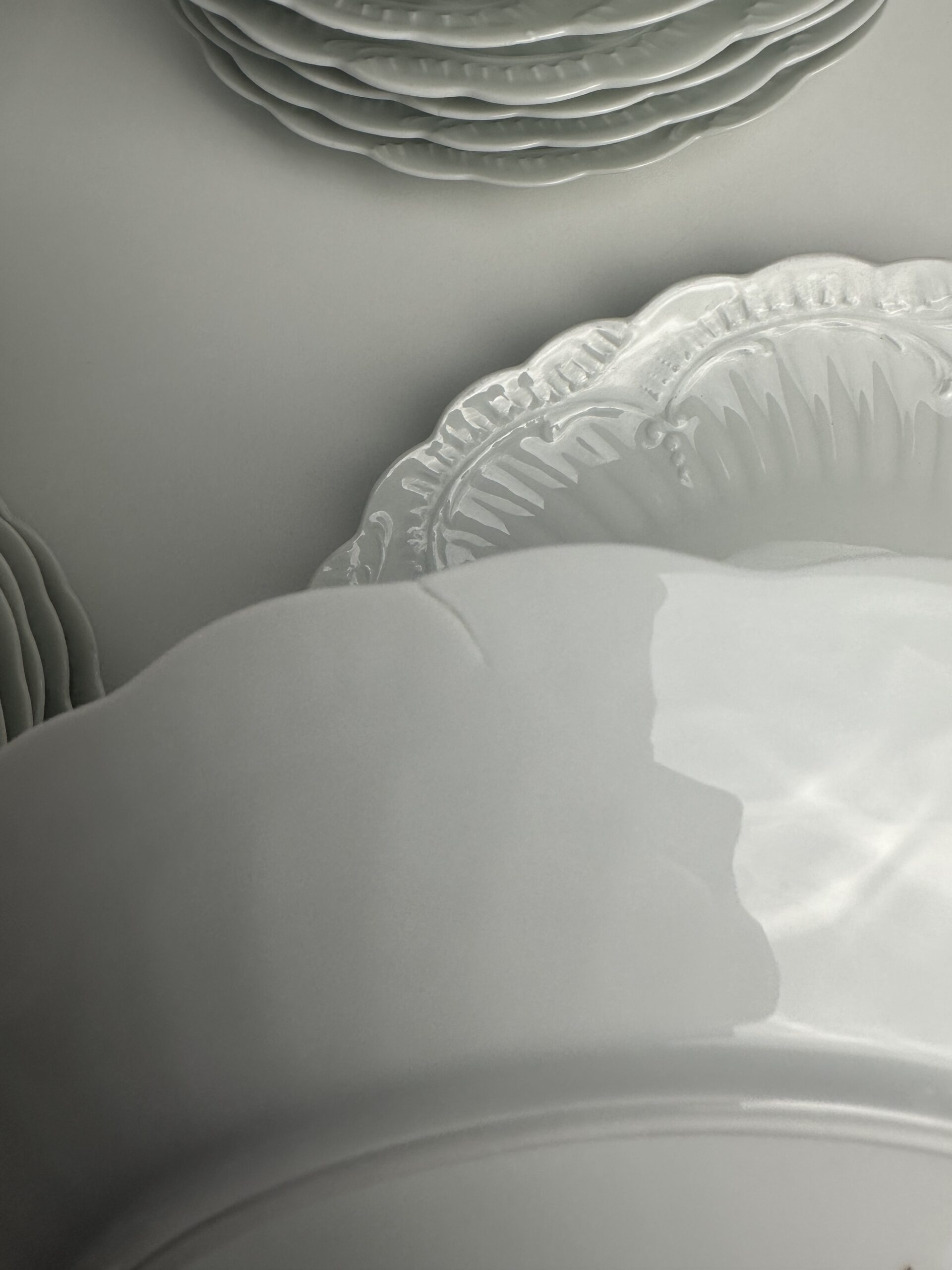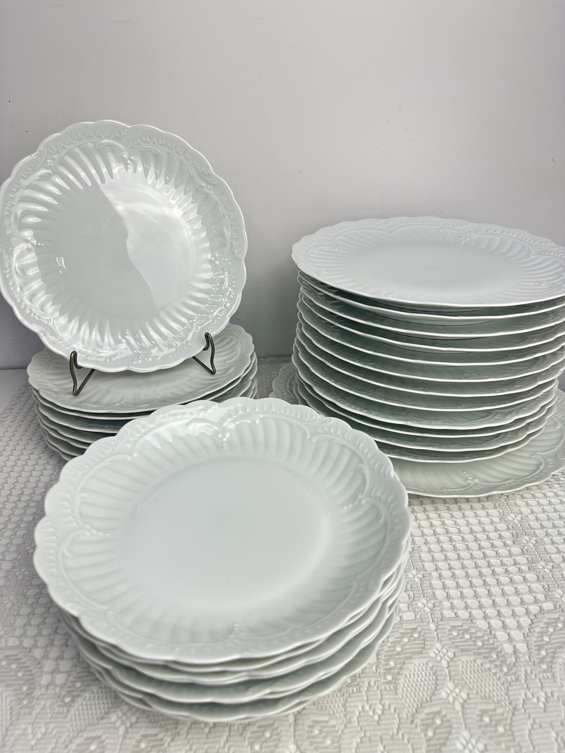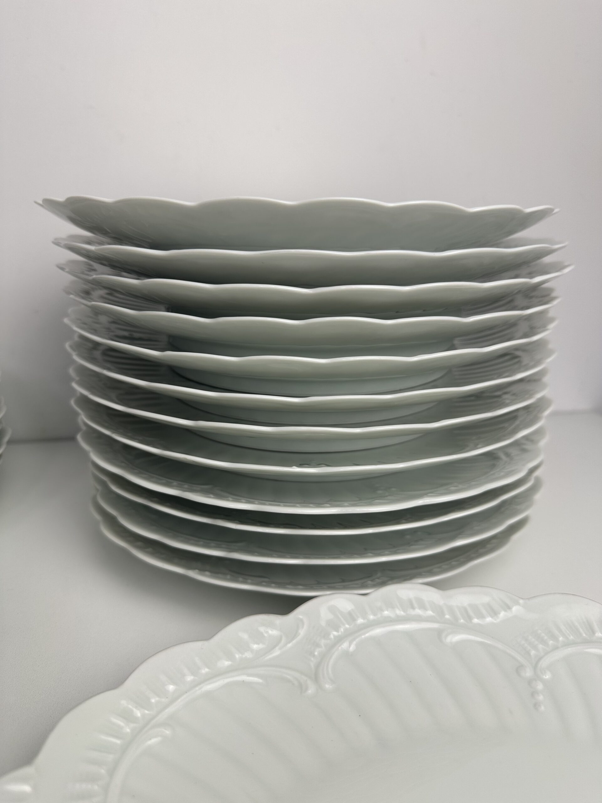 IL s’agit d’un modèle très simpliste Limoges. Les pièces sont toutes en porcelaine blanches. On retrouve les mêmes motifs délicats et légèrement en reliefs, qui ressemble à des moulures. Les assiettes et le plat ont les bords festonnés.