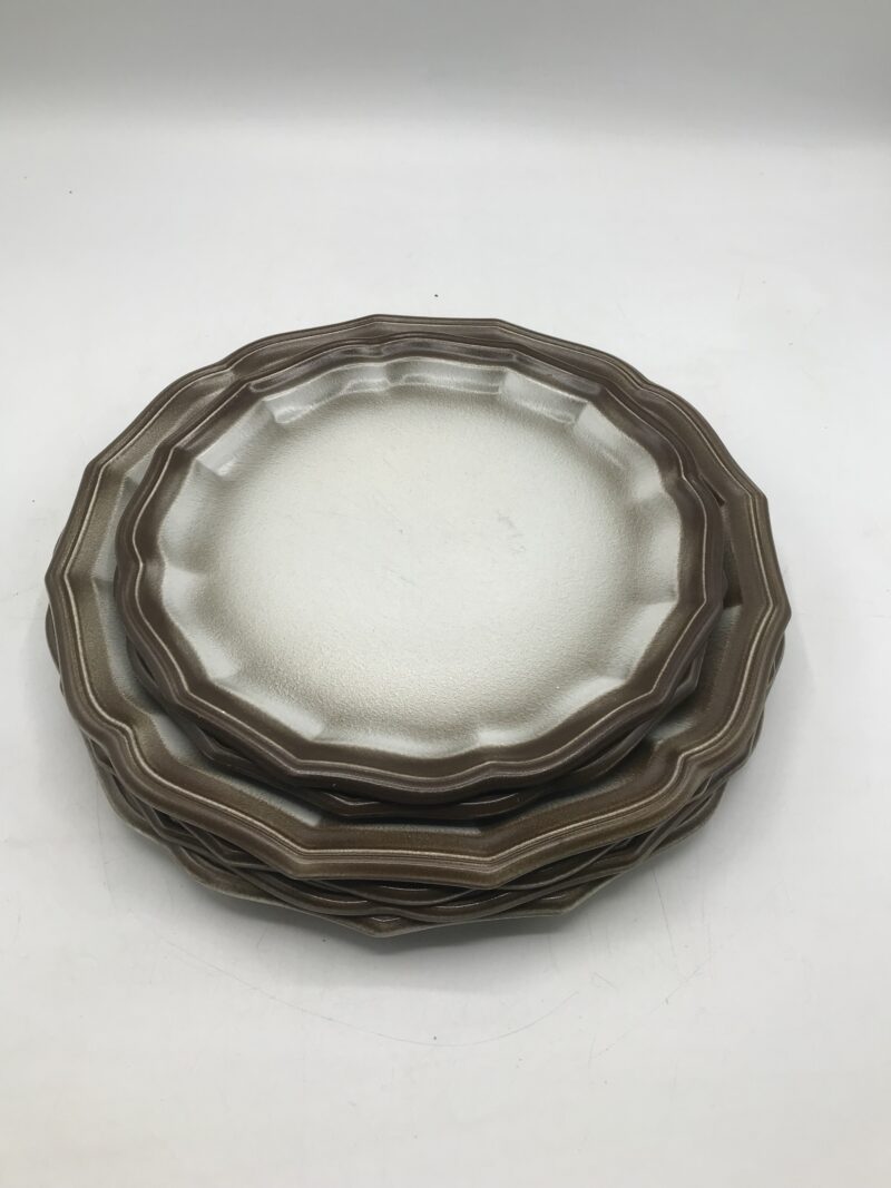 Superbe service de chez Salins France. Il est composé de 4 grandes assiettes de diamètre 25,5 cm et de hauteur 2 cm. Et de 2 petites assiettes de diamètre 20,5 cm pour une hauteur de 1,5 cm. L’ensemble est en bon état, il porte des traces du temps mais pas d’éclats à signaler. Ce service est de couleur marron glacé et écru. Une vraie touche vintage à votre table. L’effet sera réussi à coup sur. Avec ces assiettes un bon dans le temps est garanti.