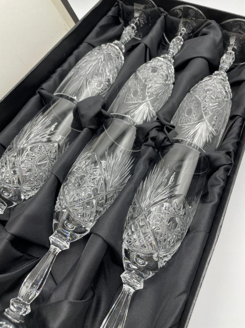 Magnifique coffret de 6 flûtes à champagne en cristal de Baccarat signé BERTRICHAMPS Valéry KLEIN. Chaque flûte est signée et le coffret présente quelques traces d’usure sur le couvercle sans qu cela n’affecte le produit (cf photos). Les flûtes sont ciselées avec un motif de soleil. Véritables œuvres d’art.