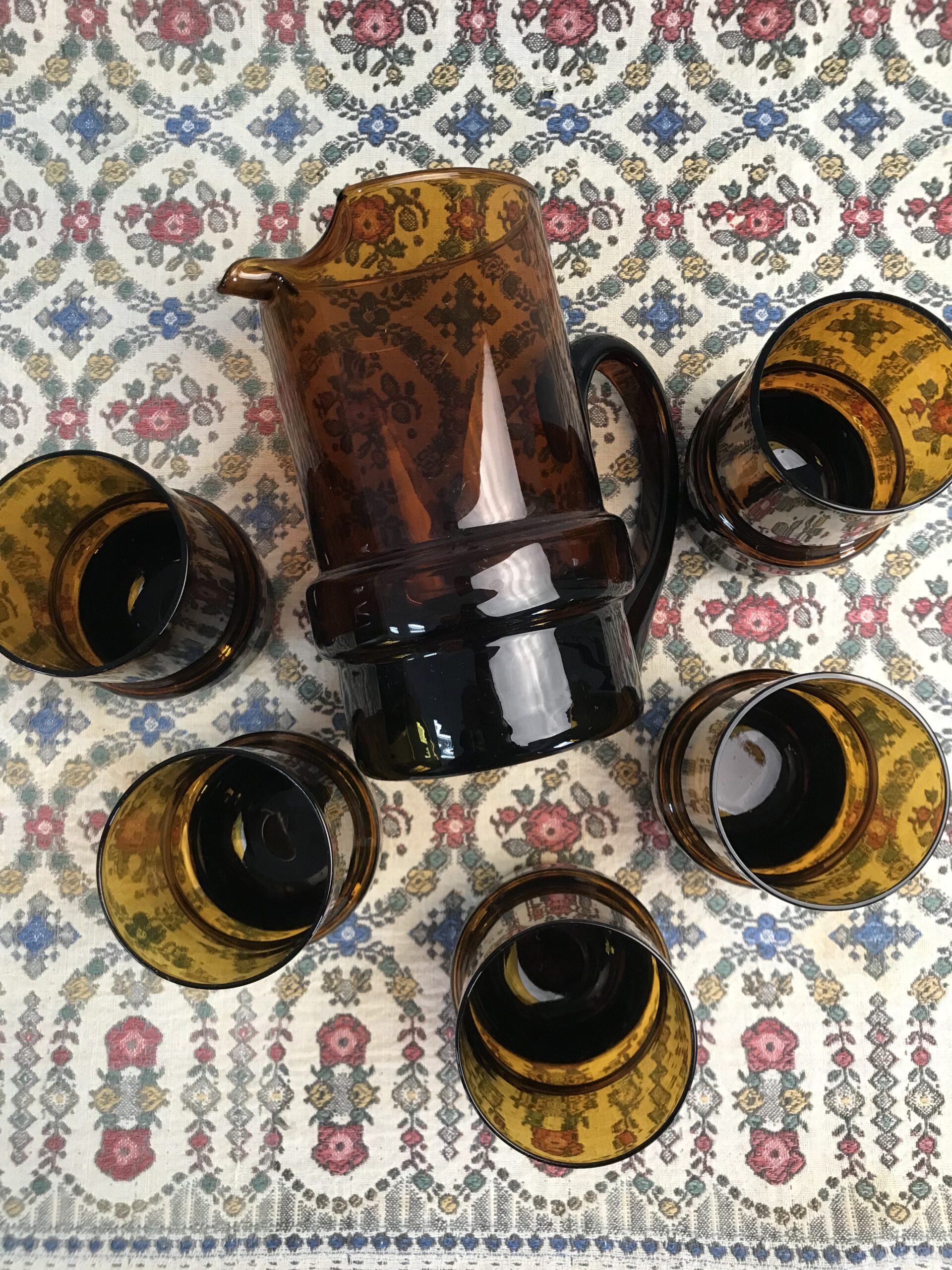 Service 6 pièces orangeade ambré années 60. Ce service est composé d’un pichet d’un diamètre de 11 cm pour une hauteur de 19 cm. Et de 5 verres de diamètre 7 cm pour une hauteur de 13 cm. Le pichet a un bec verseur magnifique le verre est ourlé. Les verres ont une bague plus large au niveau de la prise en main ce qui est fort agréable, pas de souci de casse. Le tout est de couleur ambrée avec une nuance sur le bas des pièces ce qui lui donne une couleur chocolat. Très joli ensemble pour cet été, apporter un coté vintage sur vos table au moment des rafraichissements. Le service est en parfait état.
