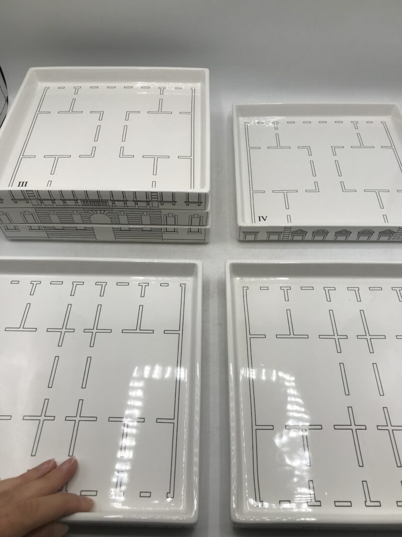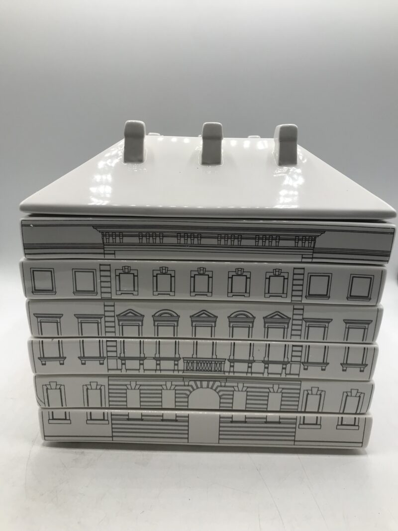 Alerte pépite !!!!! Service 7 pièces PALACE design Selab/Alessandro Zambelli. Magnifique service Flate plate Palace La linéa The range. Ce service est composé de 5 assiettes de forme carré de taille 22,5X22,5X3 cm. Et d’un coupelle de taille 22,5X22,5×6,5 cm. Le service est neuf dans son emballage d’origine. Une vraie merveille les assiettes empilées représente un beau monument architecturale. Le toit, qui est la coupelle vient finir cet ensemble. Une très belle idée cadeau, ou tout simplement pour soi. Ce service ne manquera pas de surprendre vos convives. Place à l’étonnement.