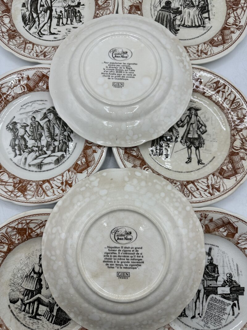 Pour tous les chineurs, collectionneurs de Gien et passionnés de vaisselle ancienne, service 8 assiettes Gien Réalisations Jean Nicot Histoires du tabac.