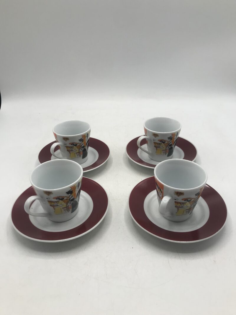 Le service est composé de 4 tasses avec leur sous tasse. Le tout est en très bon état rien a dire (cf photos). Les tasses ont un diamètre de 6 cm pour une hauteur de 6 cm.
