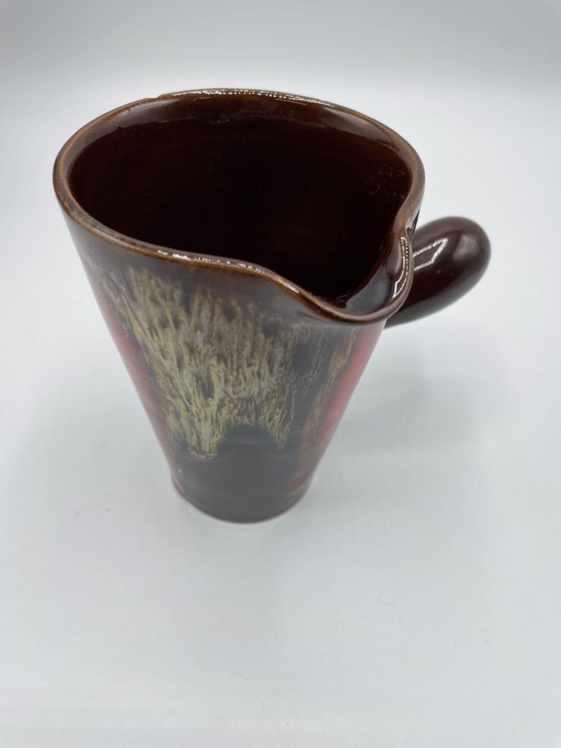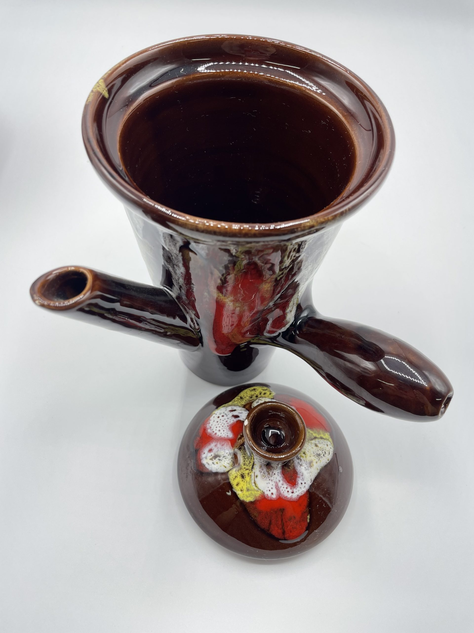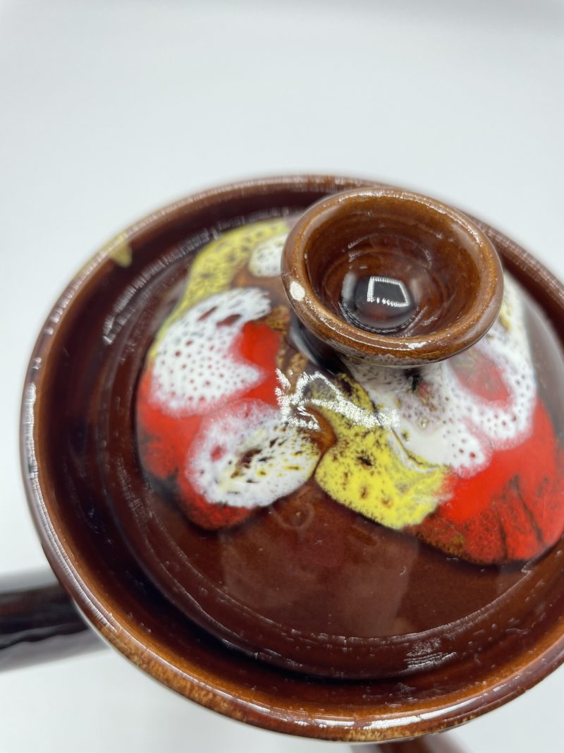 Ce joli service à café complet estampillé PETIT VALLAURIS est composé d’1 théière, d’1 pot à lait, d’1 sucrier, de 6 tasses et de 6 soucoupes assortis. Le service de couleur marron est décoré de jolis motifs rouges blancs et jaunes typiques de la vaisselle de Vallauris. Original et peu commun, le service a e jolies anses et poignées à l’effet arrondi pour une meilleure prise en main. Quelques traces et éclats sont à prévoir (cf photos) sans grande incidence sur l’aspect pratique et esthétique du service. Surprenez vos invités avec ce service atypique !