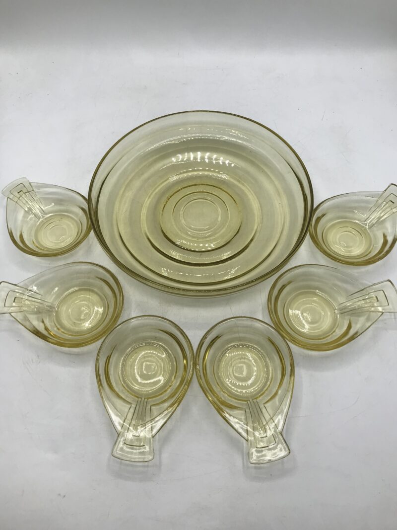 Service à fruits art déco jaune vintage. bel ensemble de couleur jaune. Il est composé d’un saladier de diamètre 24 cm pour une hauteur de 5,5 cm. Il est accompagné de 6 petites coupelles de forme ovale, à noter une a un éclat sur un bord ( cf photo). Un ensemble au design art déco avec ses formes géométriques. Un vent de fraicheur va souffler sur votre table, son jaune pep’s mettra en valeur vos mets. Le charme de la vaisselle atypique qui fait la différence au moment du service.
